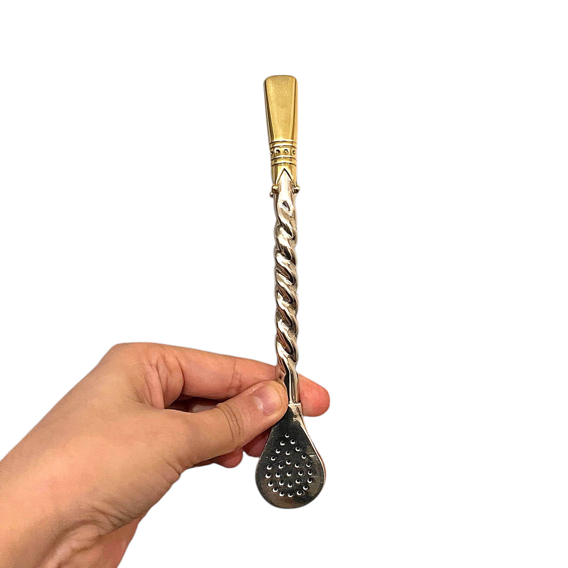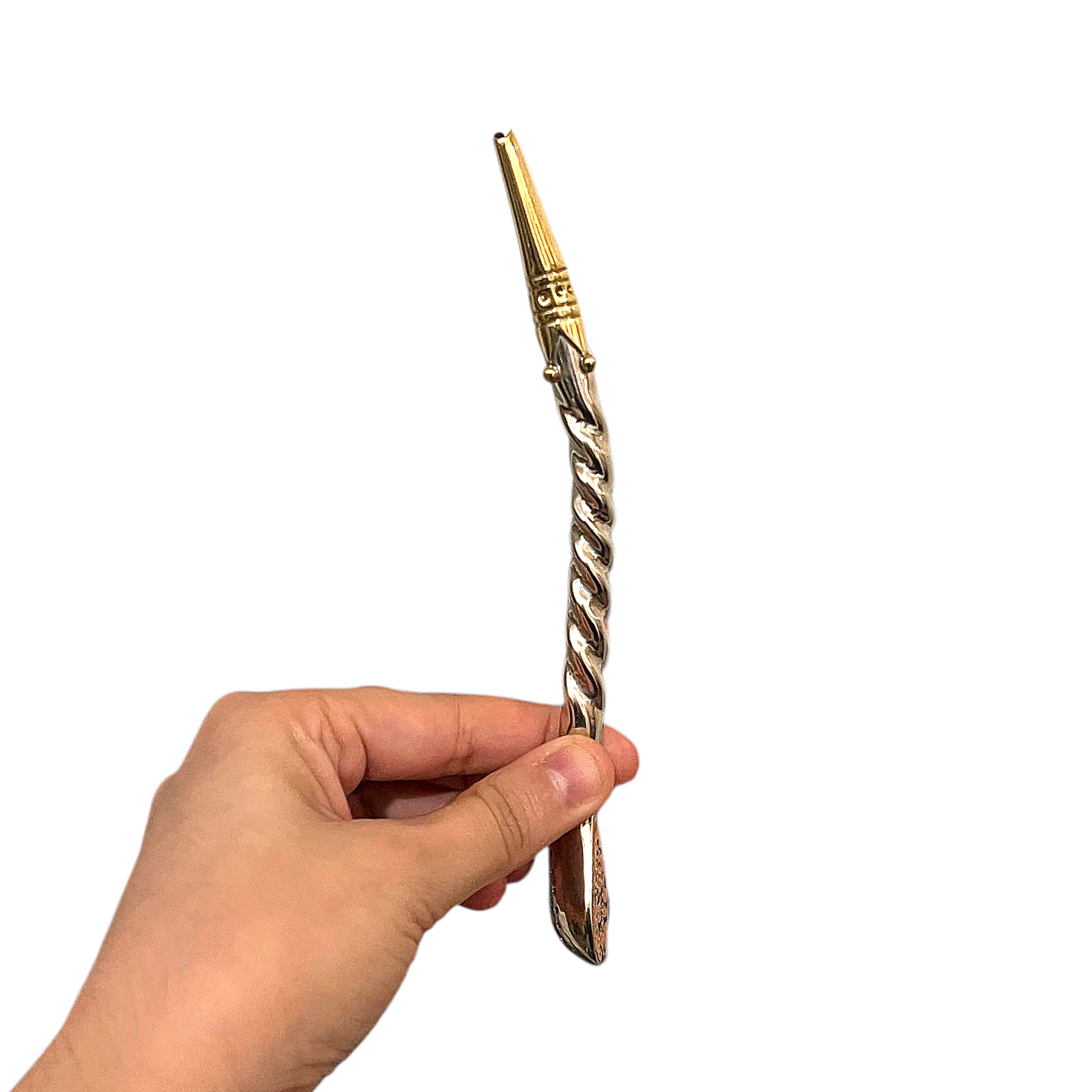 Its alpaca stem is shaped through twisting, creating a continuous braided pattern that adds depth and character to the piece while maintaining a refined visual lightness. This combination of braiding and mouthpiece decoration results in a refined bombilla that is both understated and expressive.