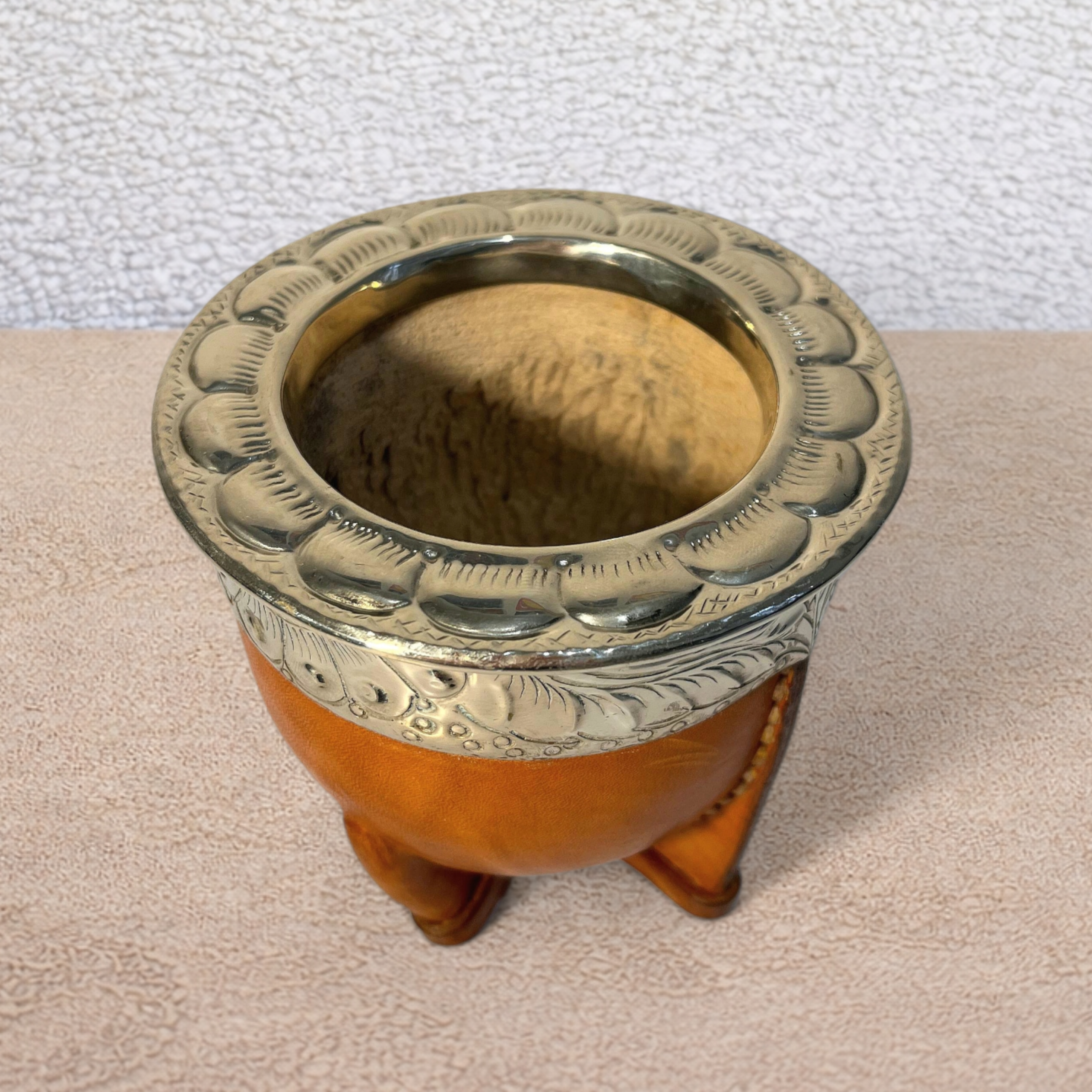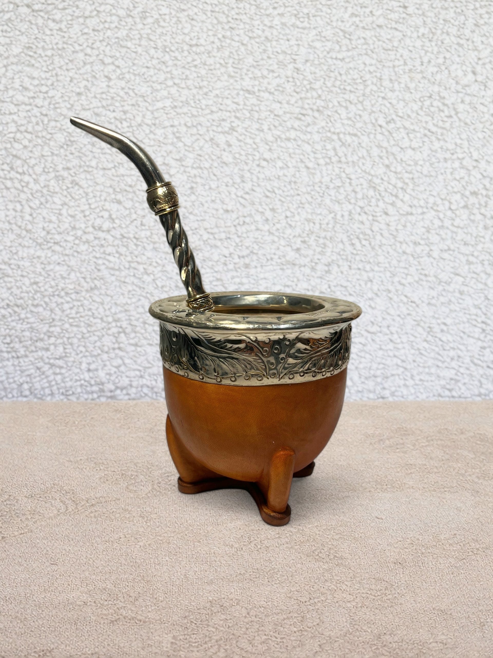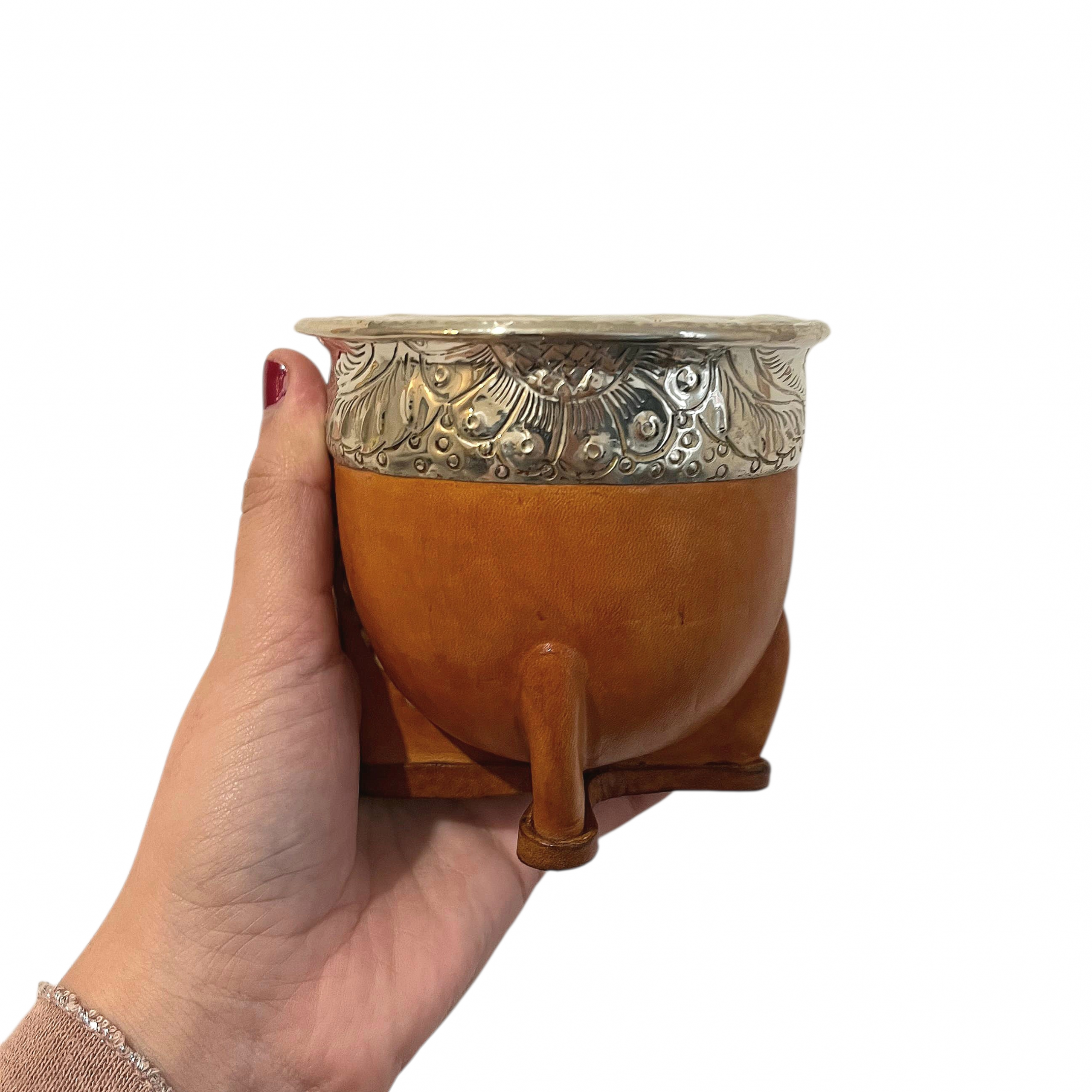 It is made from a carefully selected natural calabash mate gourd, then wrapped in premium camel leather with vegetable tanning. This natural tone highlights the lines of the gourd and gives it a style that is both authentic and refined. The alpaca virola completes the piece with a sober and traditional finish.