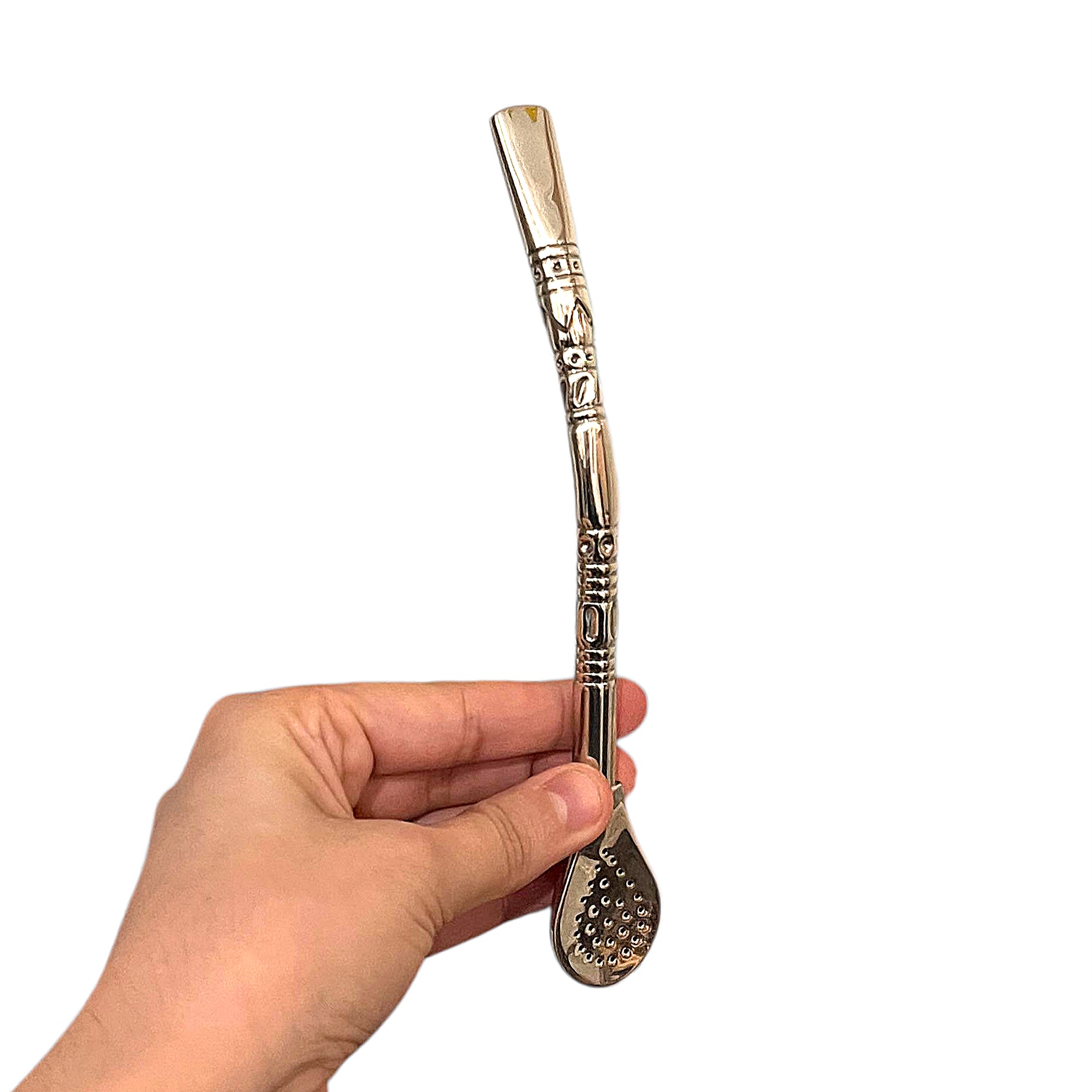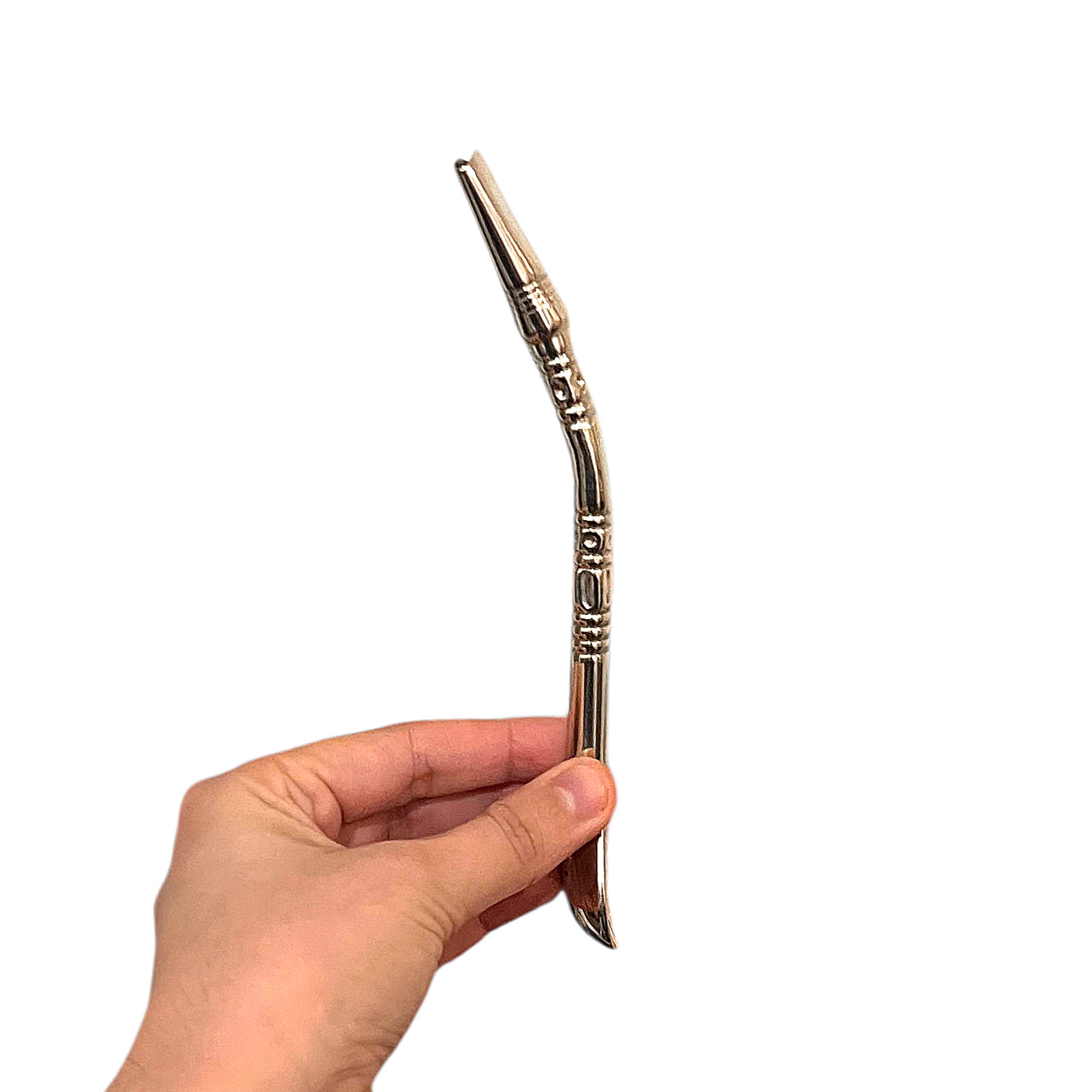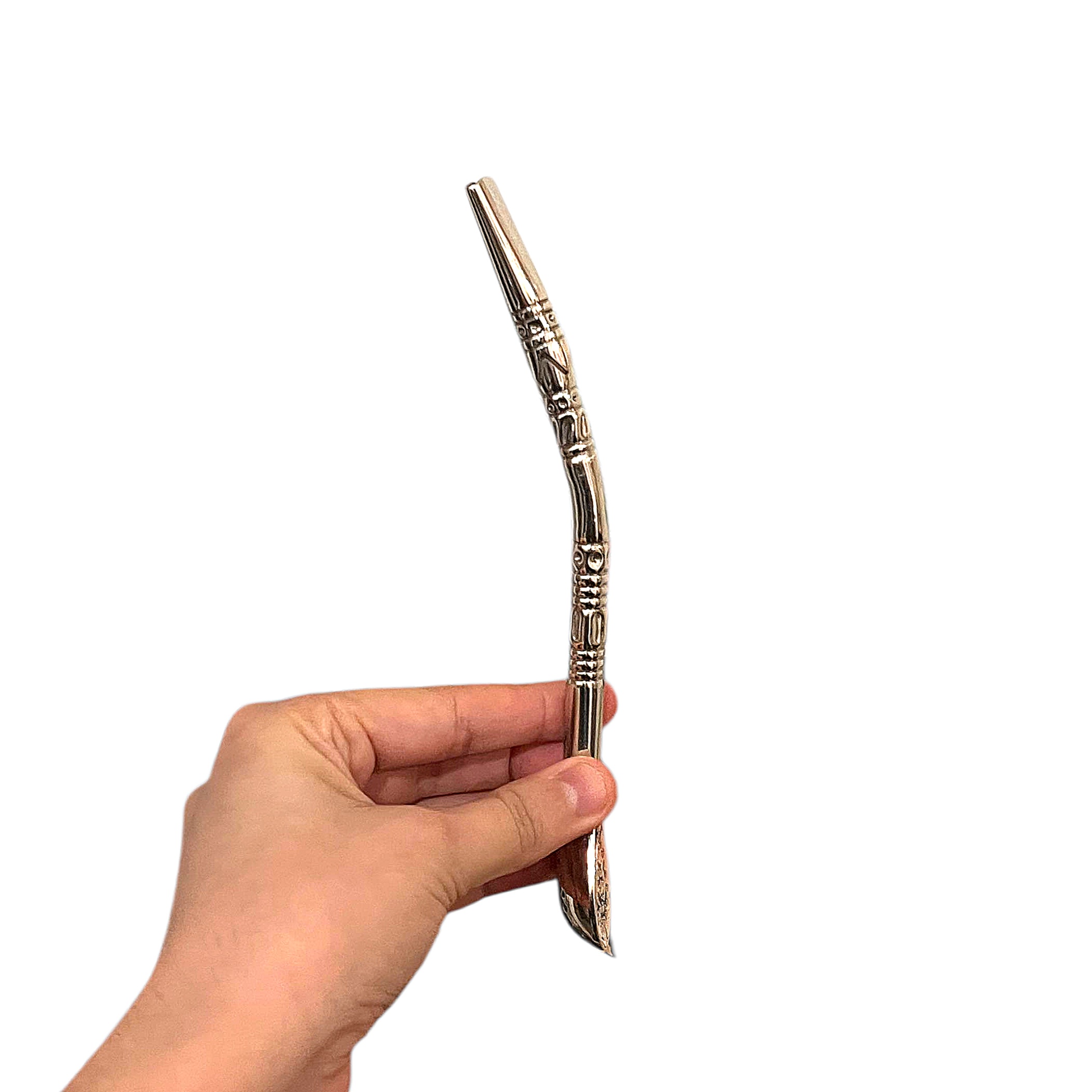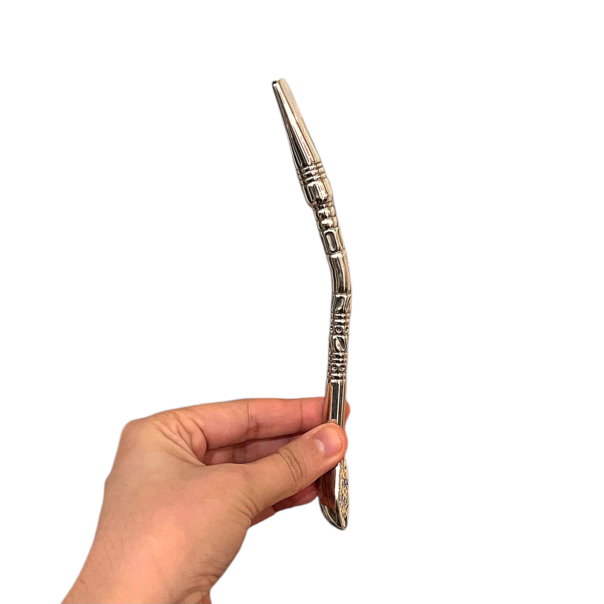 Realizada íntegramente en alpaca, una aleación reconocida por su solidez y durabilidad, esta bombilla ofrece una excelente resistencia al uso y una experiencia de degustación confortable. Su forma pico de rey garantiza una succión fluida y una filtración eficaz de la yerba mate.