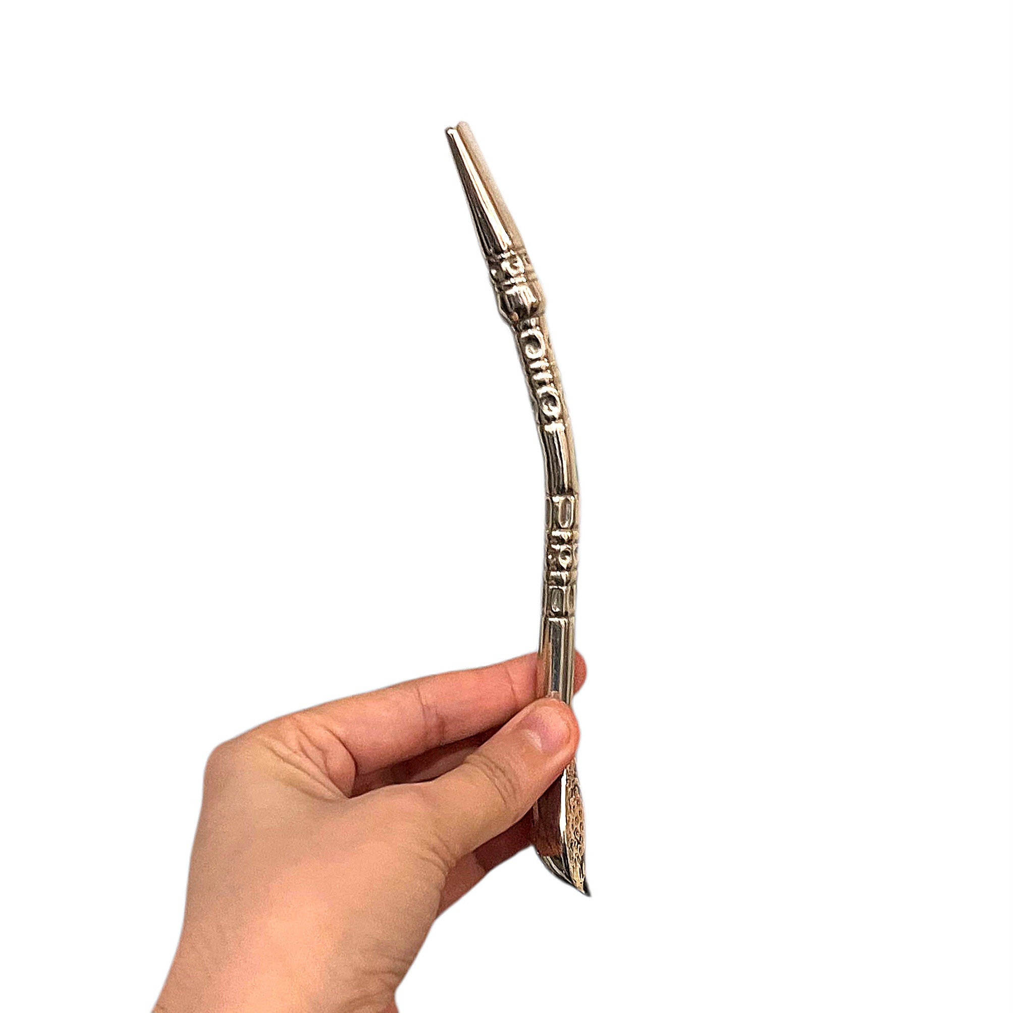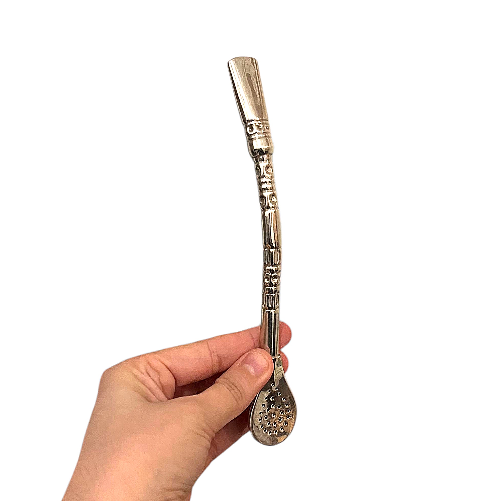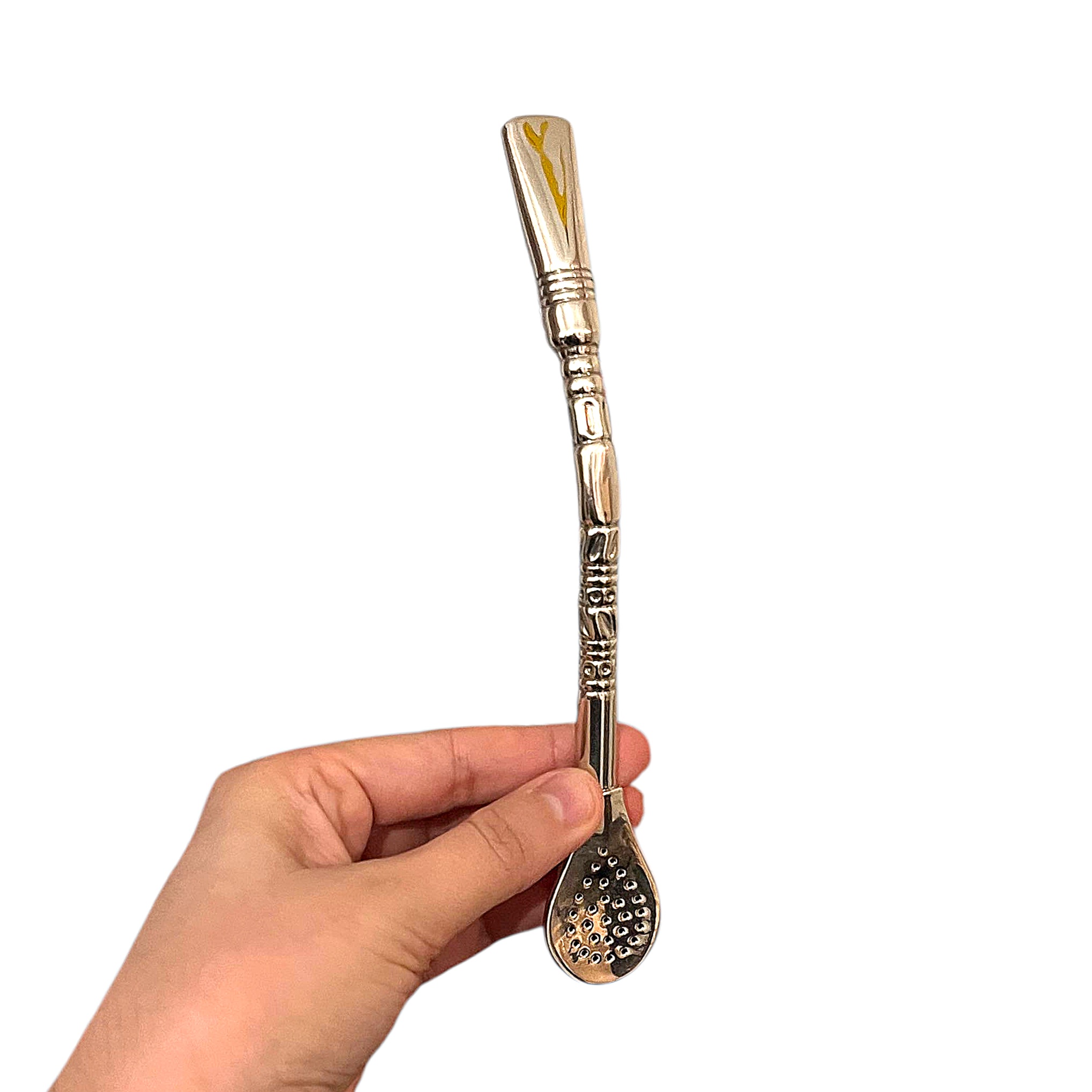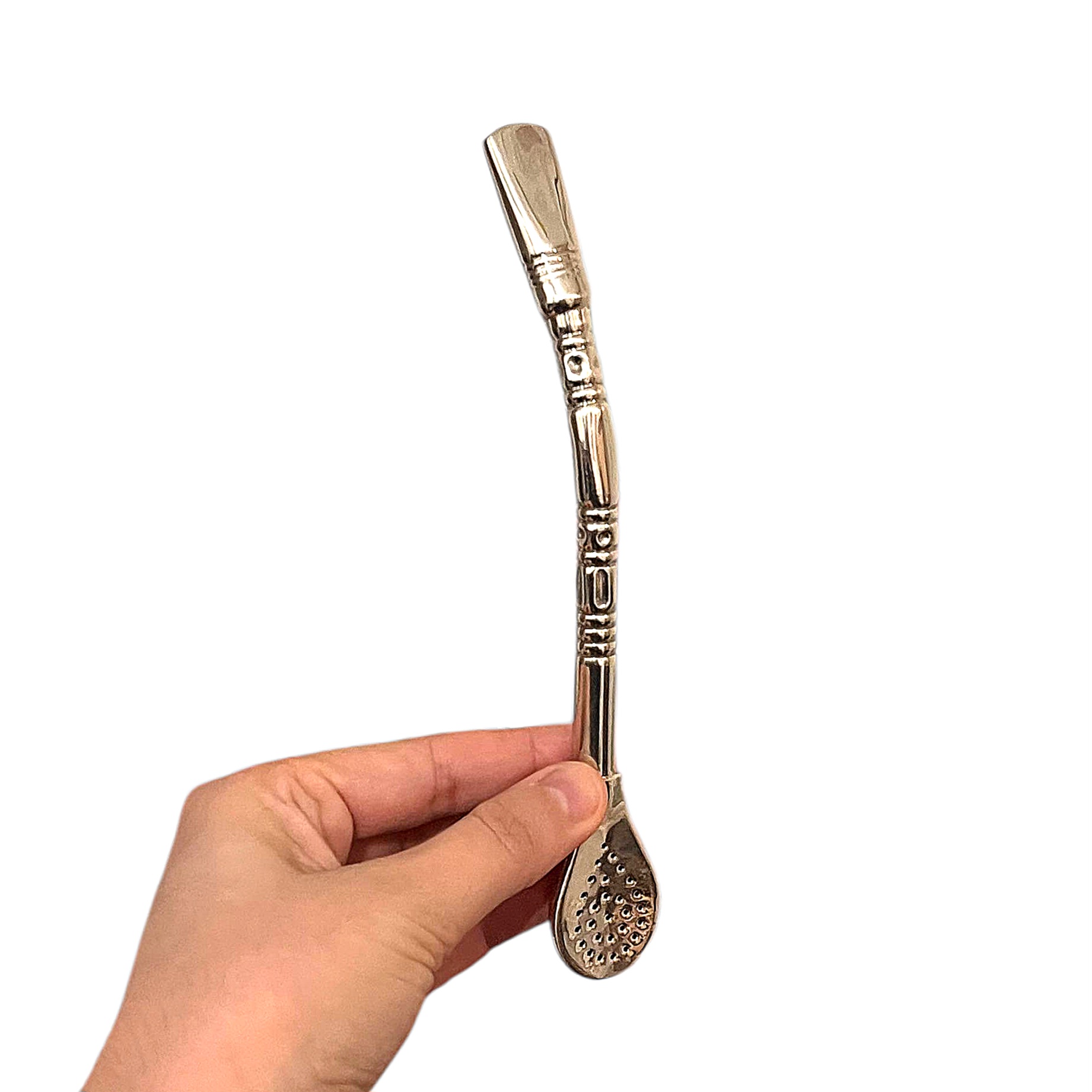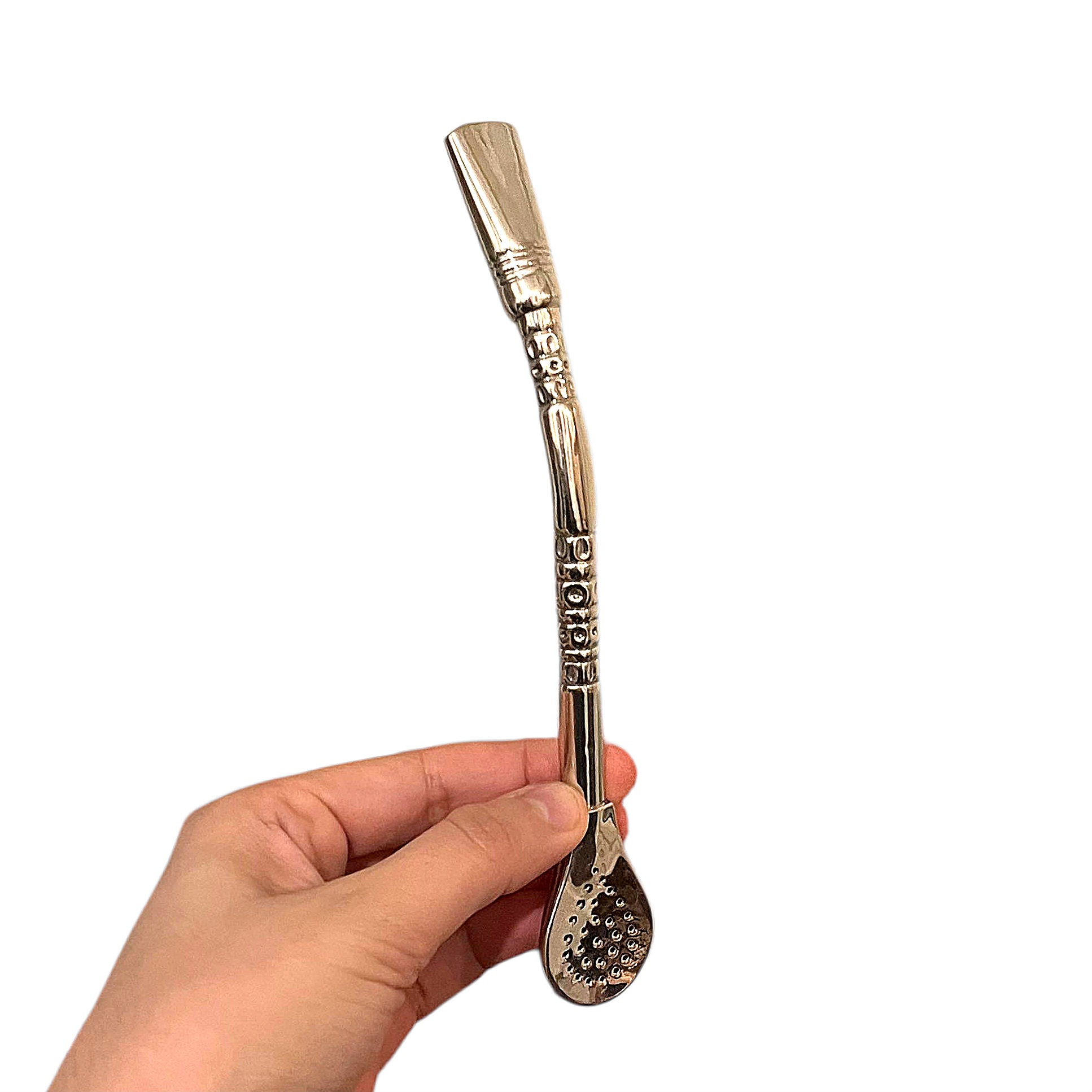 Realizada íntegramente en alpaca, una aleación reconocida por su solidez y durabilidad, esta bombilla ofrece una excelente resistencia al uso y una experiencia de degustación confortable. Su forma pico de rey garantiza una succión fluida y una filtración eficaz de la yerba mate.