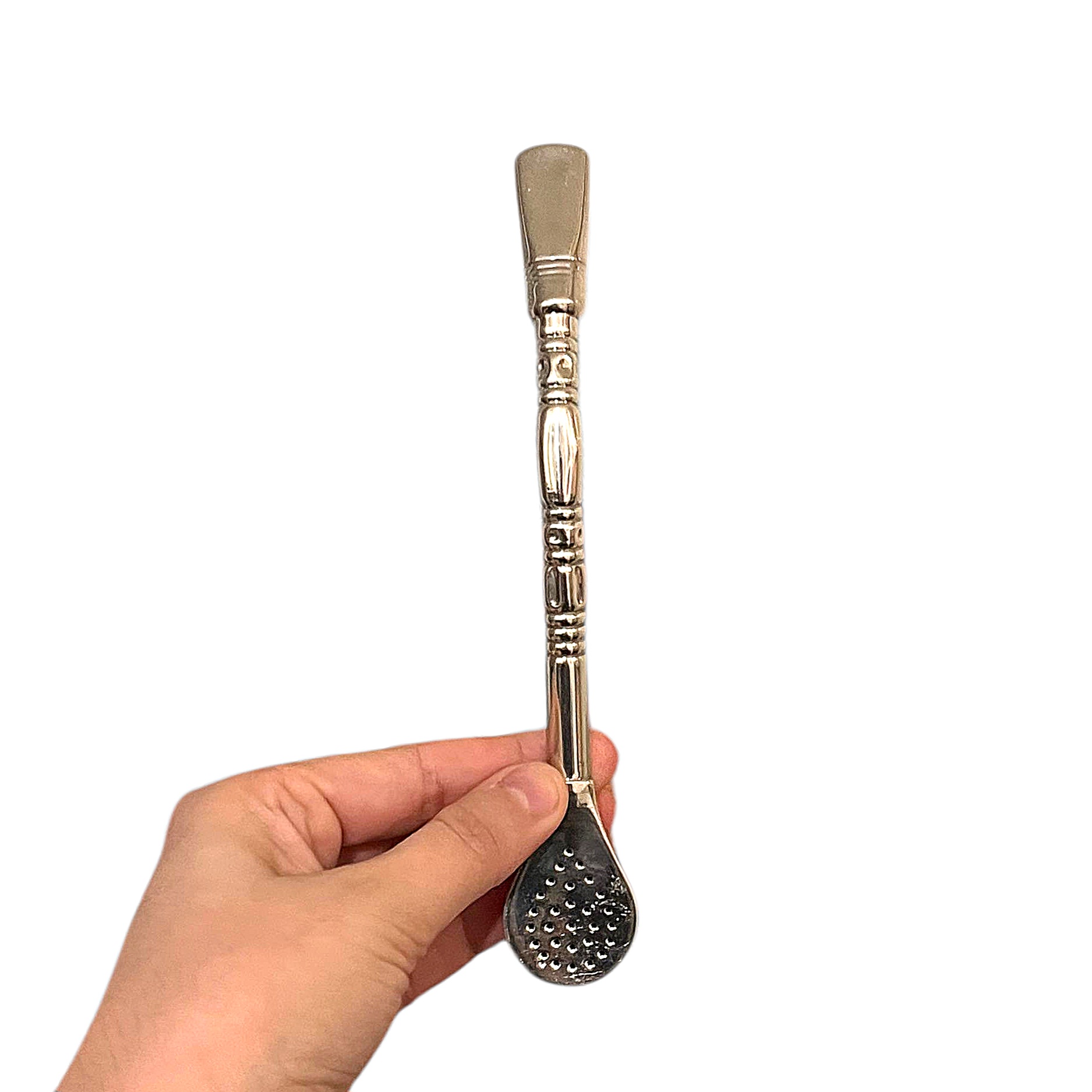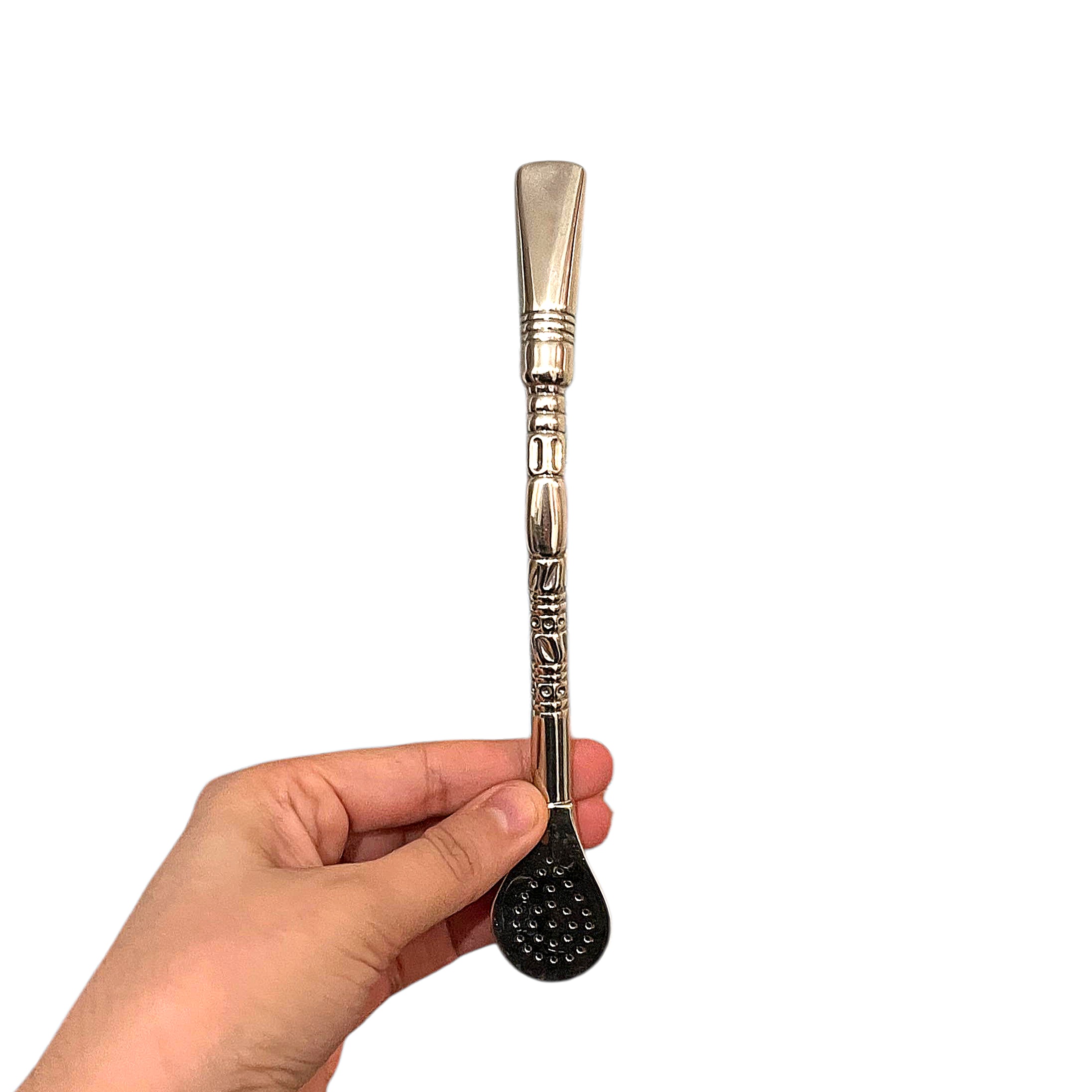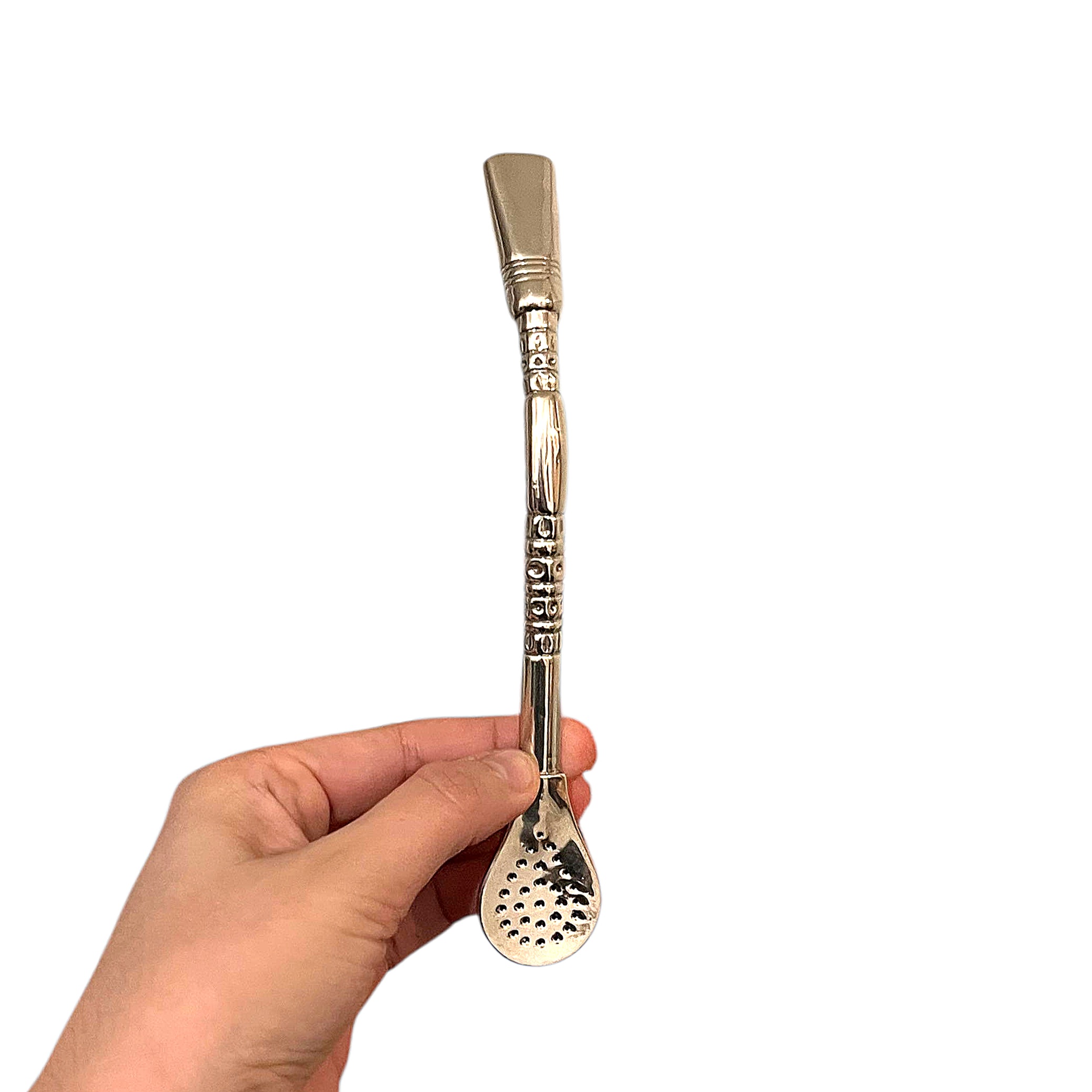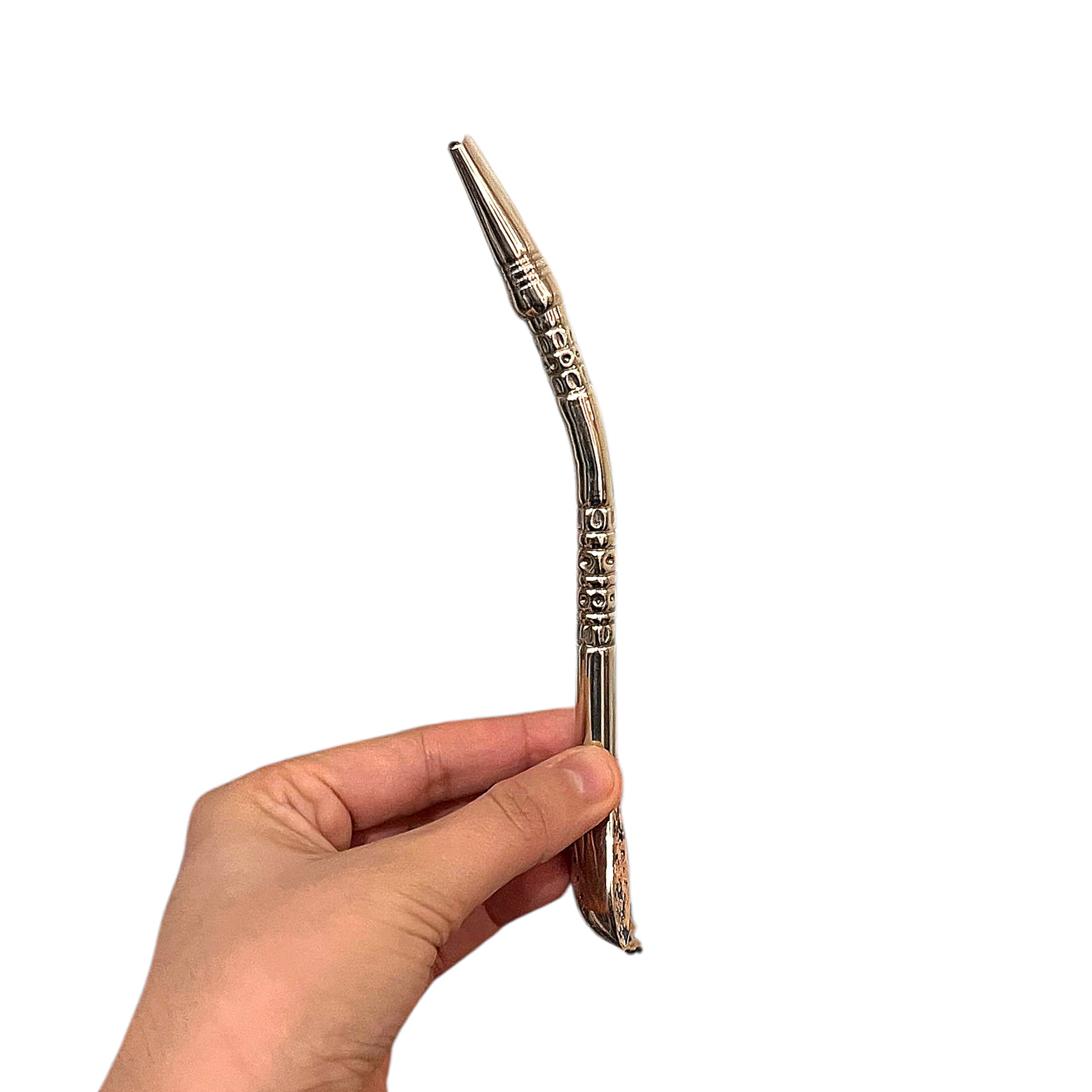 Realizada íntegramente en alpaca, una aleación reconocida por su solidez y durabilidad, esta bombilla ofrece una excelente resistencia al uso y una experiencia de degustación confortable. Su forma pico de rey garantiza una succión fluida y una filtración eficaz de la yerba mate.
