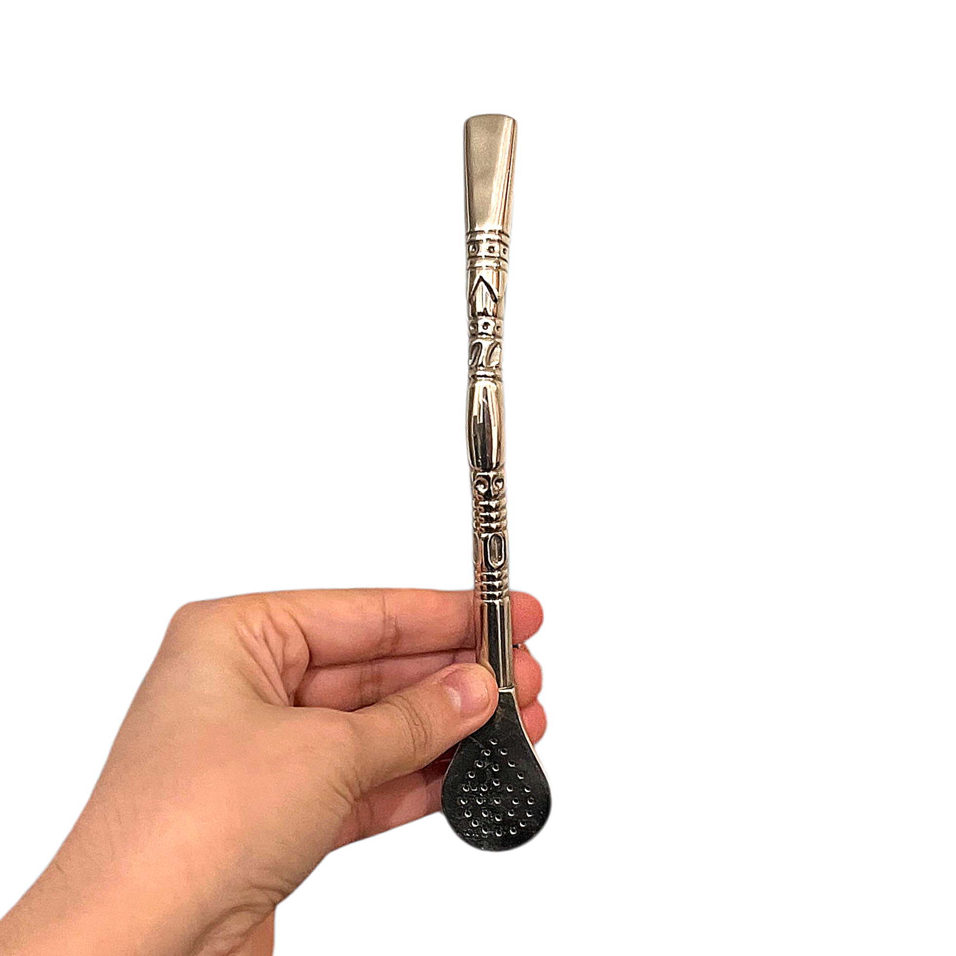 La bombilla pico de rey de alpaca Guardas es una pieza artesanal elaborada a mano por un maestro artesano en Argentina. Se distingue por su cuerpo íntegramente realizado en alpaca, adornado con un grabado Guardas, un motivo geométrico inspirado en las frisas decorativas tradicionales sudamericanas, que aporta carácter y elegancia al conjunto.