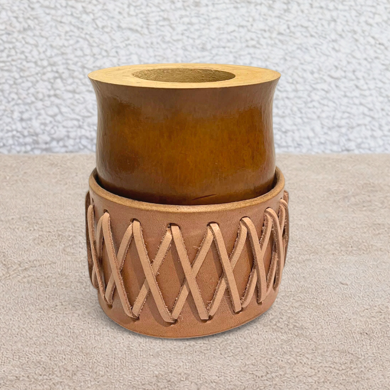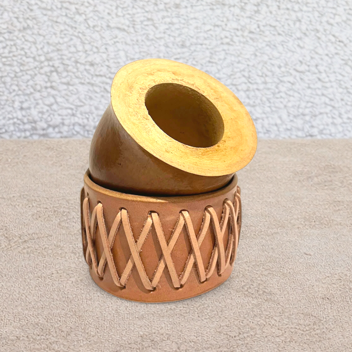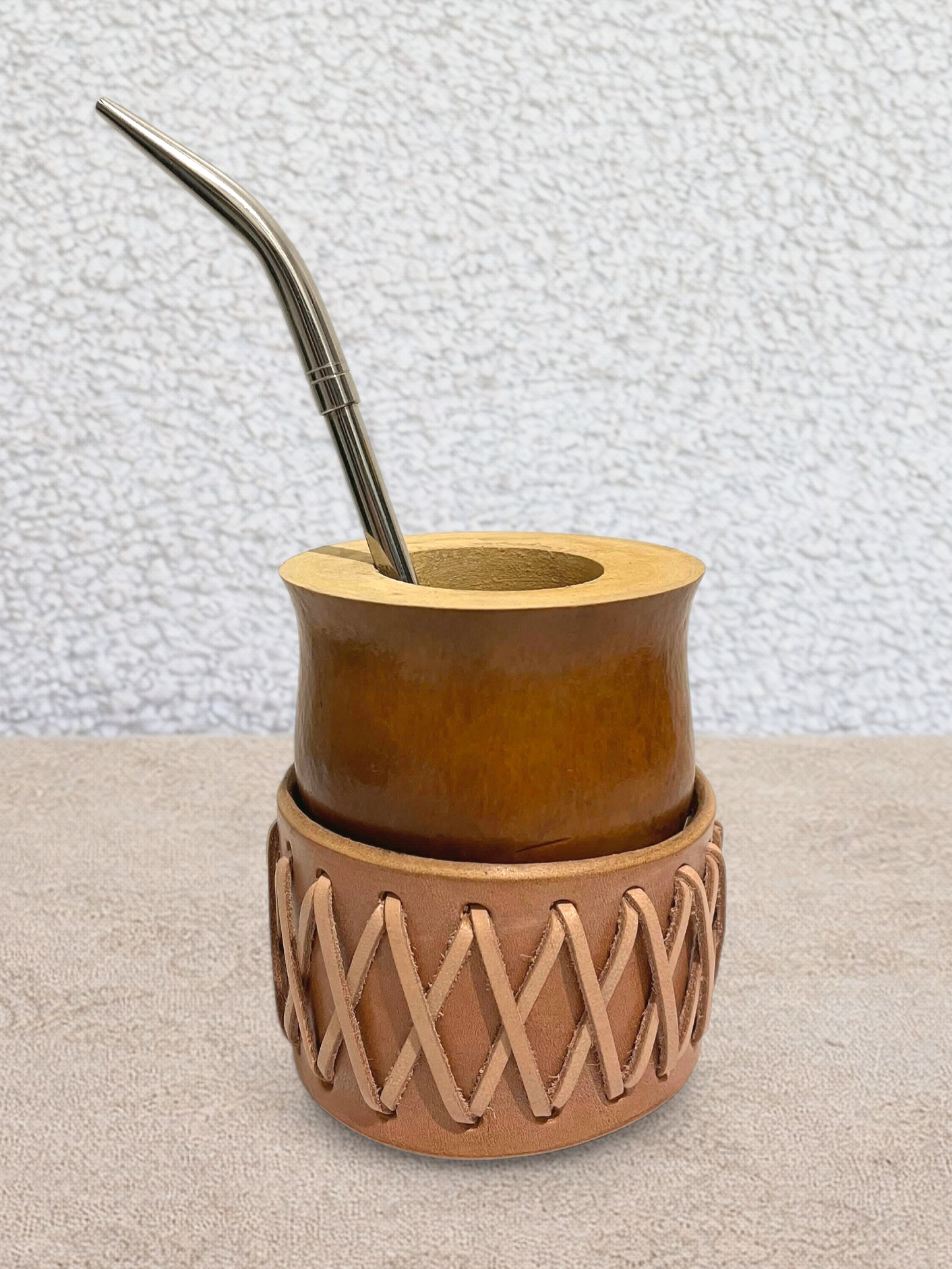 Su trenzado beige con tonos claros le da un aspecto auténtico y elegante, fiel a la estética gaucha. Gracias a su base fabricada en cuero, la calabaza se puede colocar inclinada, lo que hace que la preparación de la yerba mate sea más sencilla y práctica en el día a día.