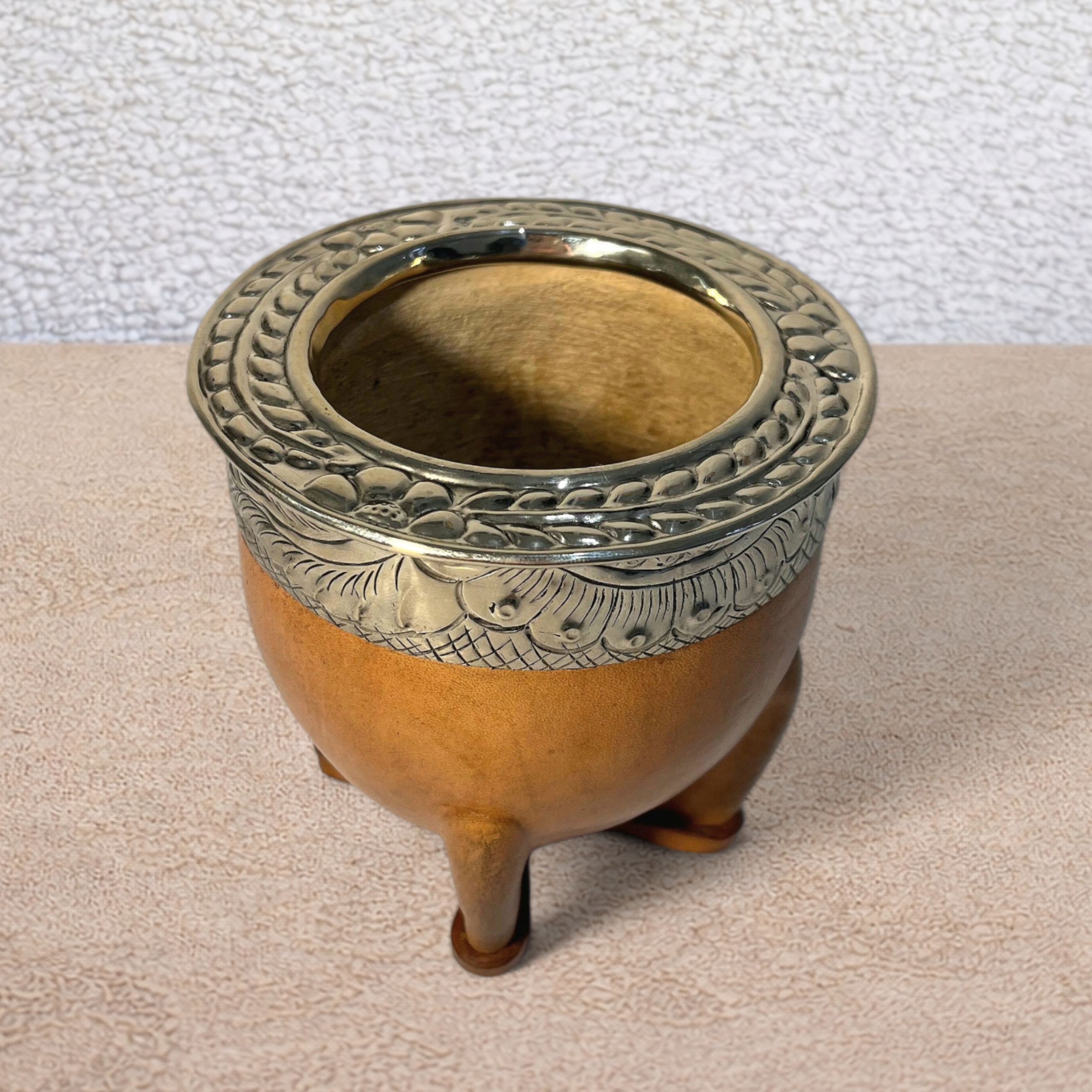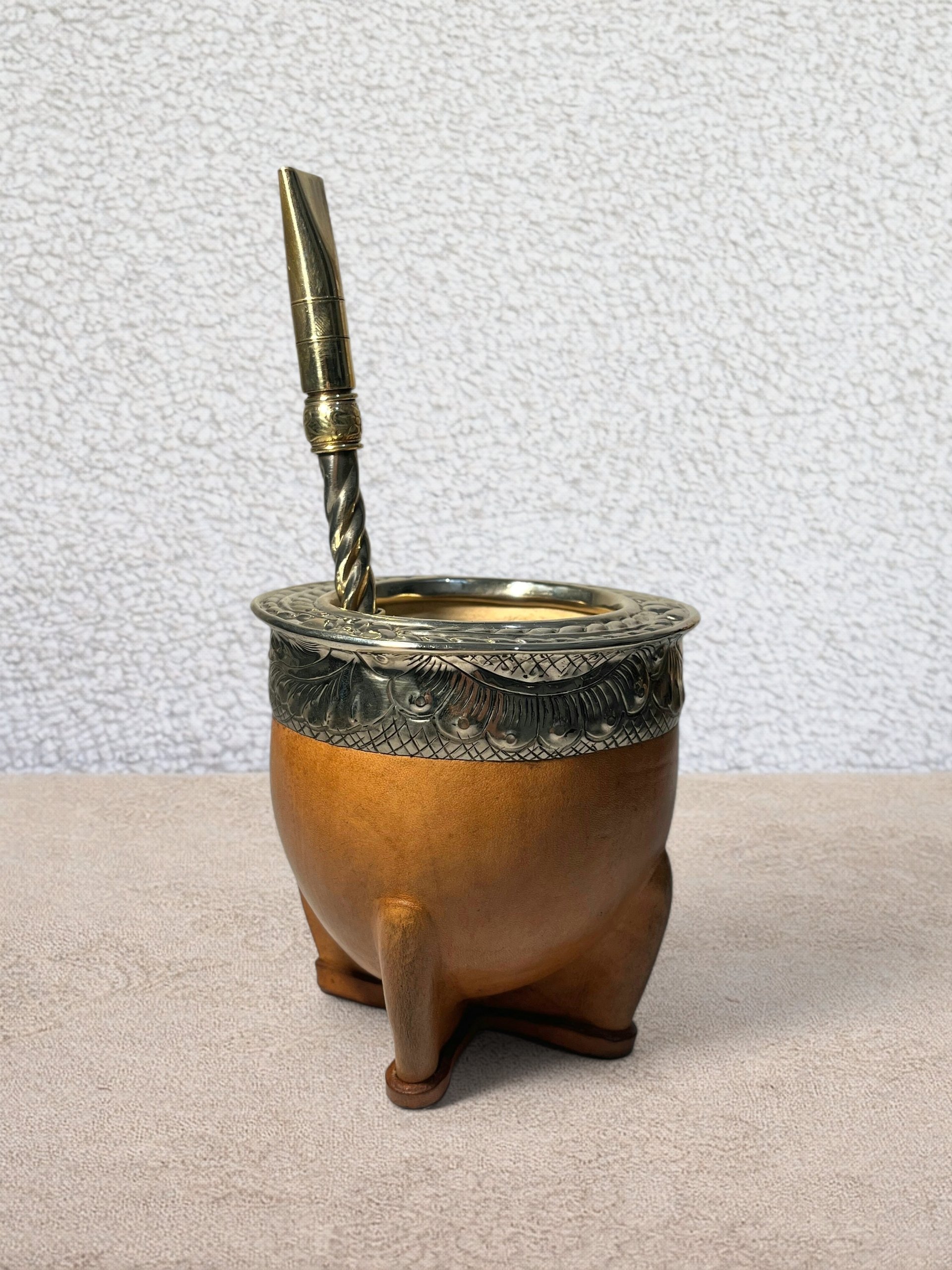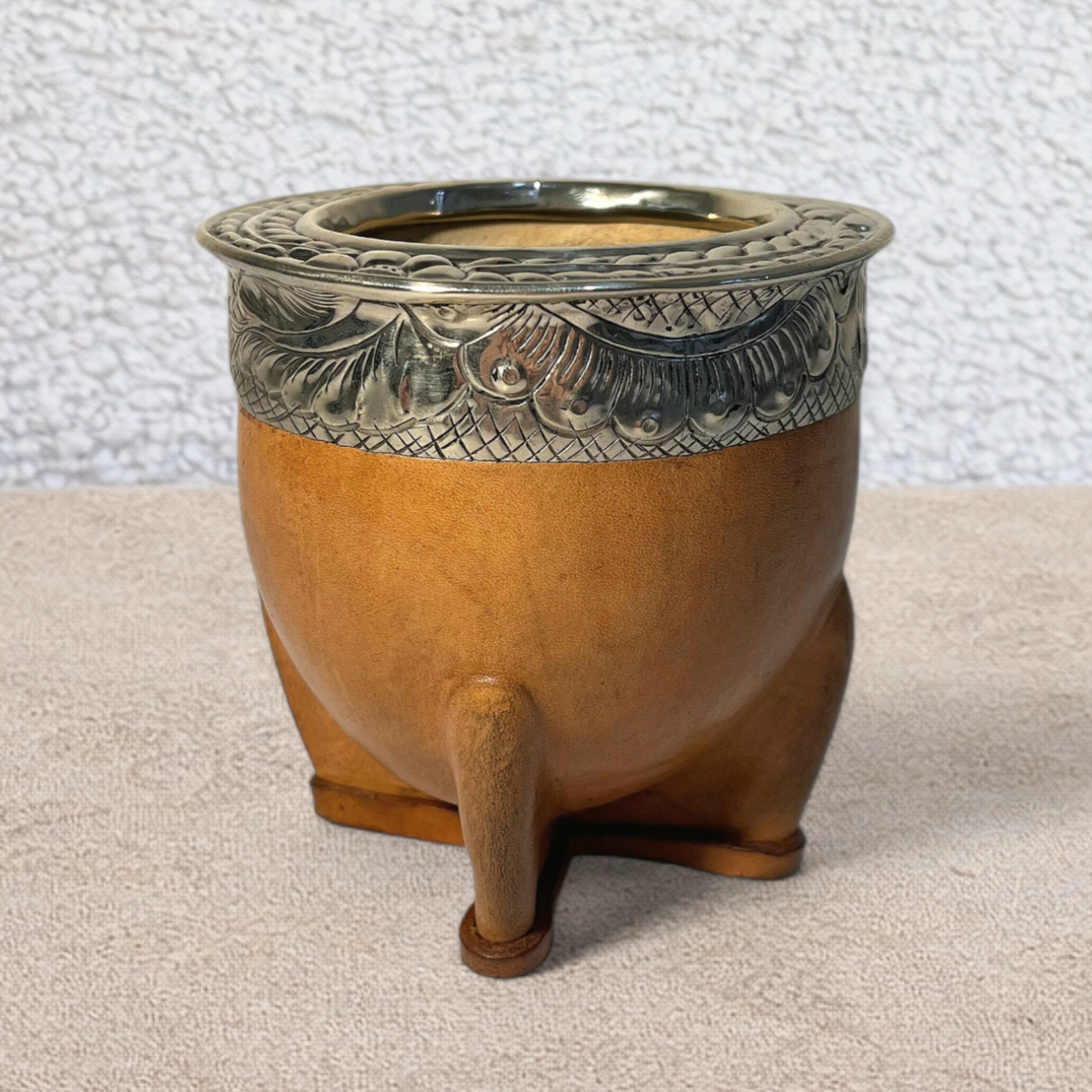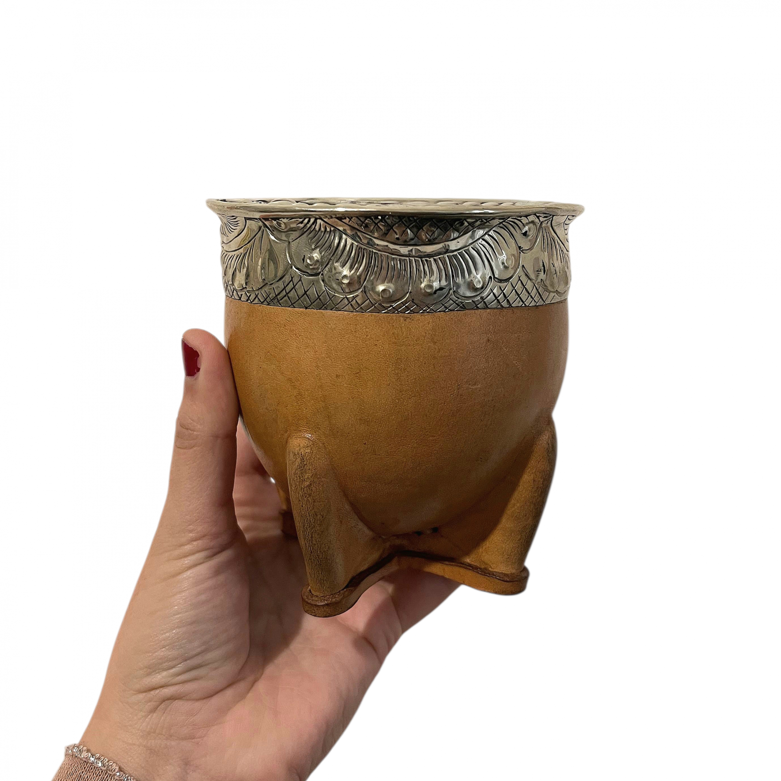 Está elaborado a partir de una calabaza natural cuidadosamente seleccionada, luego forrado con cuero beige de alta calidad con curtido vegetal. Su virola de alpaca aporta un acabado cuidado y refuerza el carácter auténtico de este modelo, fiel a la tradición del mate artesanal.
