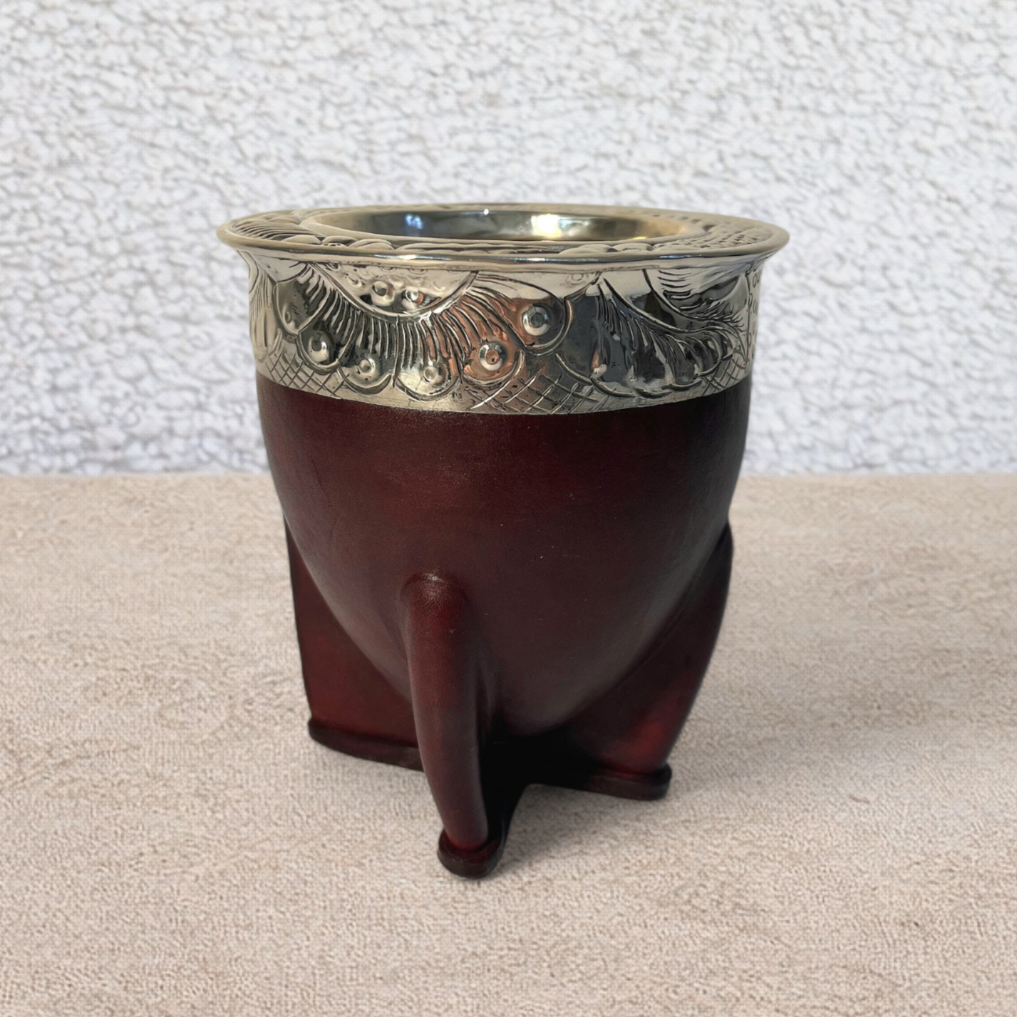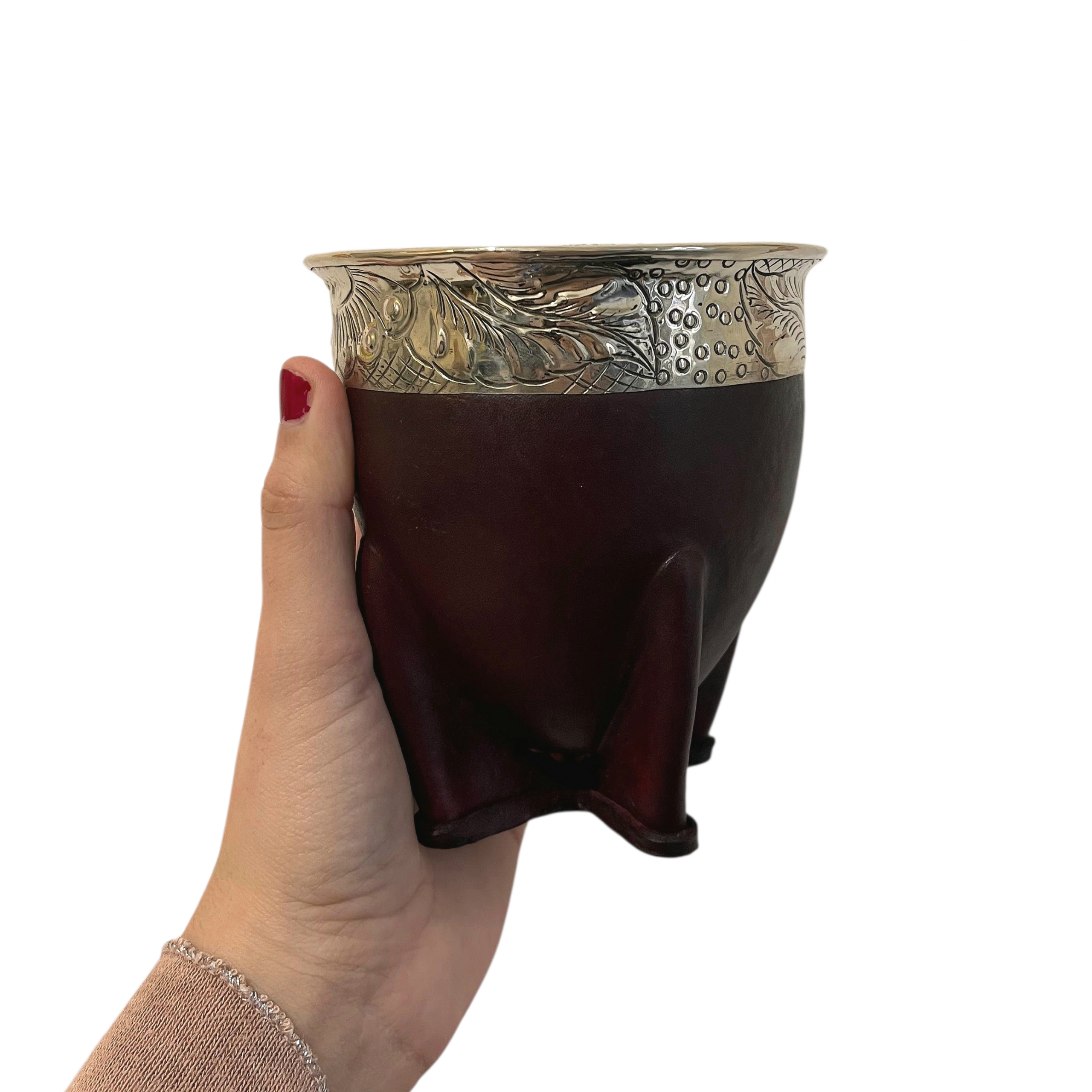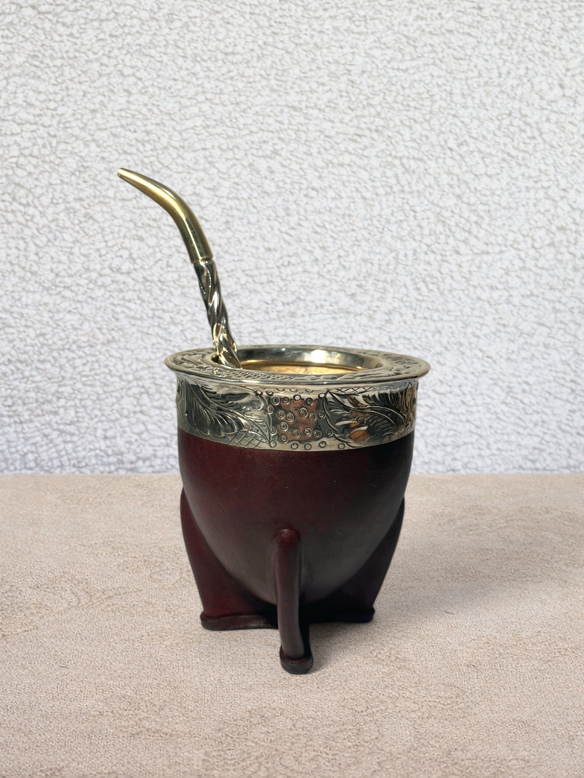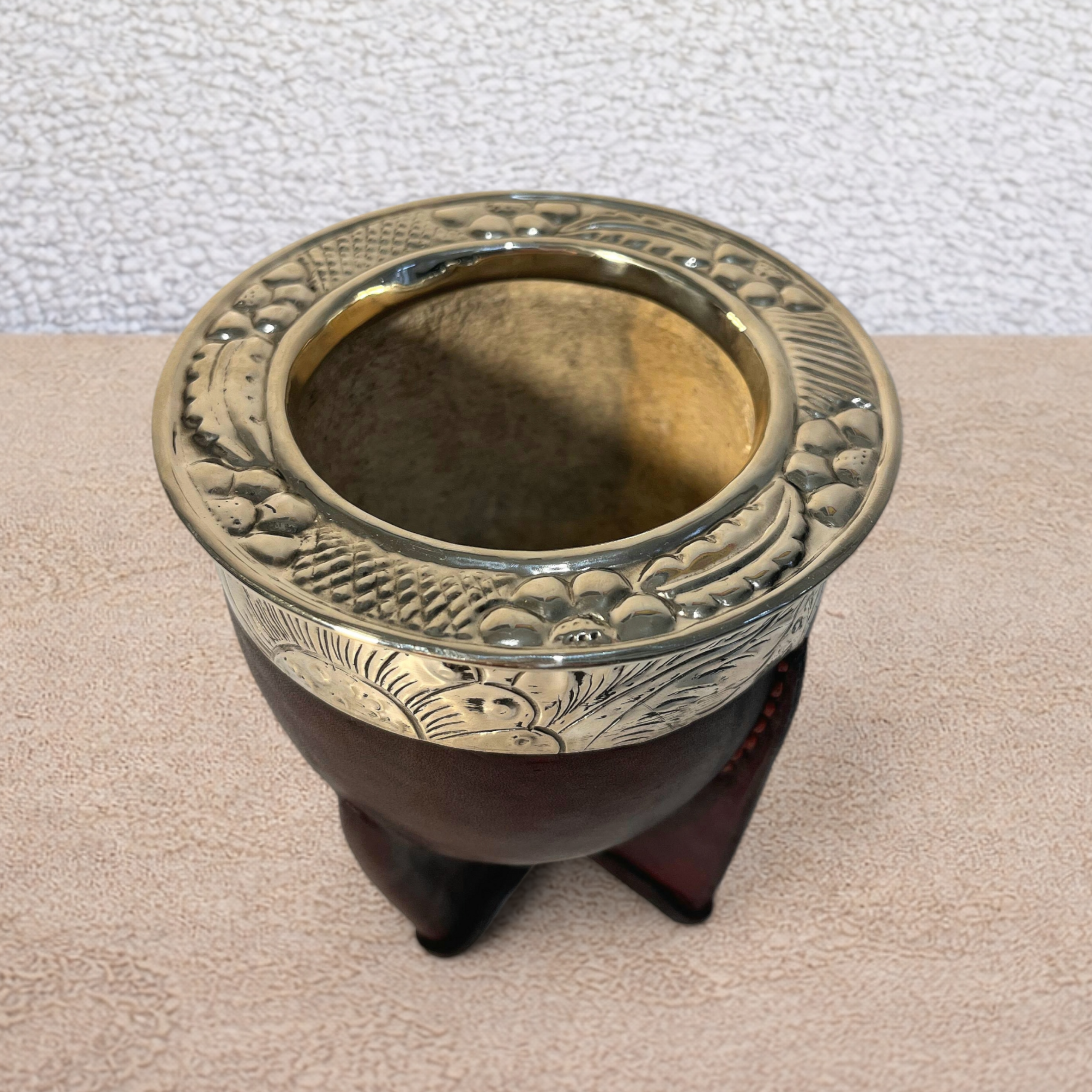 Fabricado a partir de una calabaza extra gruesa de origen brasileño, se recubre después con cuero marrón de primera calidad. Reforzado con una virola de alpaca cincelada a mano según la tradición gaucha, tendrá en sus manos un exclusivo mate de alta calidad