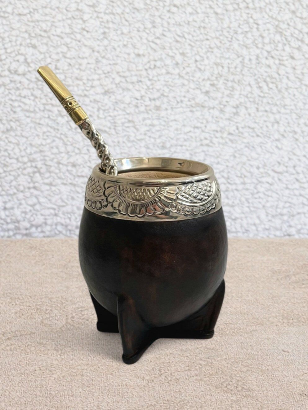 Pensada para un uso duradero, esta calabaza se enmarca en la tradición del mate sudamericano. Requiere un proceso de curado antes del primer uso para preparar la calabaza y garantizar una infusión óptima de la yerba mate.