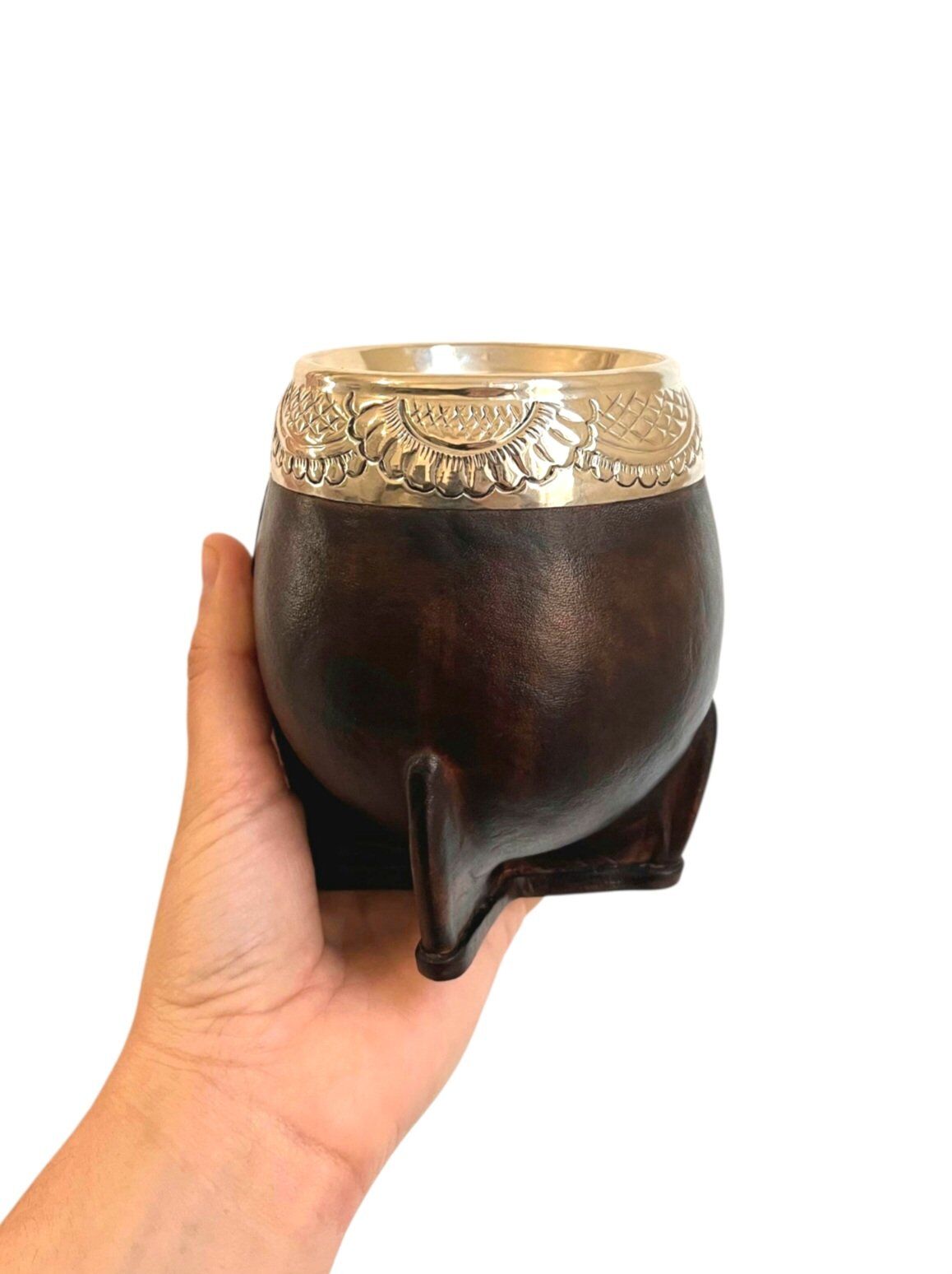 Está elaborada a partir de una calabaza natural de origen brasileño, seleccionada por su resistencia y forma. Su revestimiento de cuero color avellana con curtido vegetal, ofrece un acabado natural y elegante, mientras que la virola de alpaca, grabada a mano, resalta el carácter artesanal y único de cada modelo.