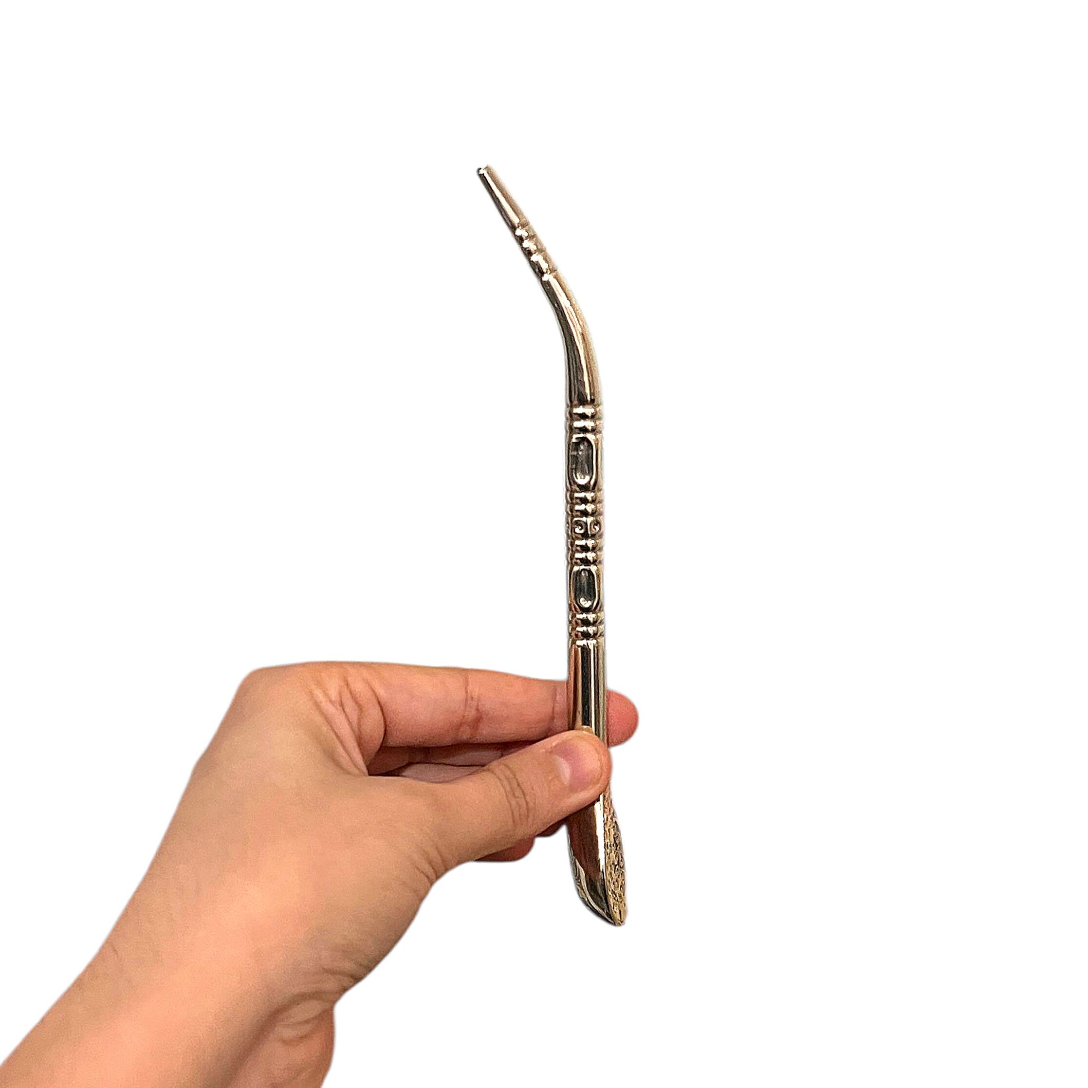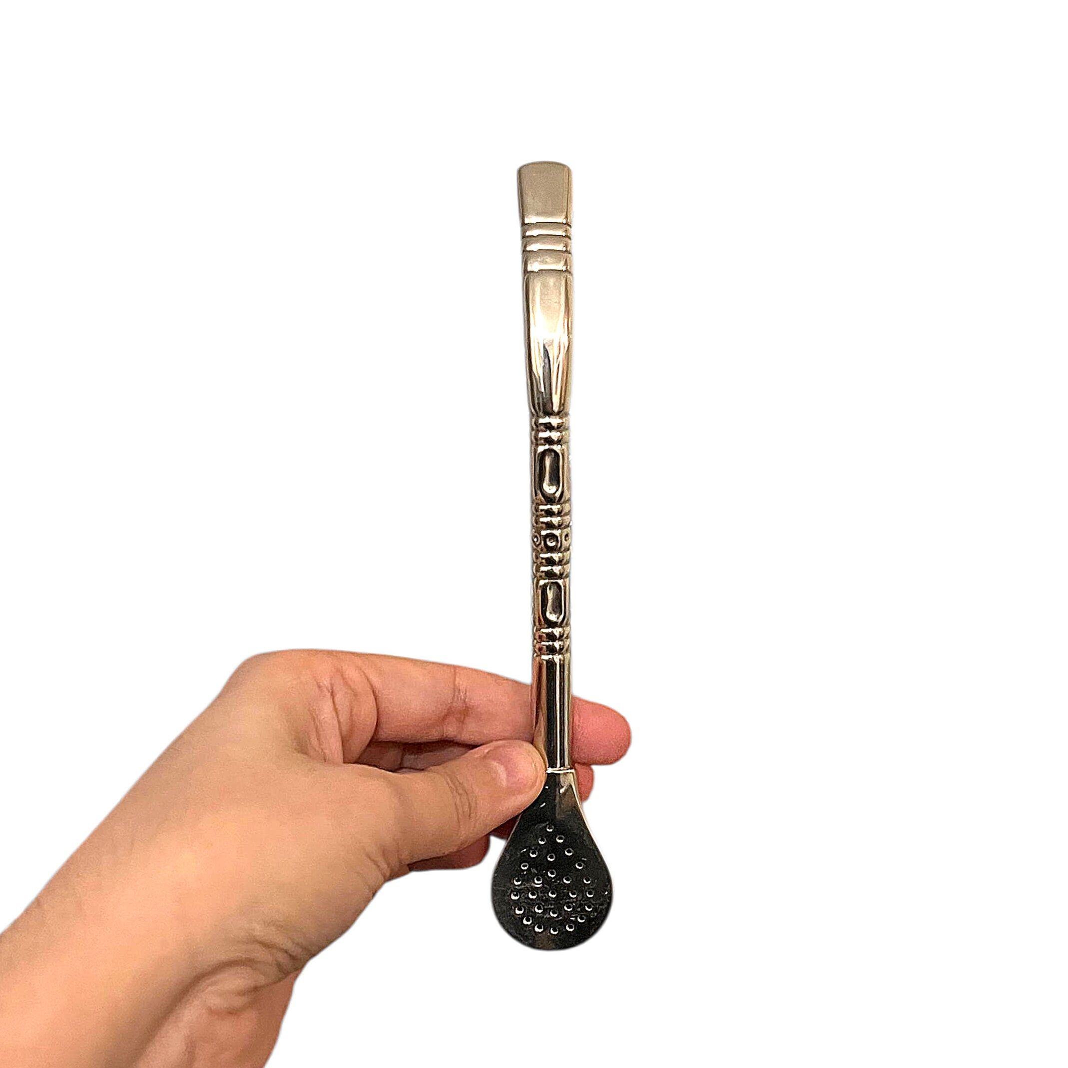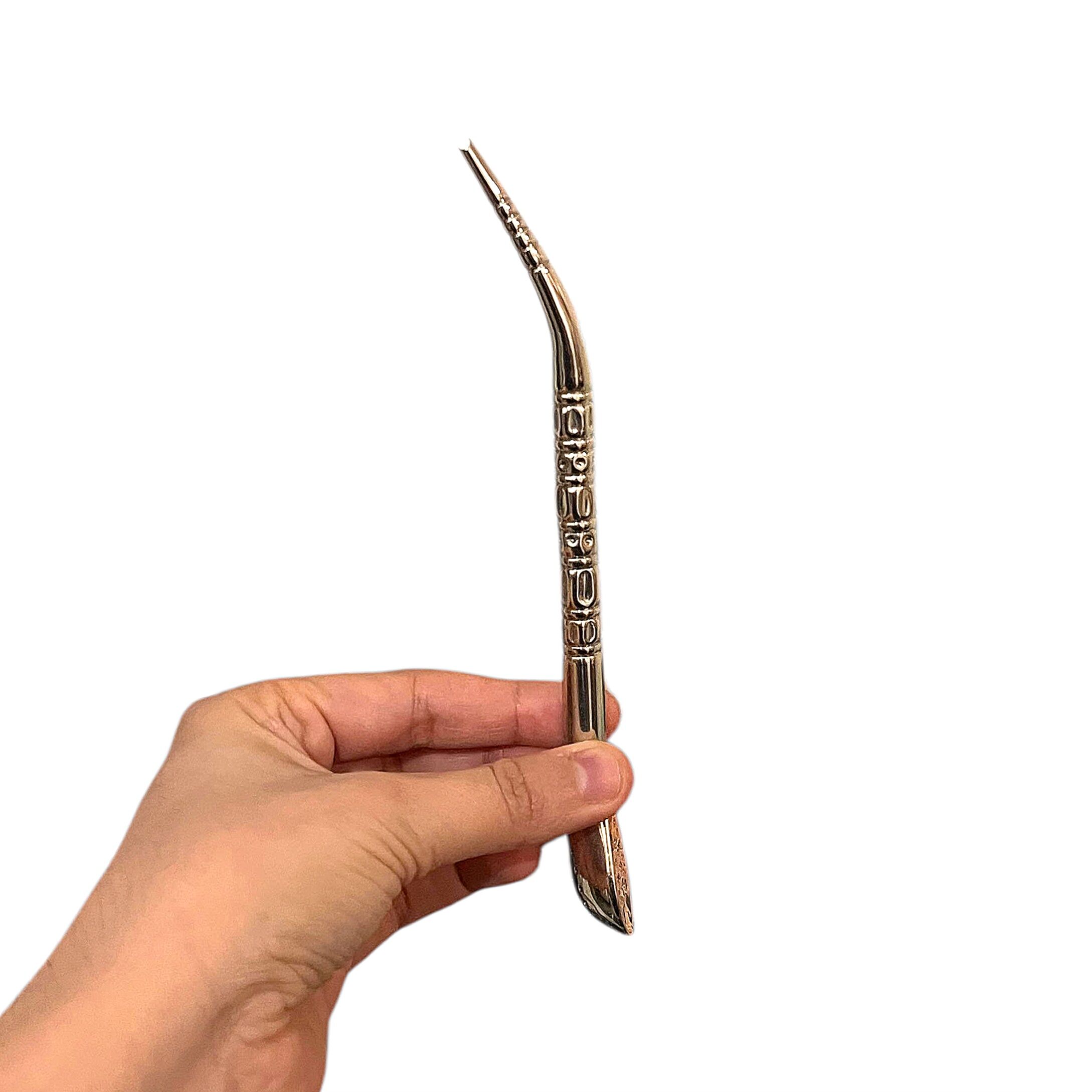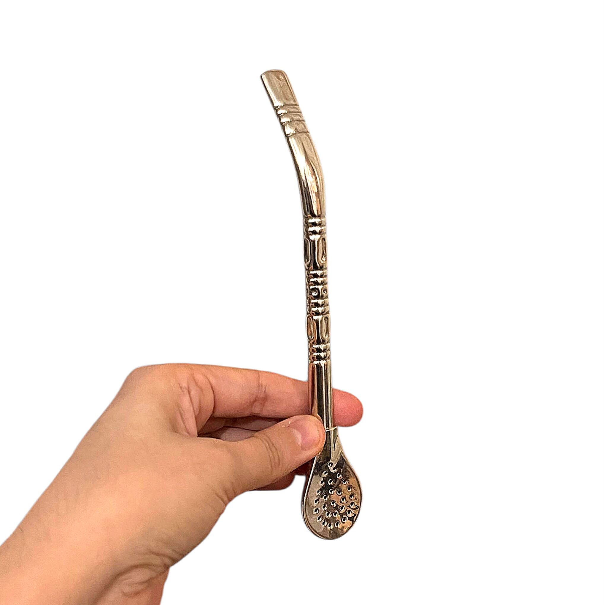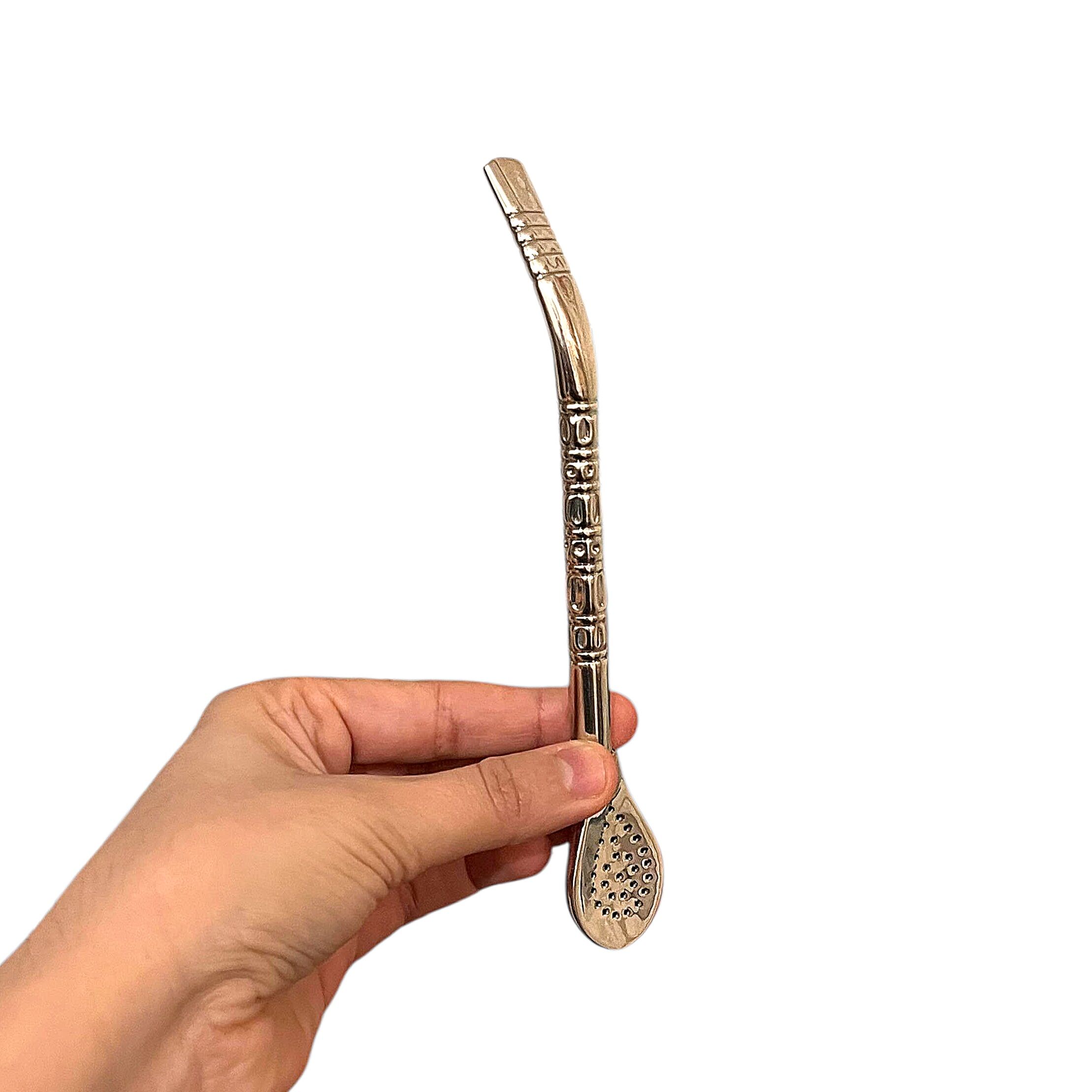Réalisée en alpaca, un alliage reconnu pour sa solidité et sa durabilité, cette bombilla offre une excellente résistance à l’usage et une expérience de dégustation confortable. Sa forme pico de loro assure une aspiration fluide et une filtration efficace de la yerba mate.