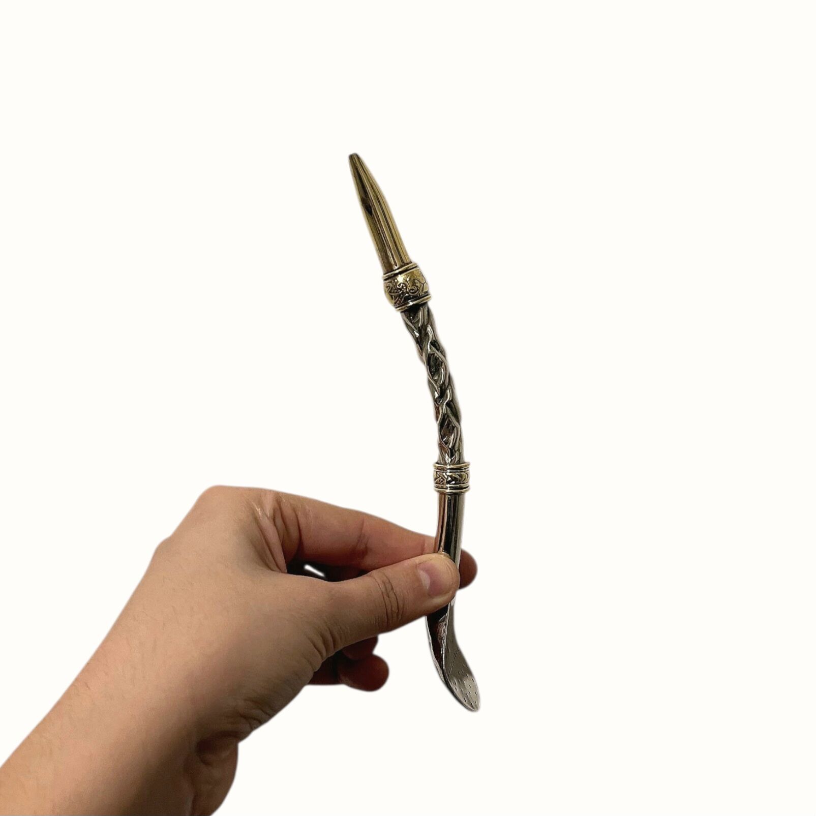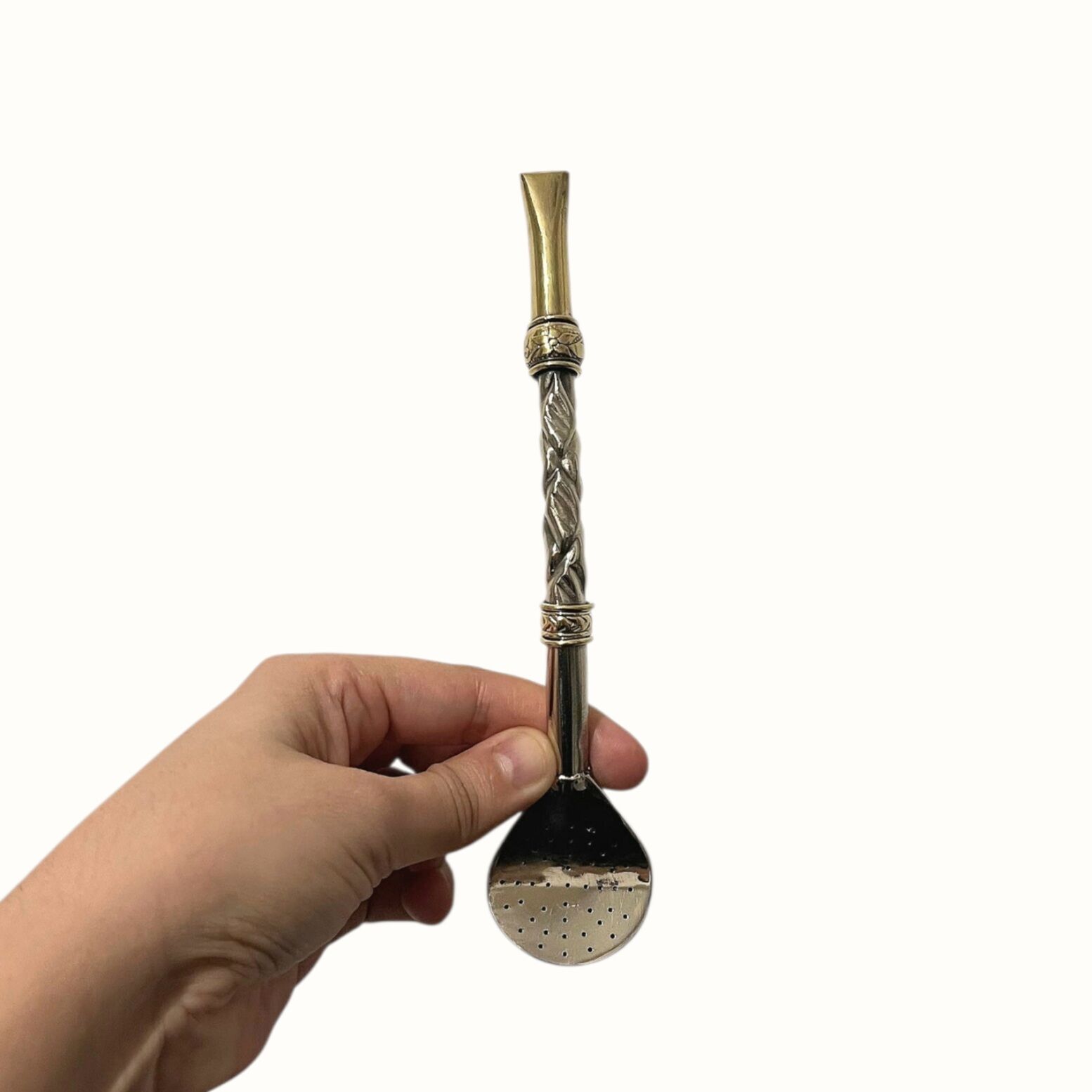 Associez votre maté à ce bombillon grand pico rey, une magnifique pièce artisanale. Fabriqué à la main par un artisan Argentin en bronze et alpaca, il est monté d’un filtre à trous extra fins. Il est parfait pour boire tout type d’herbes à maté.
