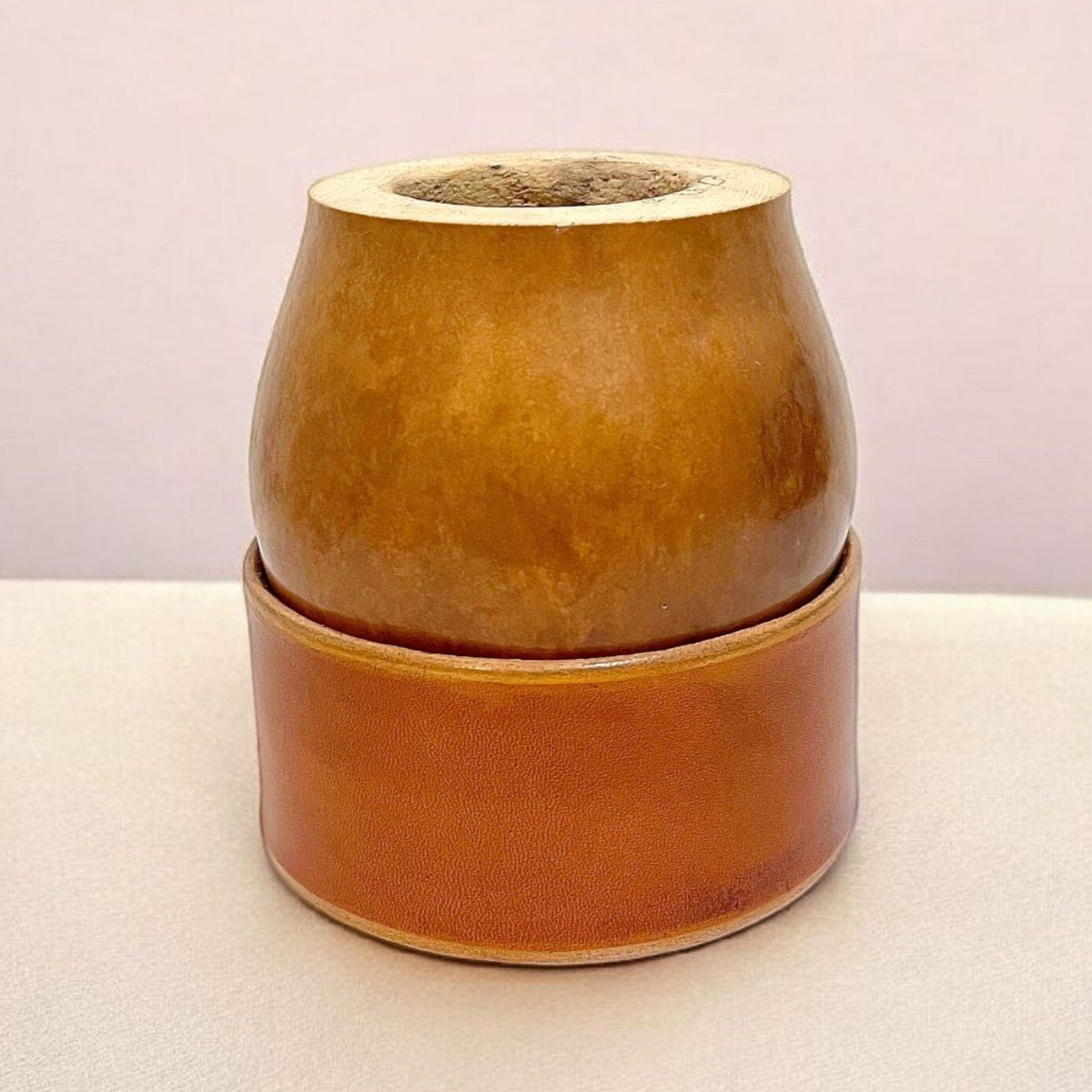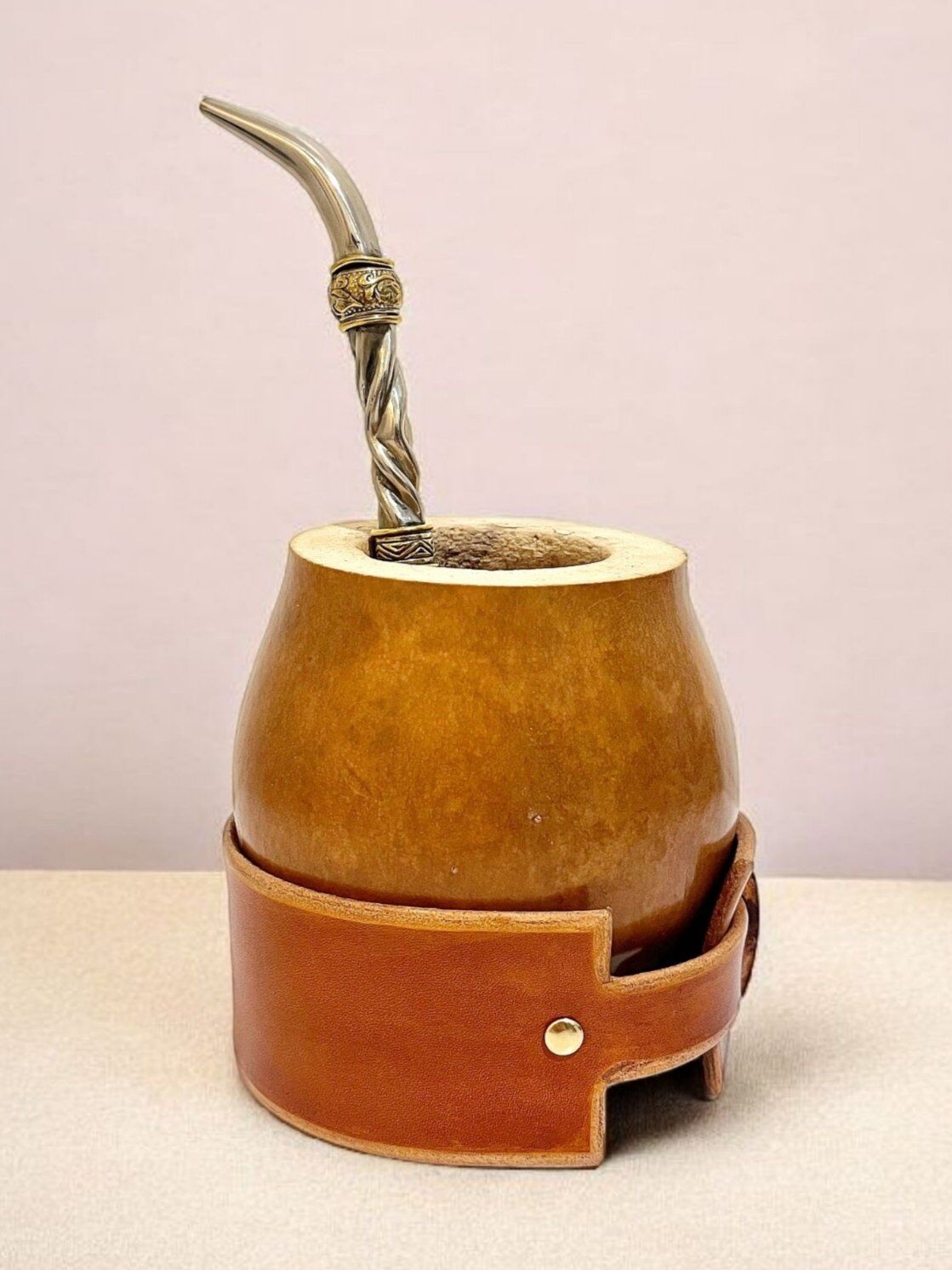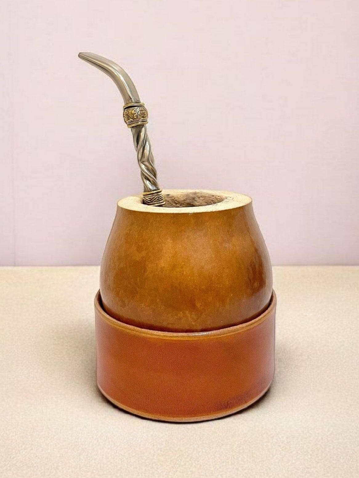 Réalisée à partir d’une calebasse naturelle sélectionnée pour sa qualité, elle repose sur une base en cuir ajustable, permettant de modifier légèrement son inclinaison selon vos préférences. Ce système ingénieux rend la préparation de l’herbe à maté encore plus simple et confortable, tout en garantissant une bonne stabilité.
