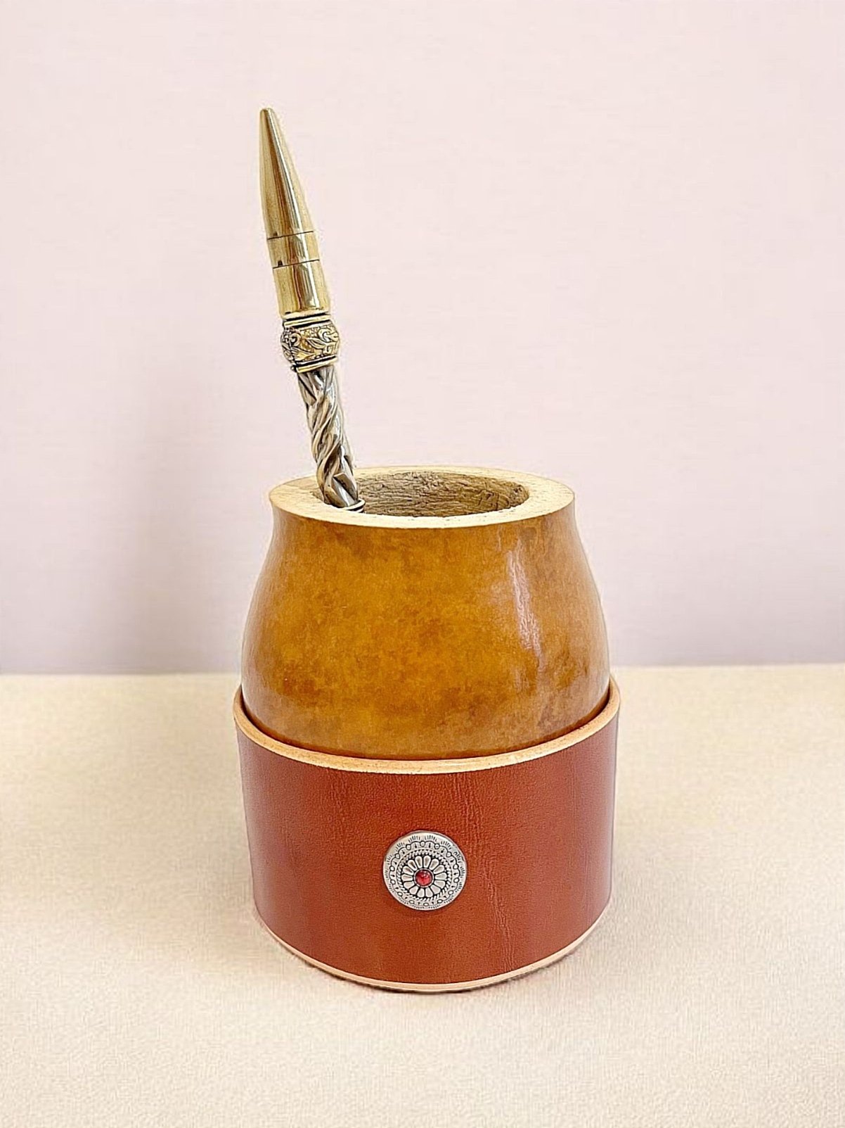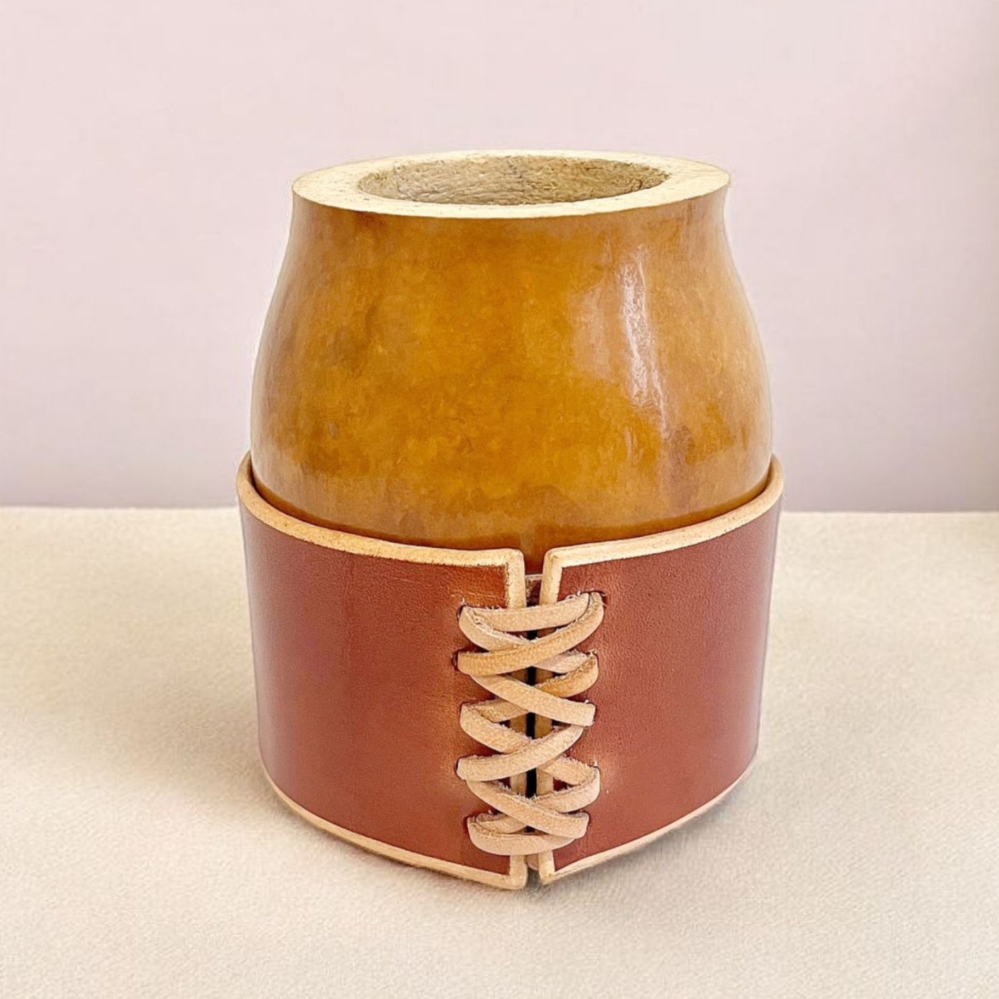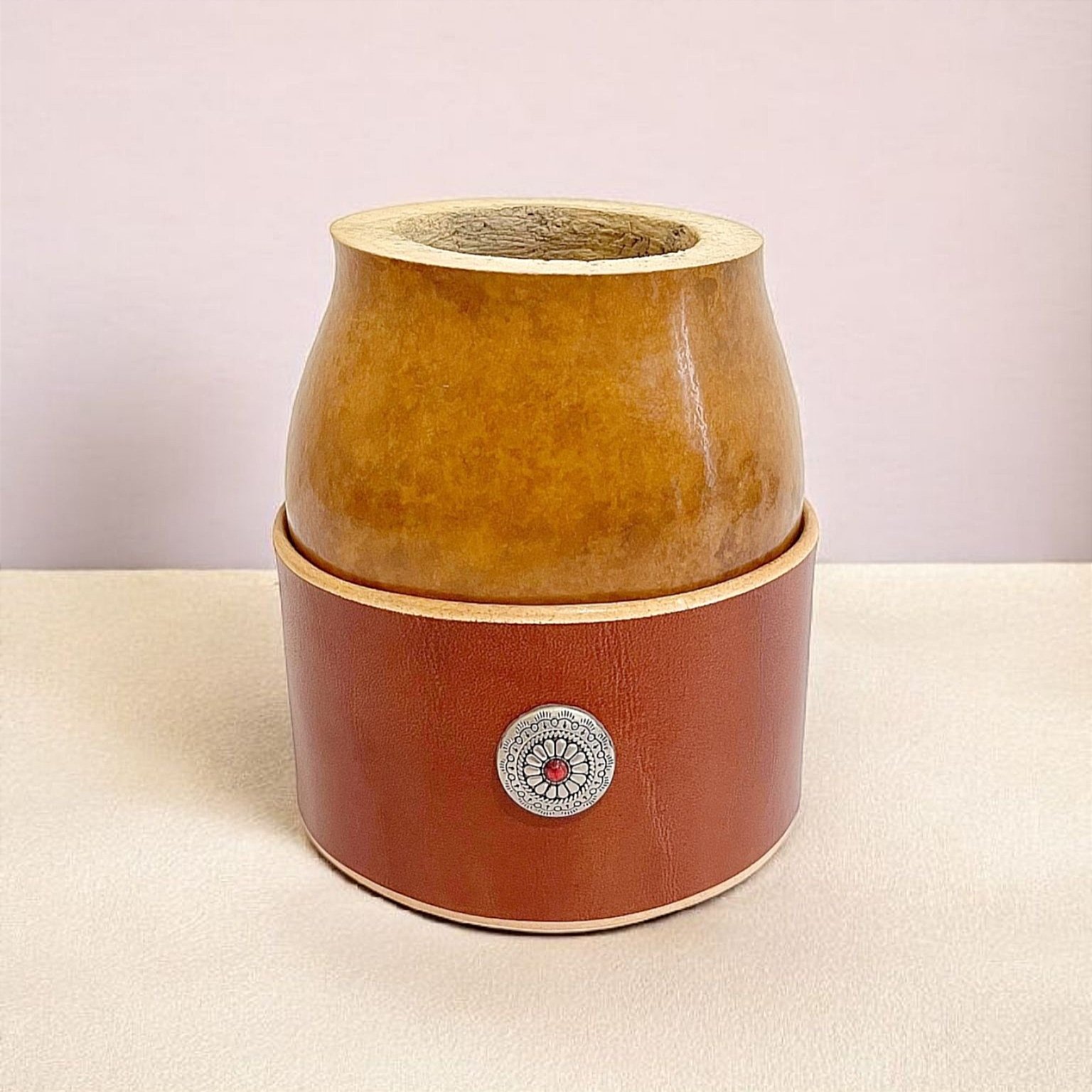 Sa base en cuir châtain de haute qualité, issue d’un tannage végétal, assure une excellente stabilité et une finition soignée. Ce modèle pratique permet d’incliner facilement la calebasse pour bien disposer la yerba maté, rendant la préparation à la fois simple et agréable.