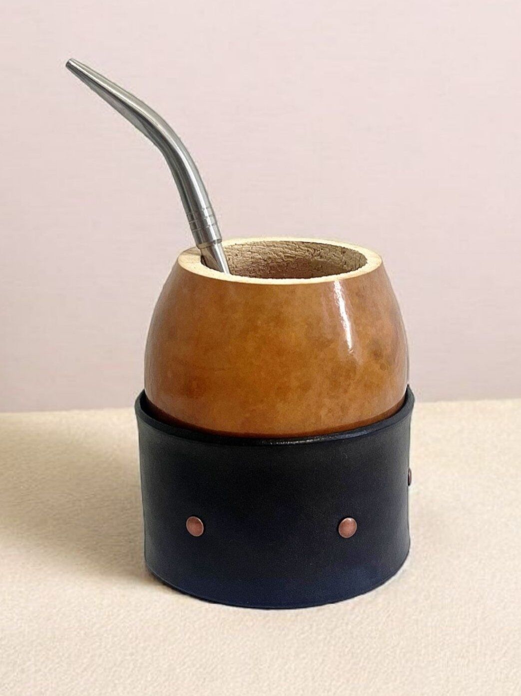 Ce modèle se distingue par son apparence élégante et sa solidité, tout en conservant le charme rustique des accessoires de maté traditionnels. Sa base renforce la stabilité de la calebasse et permet de la positionner légèrement penchée, un atout pratique pour préparer l’herbe à maté de manière simple et efficace.
