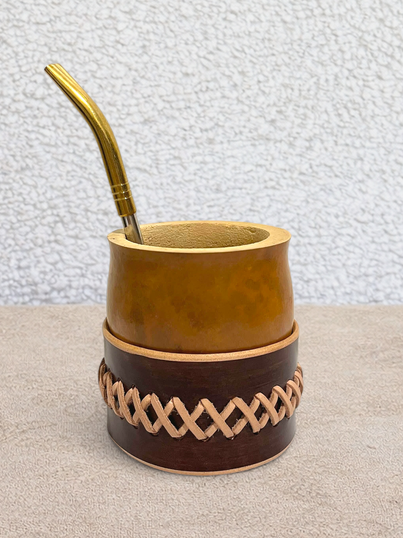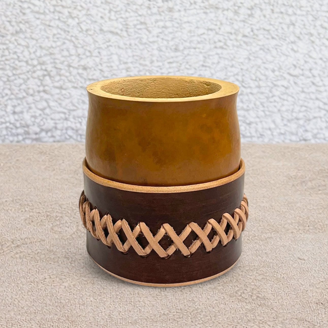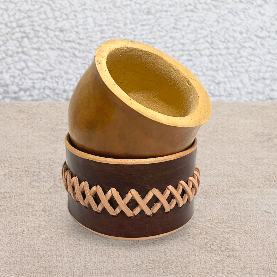 La calebasse naturelle, d’origine brésilienne, est soigneusement sélectionnée puis habillée d’un cuir marron haut de gamme issu d’un tannage végétal. Son tressage en cuir apporte une finition élégante et rustique, fidèle à l’esthétique gaucho et à la tradition du maté.