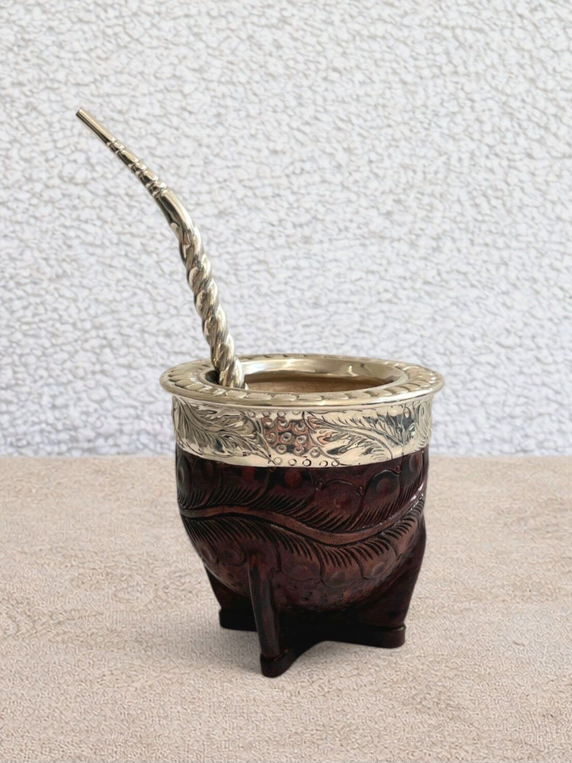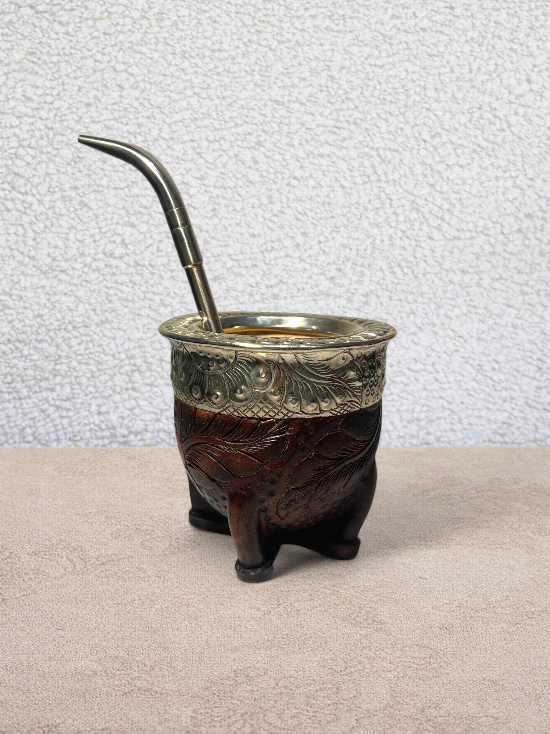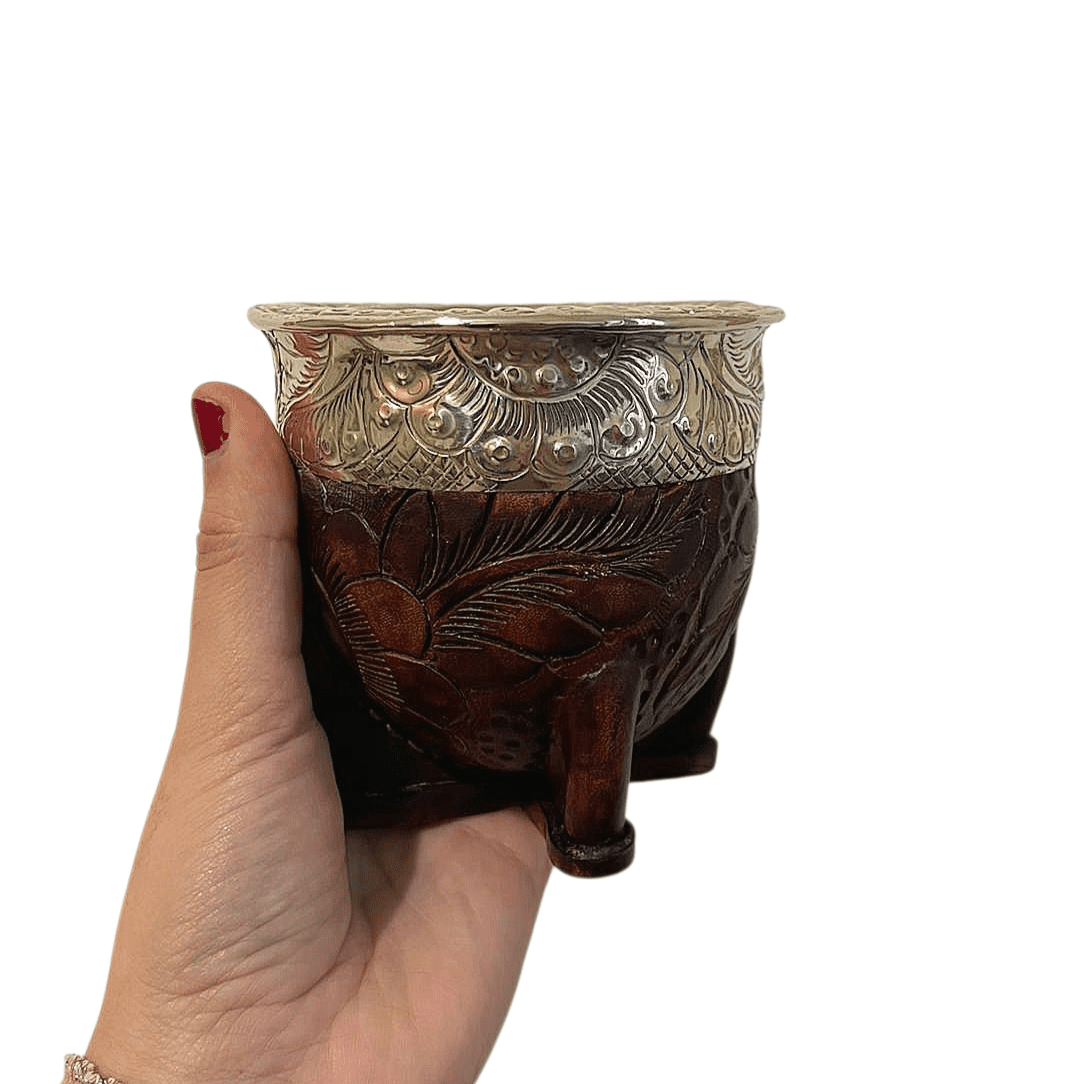 La calebasse à maté cuir gravé acajou est une pièce artisanale au fort caractère, pensée pour les amateurs de maté sensibles aux détails et au travail du cuir. Fabriquée à la main, elle associe la tradition du maté à une technique de décoration rare et exigeante.