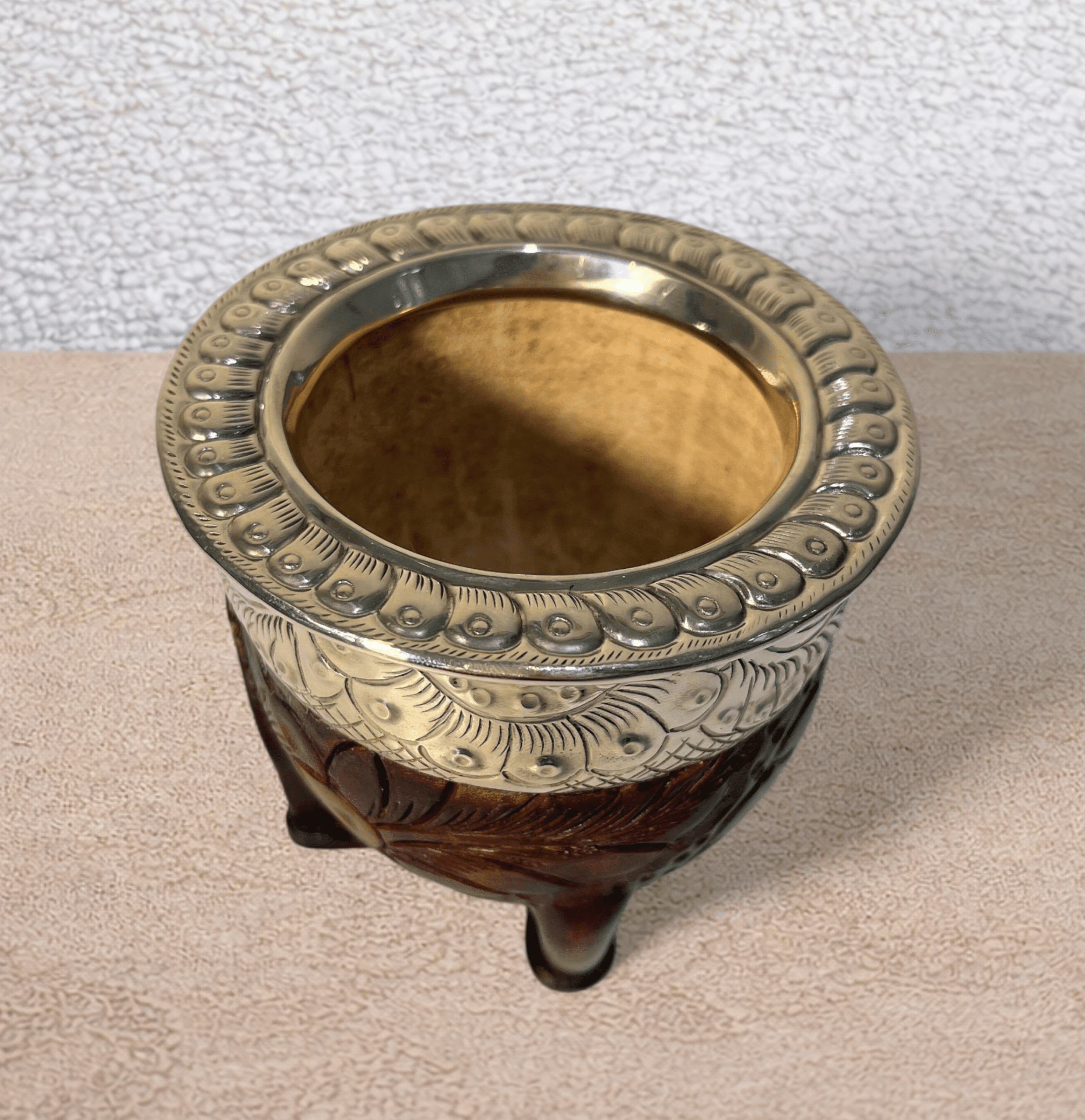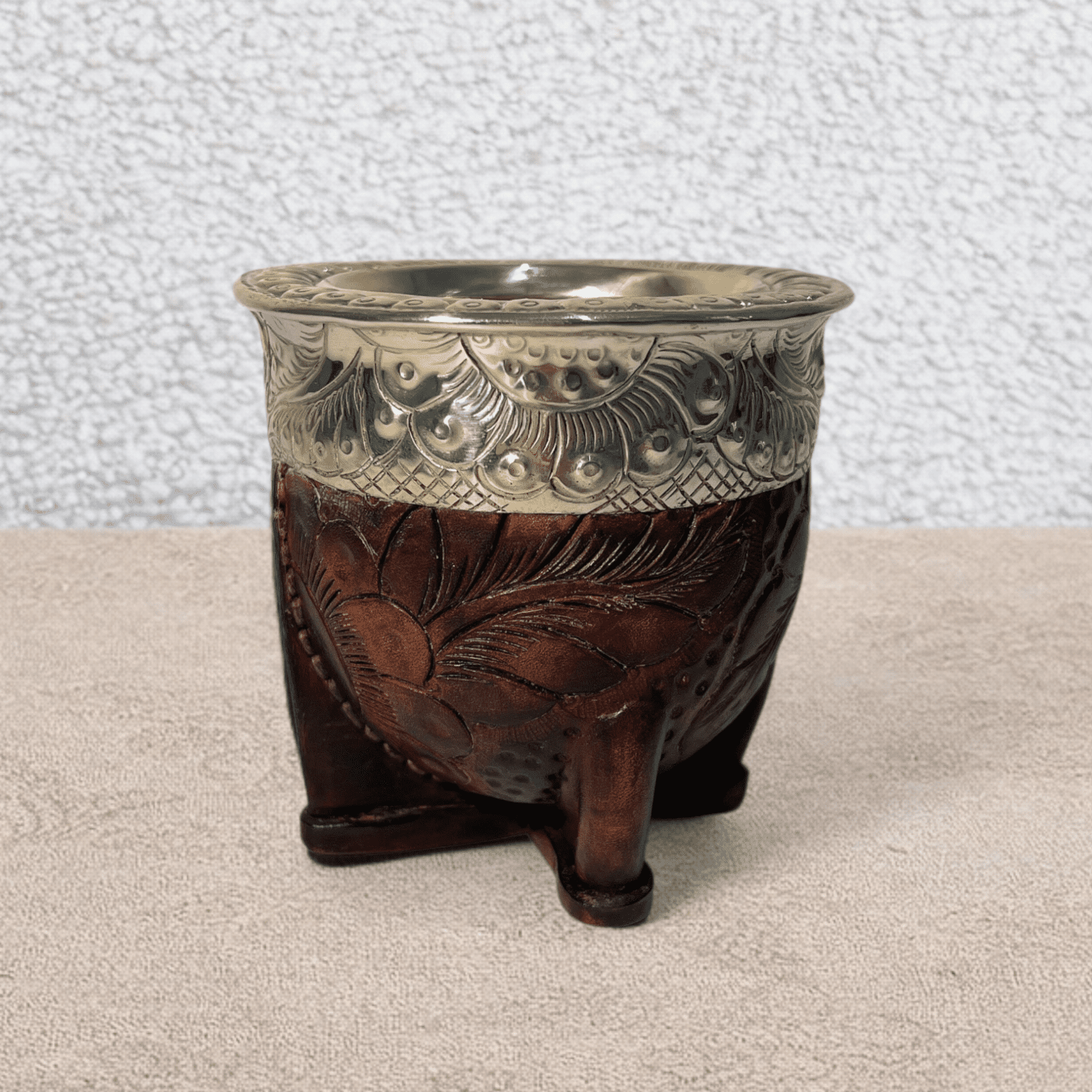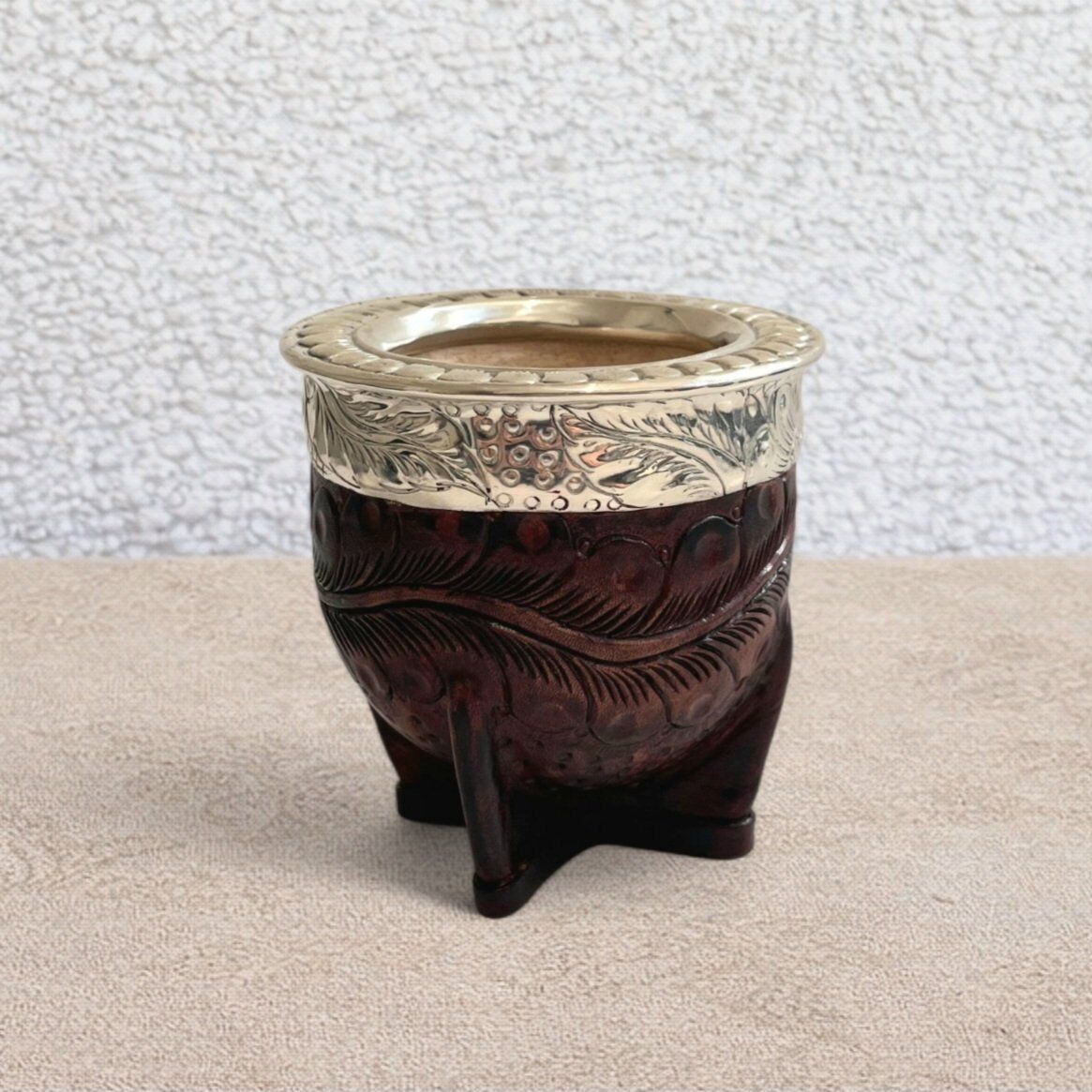 La calebasse à maté cuir gravé acajou est une pièce artisanale au fort caractère, pensée pour les amateurs de maté sensibles aux détails et au travail du cuir. Fabriquée à la main, elle associe la tradition du maté à une technique de décoration rare et exigeante.