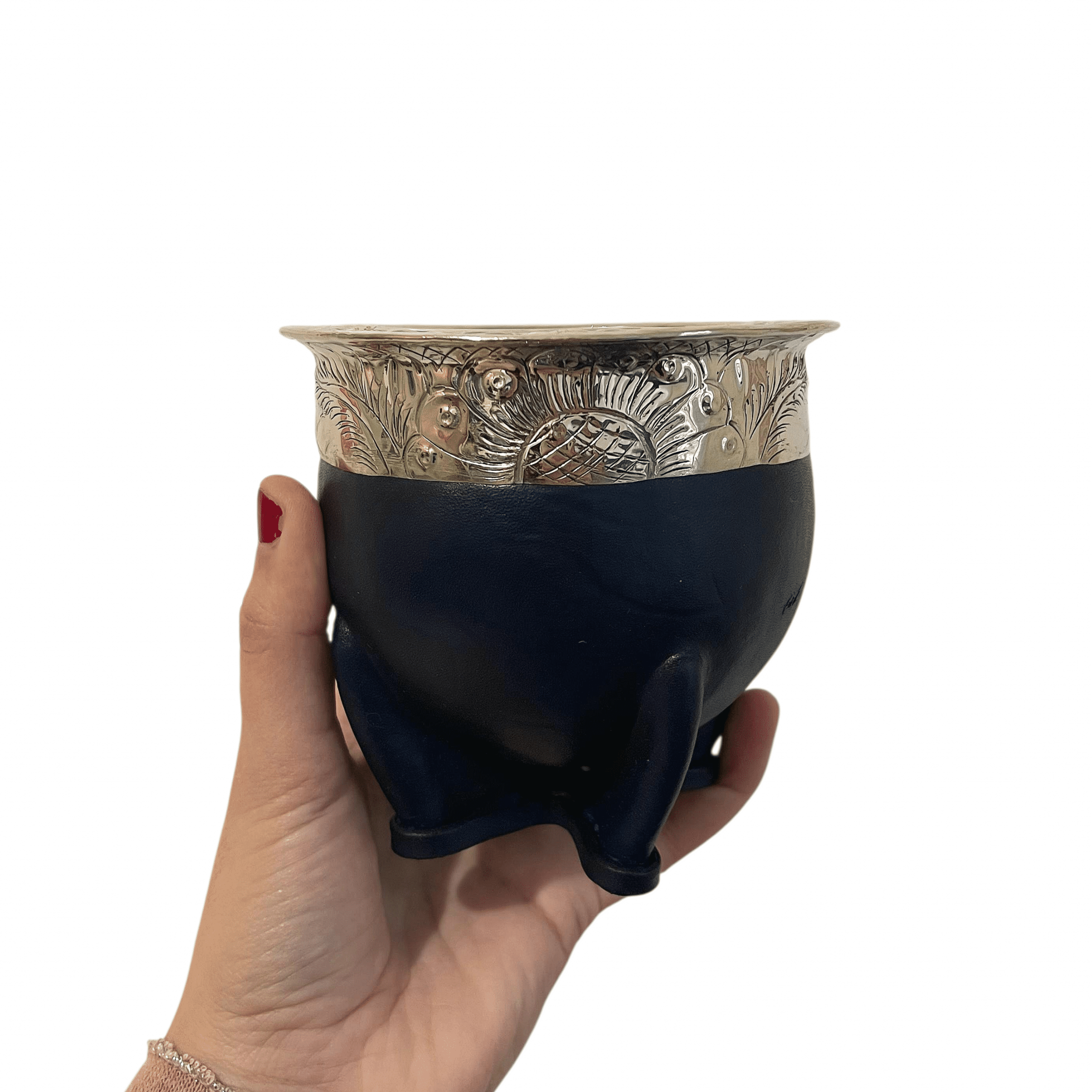 Elle est réalisée à partir d’une calebasse naturelle soigneusement sélectionnée, puis recouverte d’un cuir bleu haut de gamme au tannage végétal. Cette couleur profonde et distinctive offre une alternative moderne tout en conservant l’authenticité du maté traditionnel. La virola en alpaca vient compléter l’ensemble avec une finition sobre et harmonieuse.
