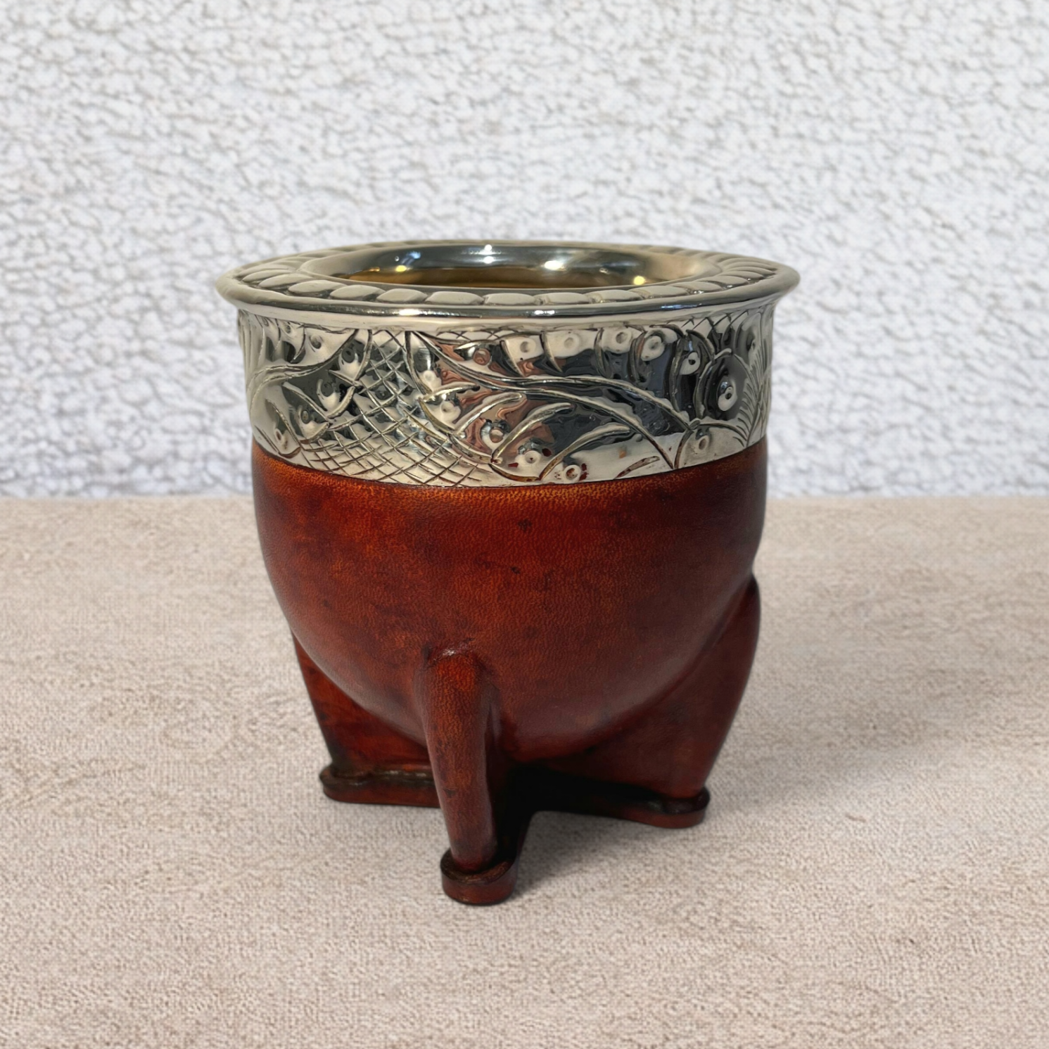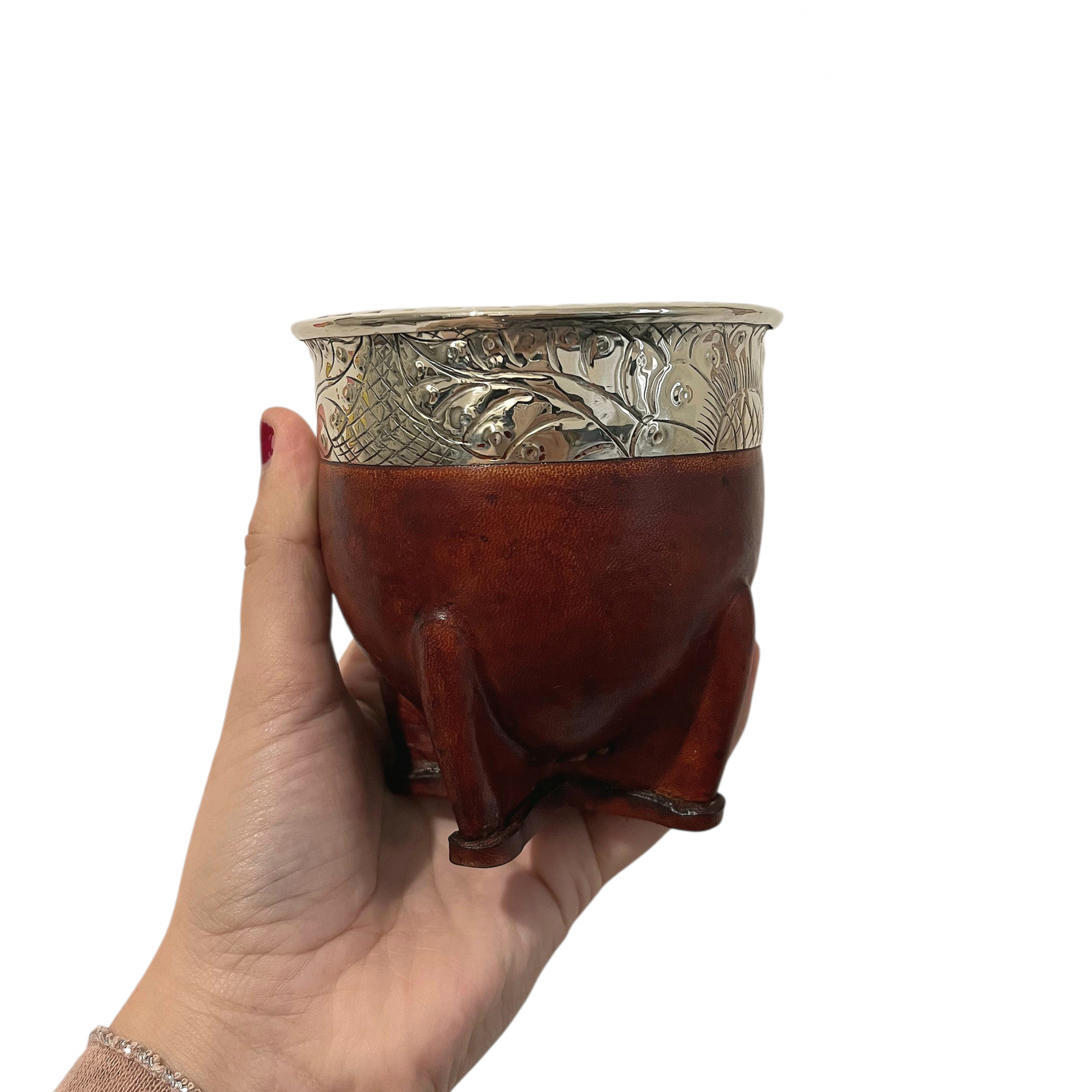 Elle est réalisée à partir d’une calebasse naturelle soigneusement sélectionnée, puis recouverte d’un cuir cognac haut de gamme au tannage végétal. Cette teinte chaleureuse apporte profondeur et élégance, tout en se patinant naturellement avec le temps. La virola en alpaca complète l’ensemble avec une finition sobre et authentique, fidèle à l’esprit du maté traditionnel.