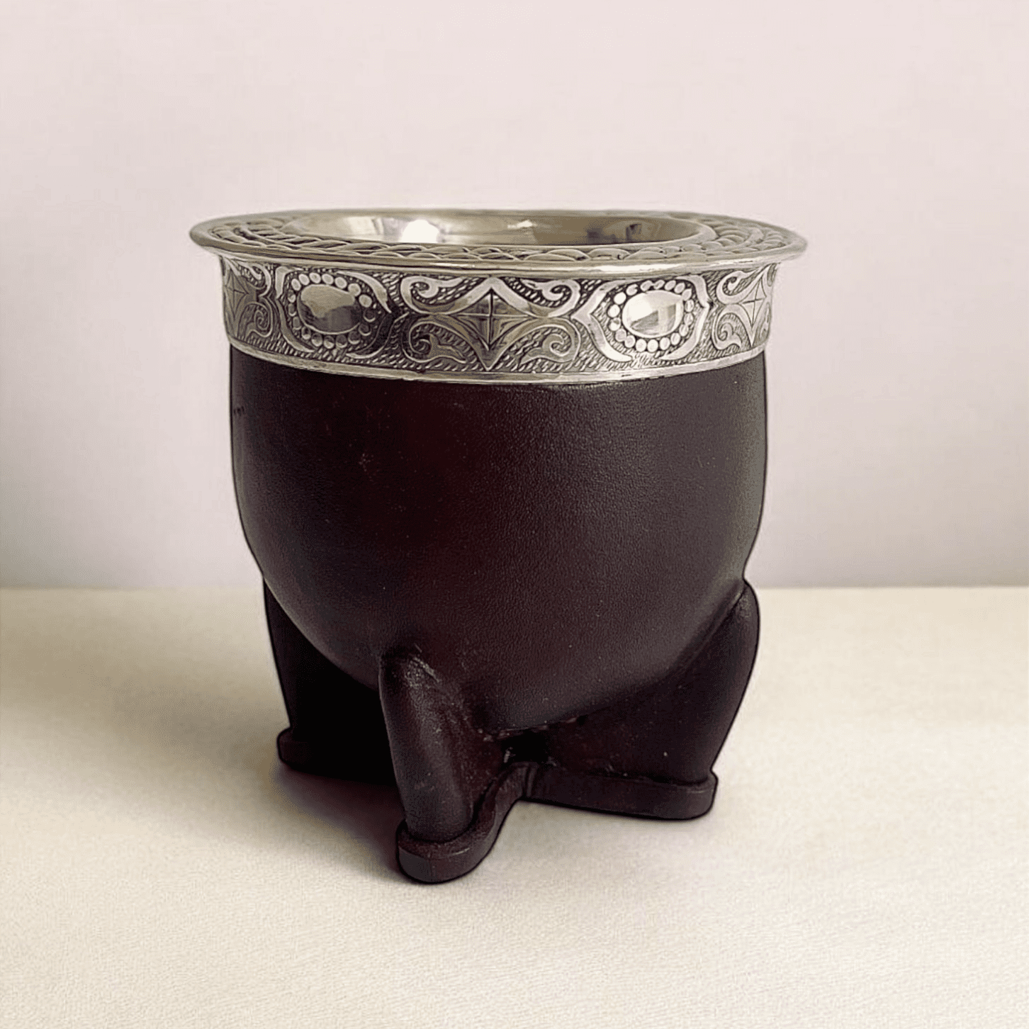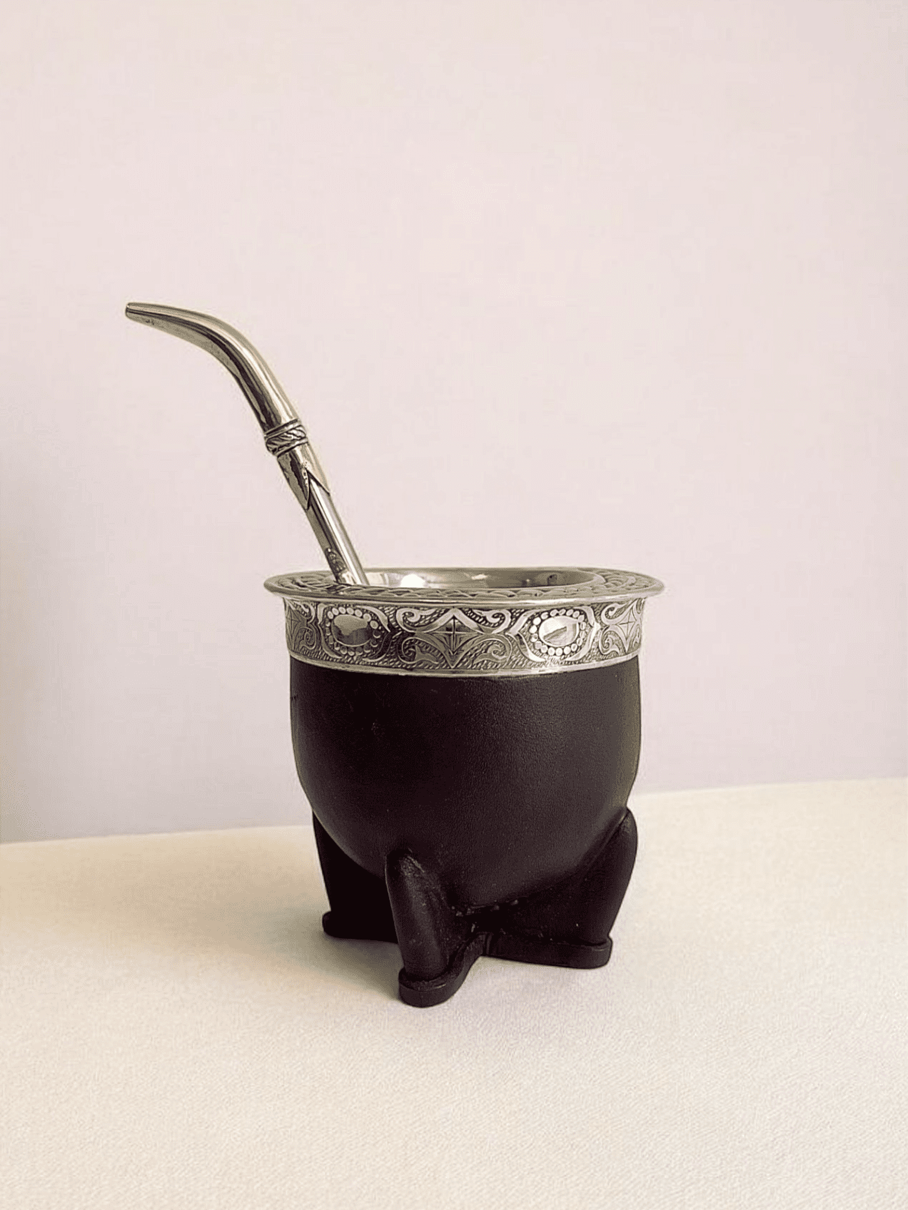 Ce modèle impérial se distingue par une calebasse extra épaisse d’origine brésilienne, recouverte de cuir de vachette marron, et renforcée d’une virola en alpaca finement gravée à la main. Chaque pièce est le fruit d’un travail minutieux réalisé par un artisan argentin, garantissant un objet aussi solide que raffiné.