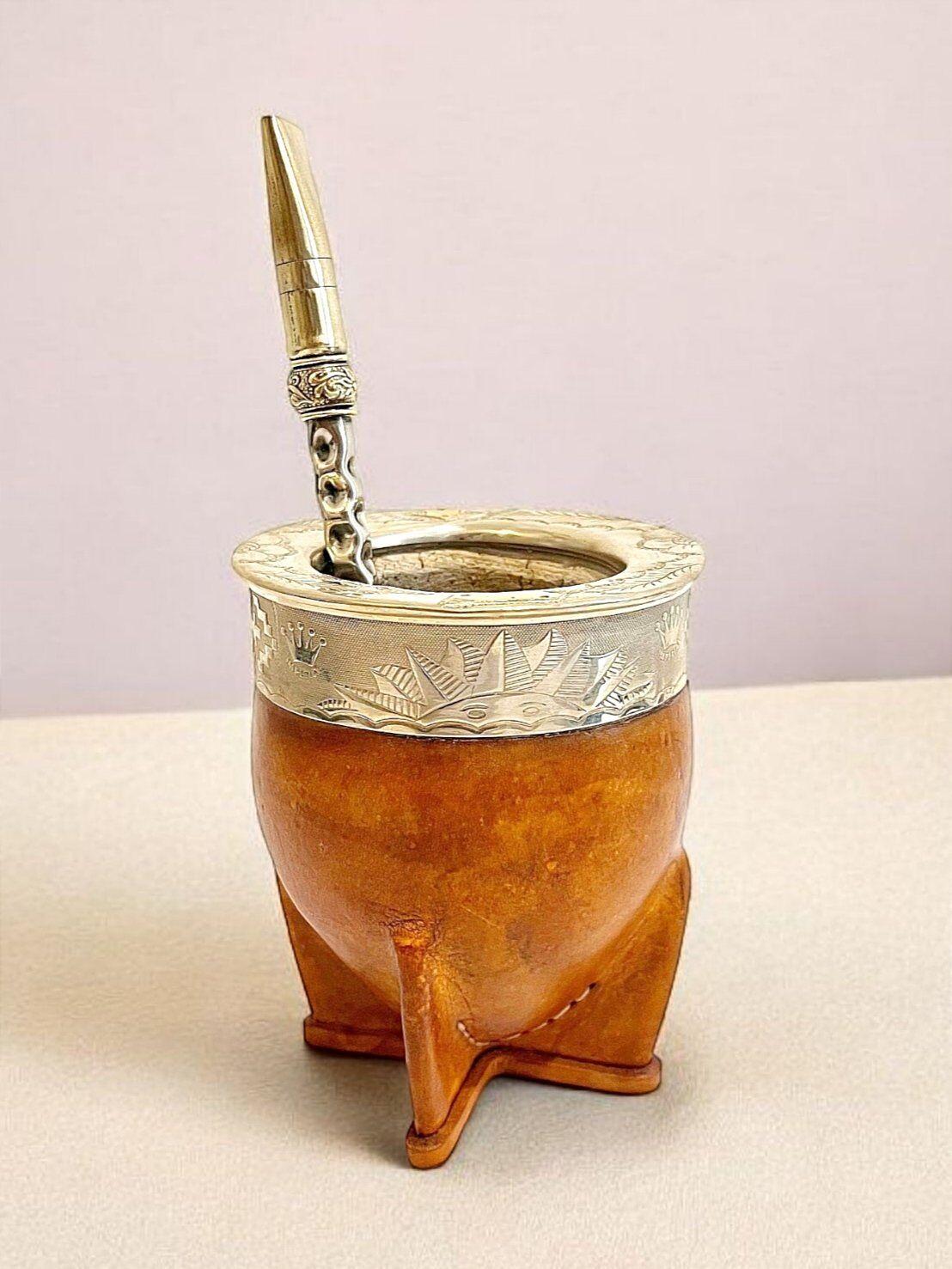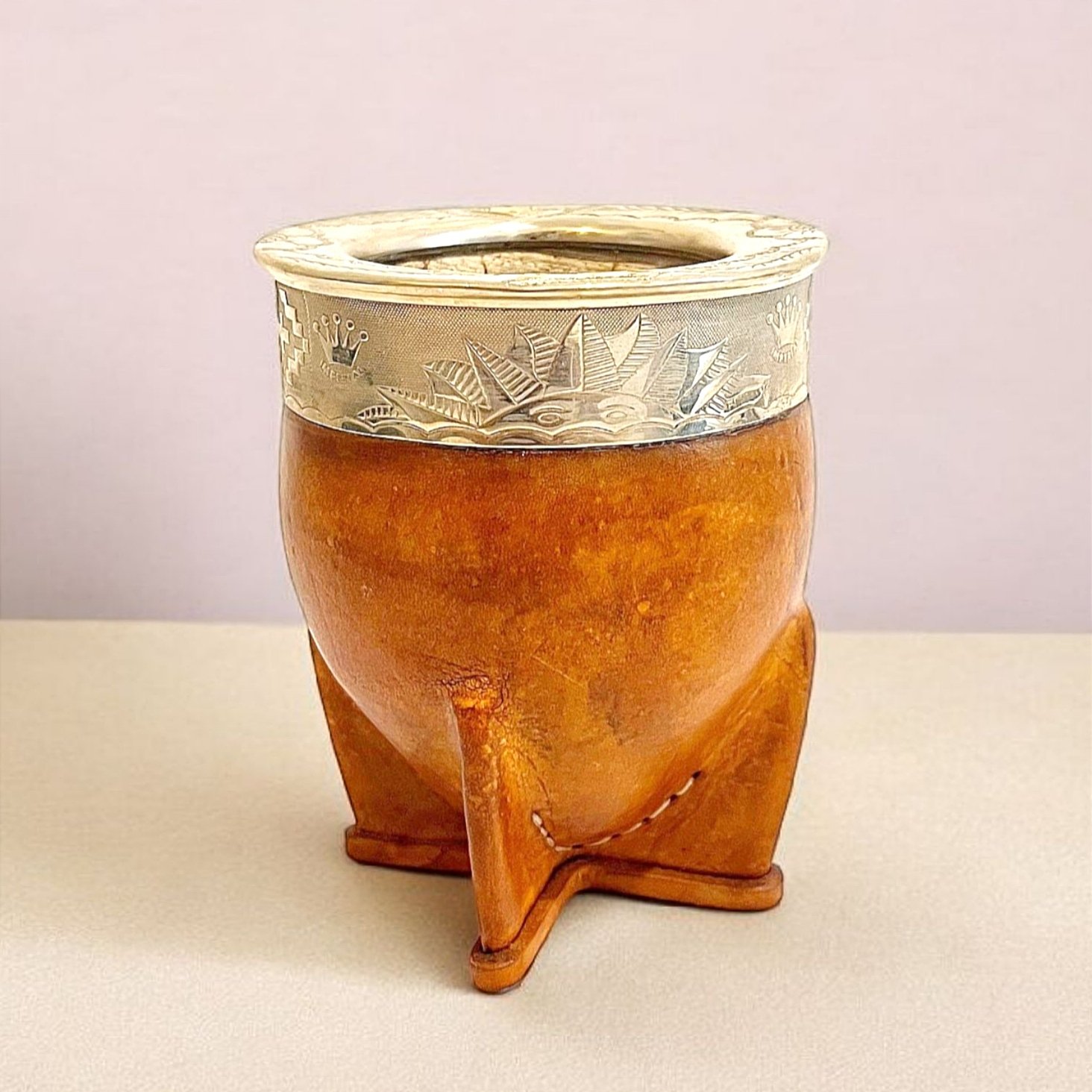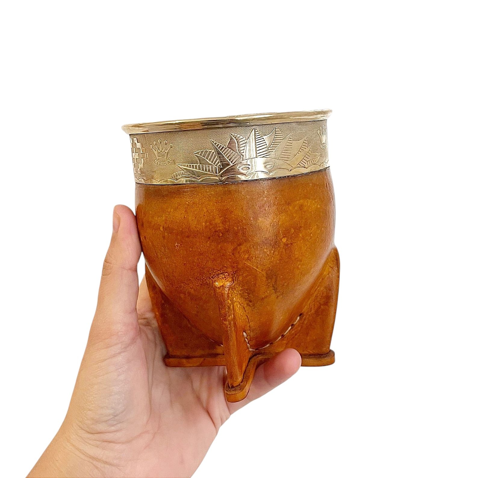 La calebasse à maté imperial camel – Prestige est une pièce élégante fabriquée à la main en Uruguay. Sa calebasse naturelle, soigneusement sélectionnée, est recouverte d’un cuir camel haut de gamme offrant une teinte douce et raffinée. La virola, finement gravée à la main et décorée d’incrustations en bronze, apporte une touche de prestige et de caractère unique à ce modèle.