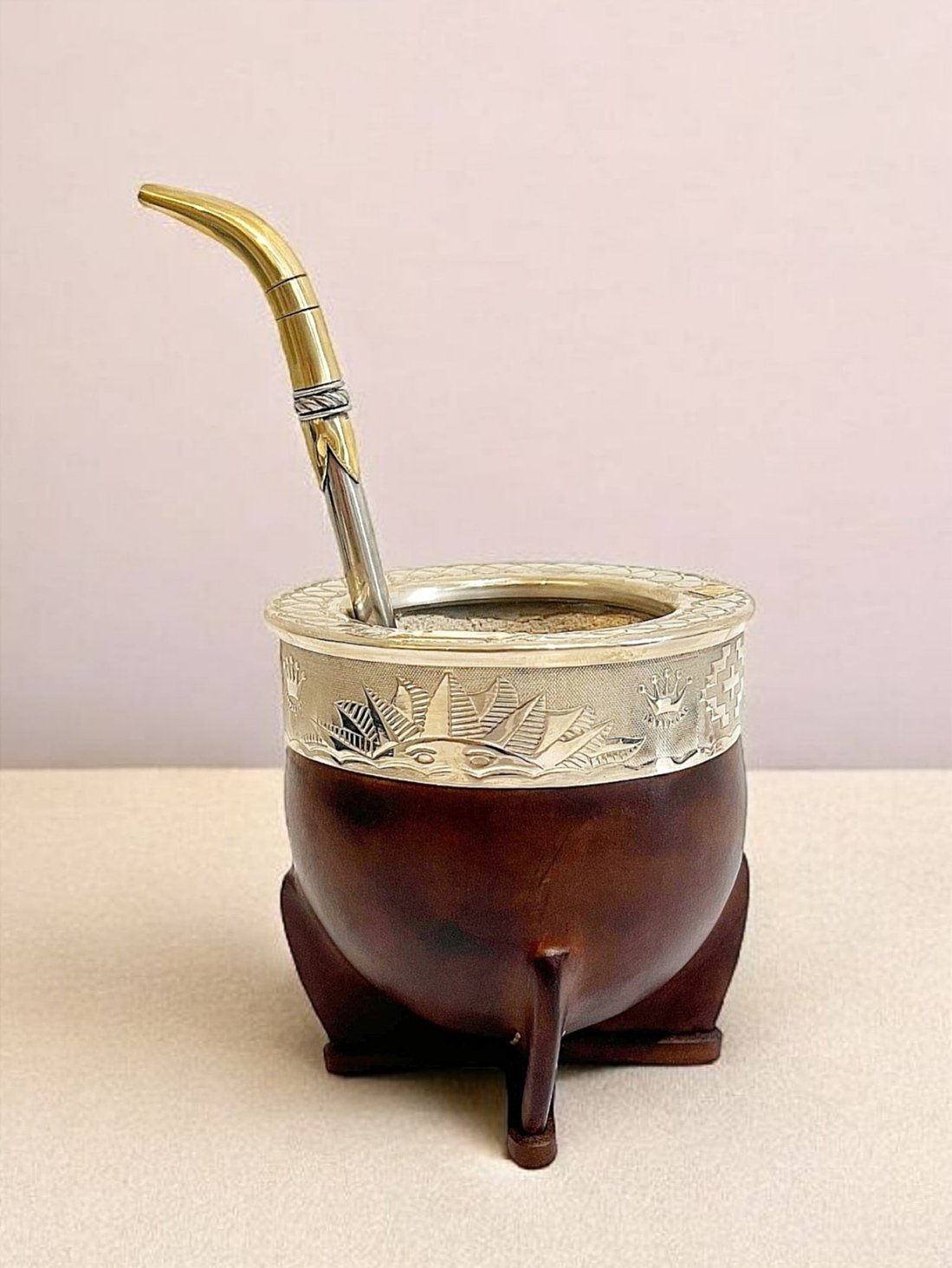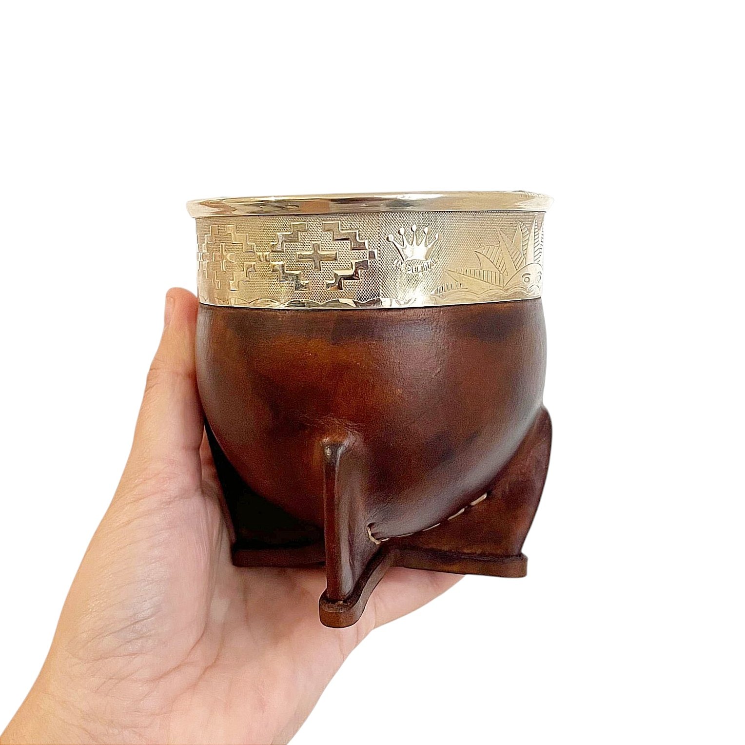 La calebasse à maté imperial marron – Prestige est une superbe pièce fabriquée à la main en Uruguay. Réalisée avec une calebasse naturelle soigneusement sélectionnée, elle est recouverte d’un cuir marron haut de gamme qui lui confère élégance et authenticité. Sa virola, finement gravée à la main et ornée de détails en bronze, apporte une touche de distinction propre aux modèles de prestige.