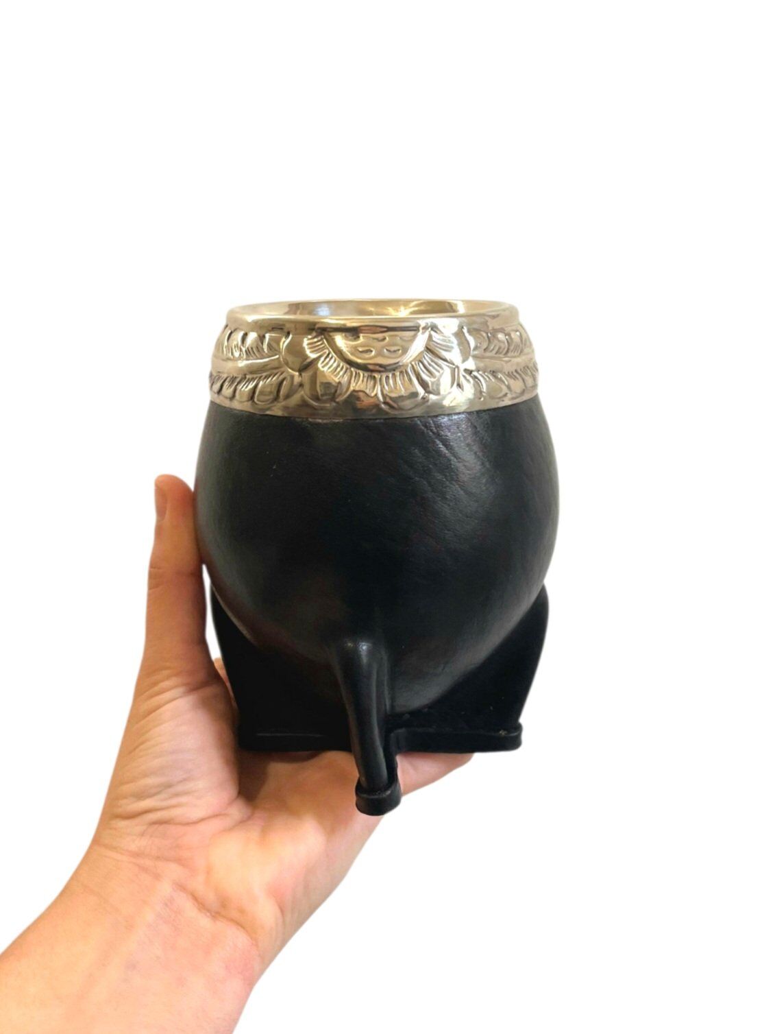 La calebasse, d’origine brésilienne, est soigneusement sélectionnée pour sa qualité. Elle est recouverte d’un cuir noir pleine fleur au tannage végétal, offrant une finition sobre, élégante et intemporelle. La virola en alpaca, finement gravée à la main, apporte une touche artisanale raffinée et confère à chaque pièce un caractère unique.