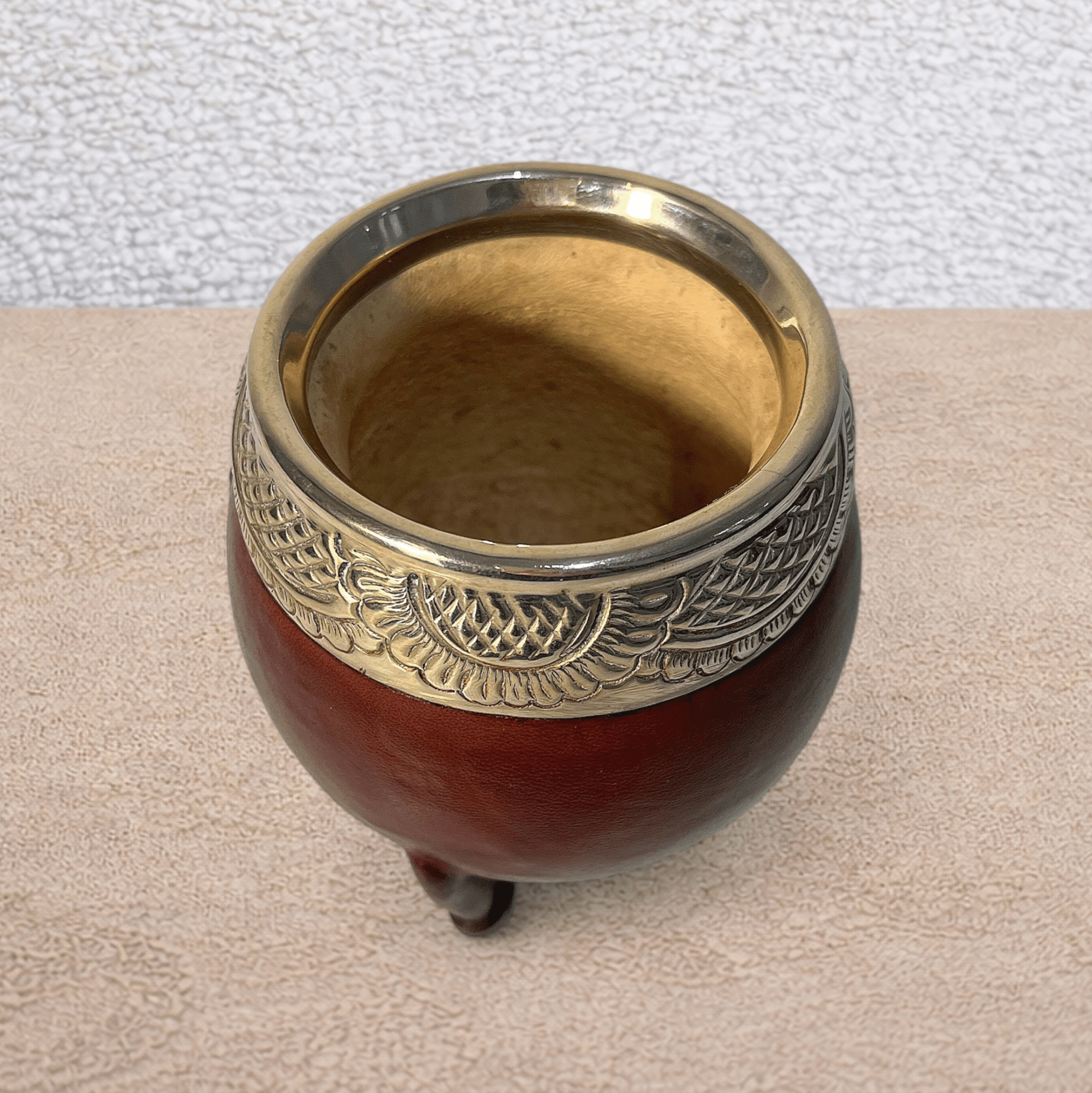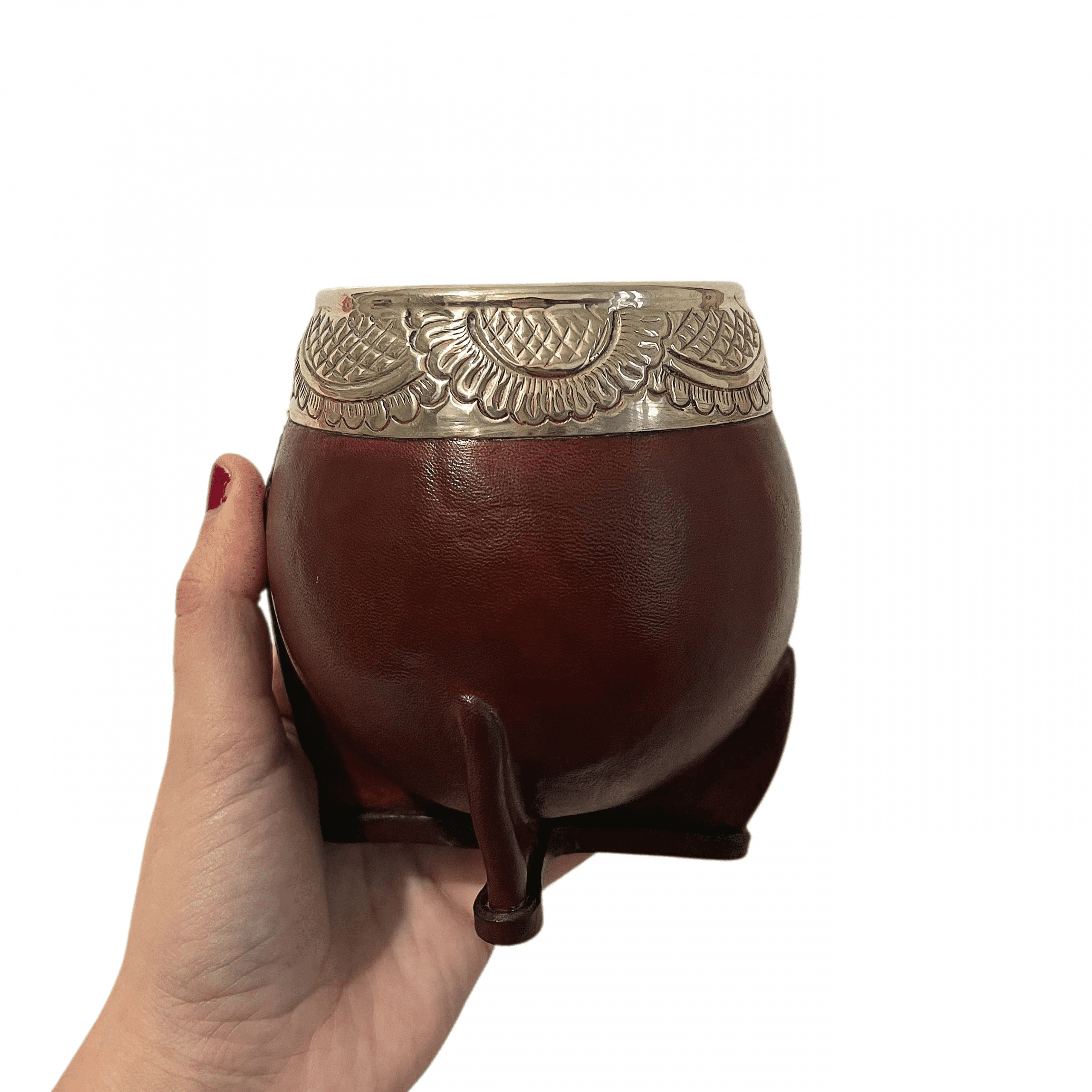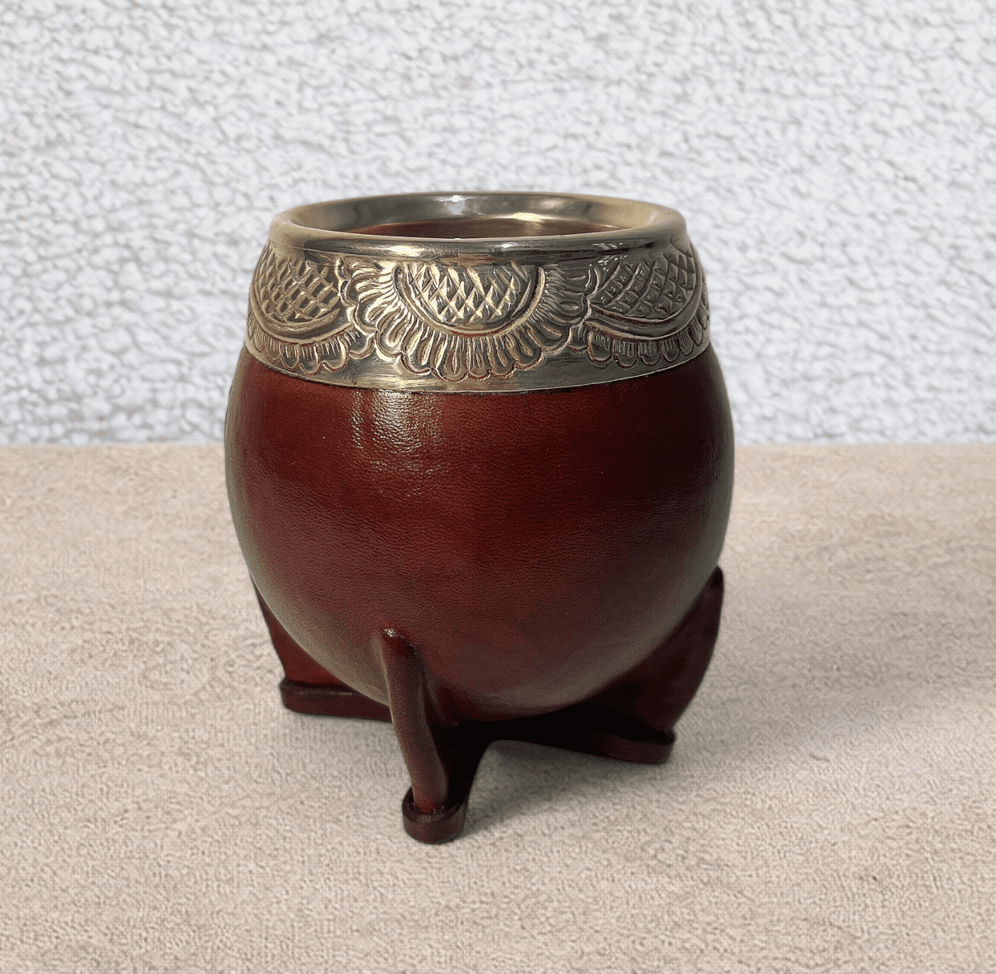 Elle est réalisée à partir d’une calebasse naturelle d’origine brésilienne, sélectionnée pour sa résistance et sa forme. Son revêtement en cuir pleine fleur couleur noisette, issu d’un tannage végétal, offre un rendu naturel et élégant, tandis que la virola en alpaca gravée à la main vient souligner le caractère artisanal et unique de chaque modèle.