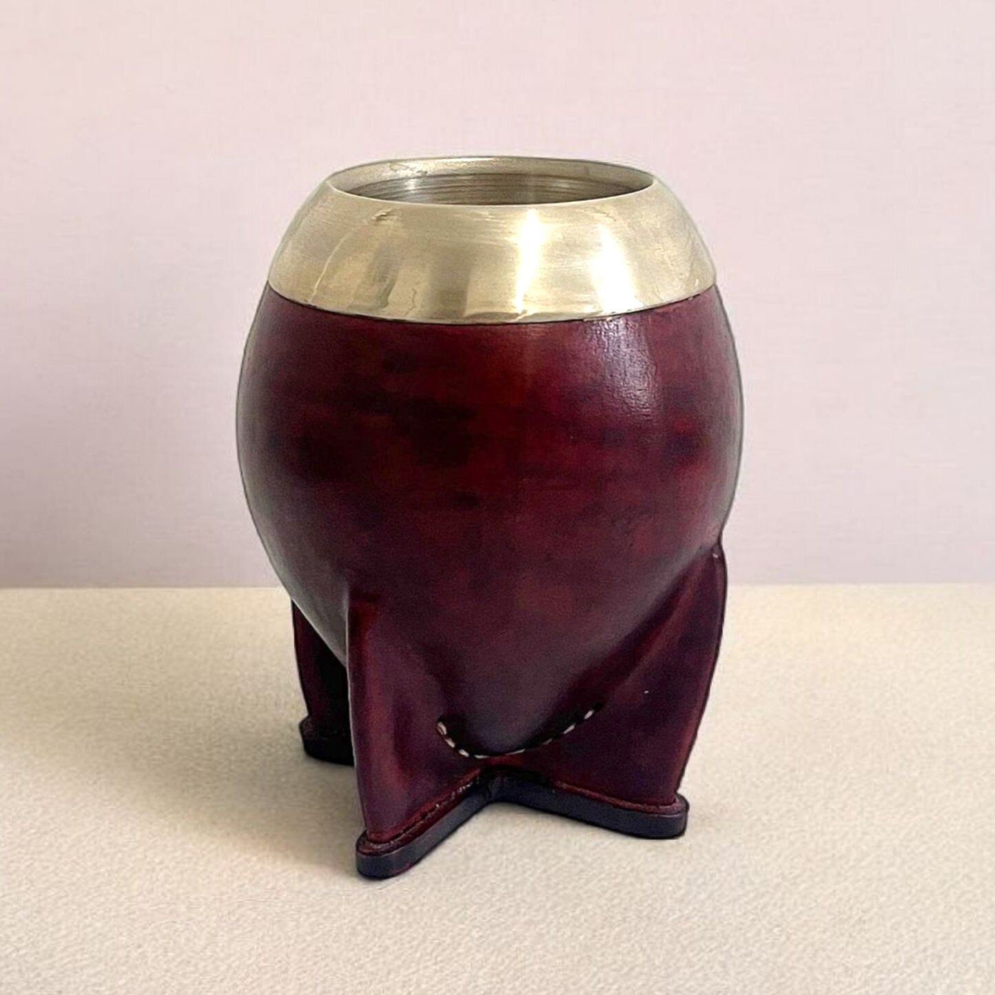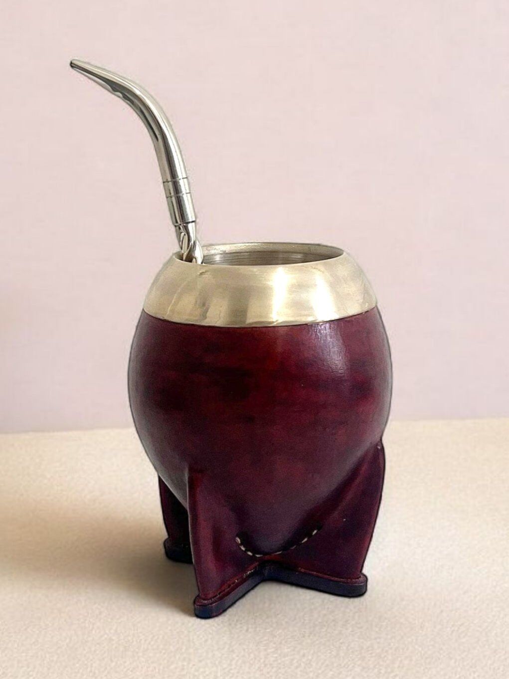 Recouverte de cuir bordeaux de haute qualité, elle séduit par sa teinte profonde et chaleureuse. Sa virola lisse en alpaca apporte une touche de brillance et d’élégance, caractéristique des calebasses haut de gamme uruguayennes. Chaque pièce est réalisée avec soin, ce qui en fait un modèle à la fois pratique et raffiné.