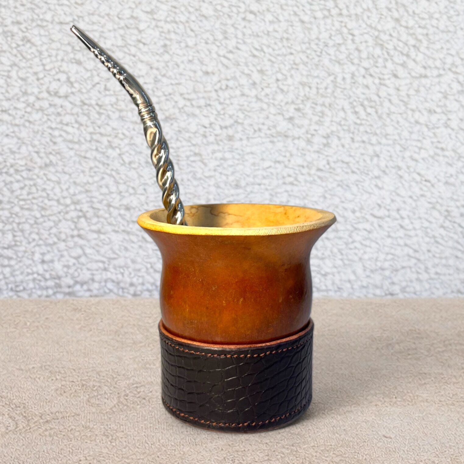 La calebasse à maté criollo camionero croco marron est un modèle artisanal alliant tradition et matières nobles. Fabriquée à la main, elle se compose d’une calebasse naturelle d’origine brésilienne soigneusement sélectionnée, habillée d’un véritable cuir croco à la texture marquée et au caractère unique.