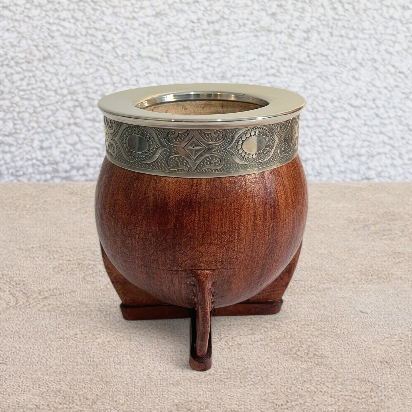 Cette calebasse à maté impérial personnalisée est un maté artisanal, fabriqué à partir de calebasses naturelles sélectionnées et habillé de cuir. Elle est équipée d’une virola lisse, en alpaca ou en acier inoxydable, adaptée à la gravure laser.
