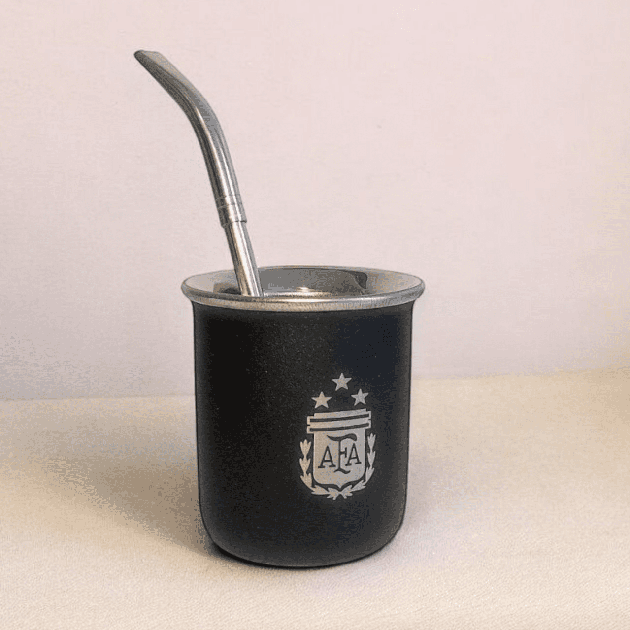 Le Maté + Bombilla inox droit Coupe du Monde est un ensemble pratique et décoratif pour les amateurs de maté et de football. La calebasse en acier inoxydable, légère et sans revêtement en cuir, permet une consommation maîtrisée de yerba, idéale pour des sessions rapides ou pour débuter.