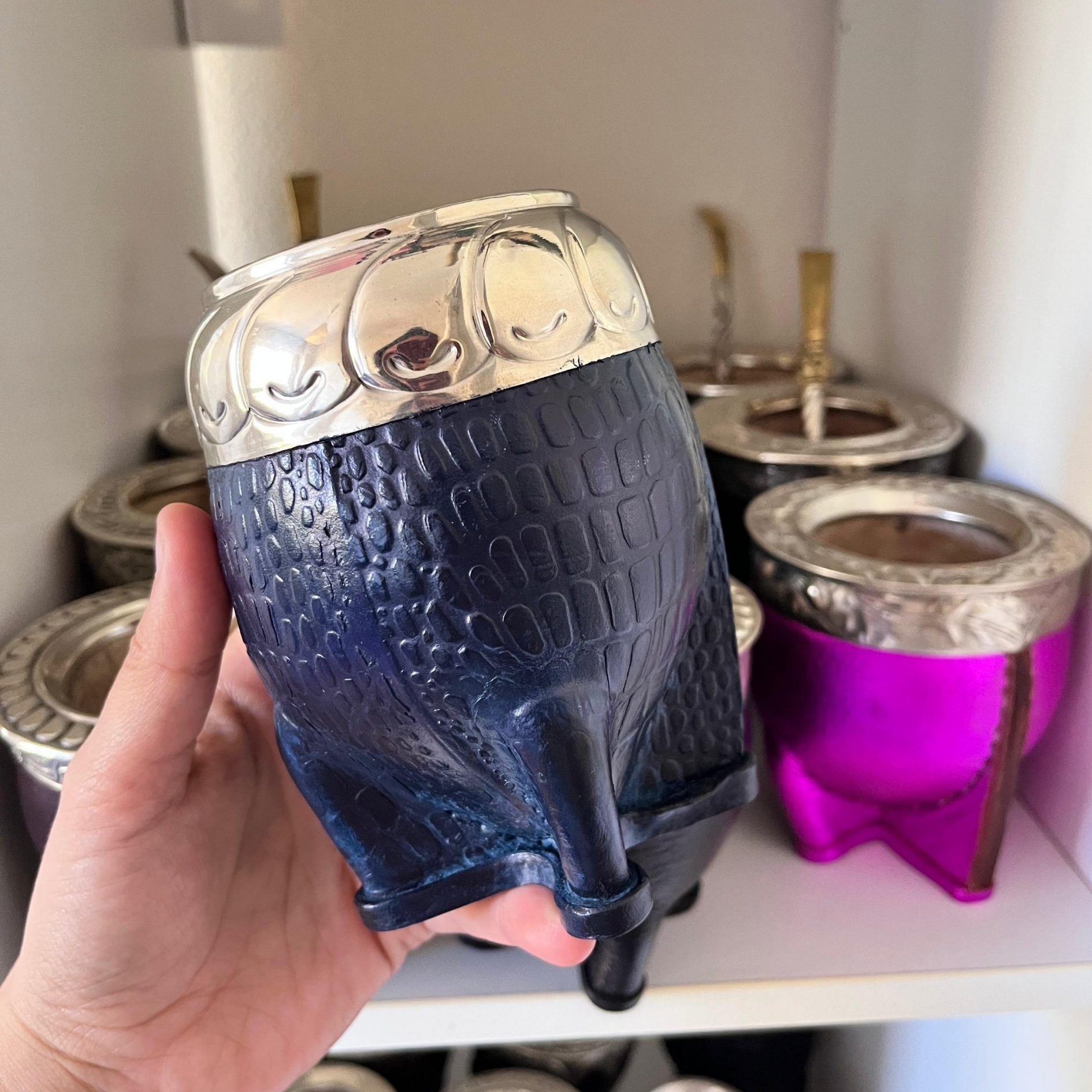 Ce maté torpedo artisanal allie élégance et tradition avec son cuir bleu style croco, travaillé à la main par des artisans expérimentés en Argentine.