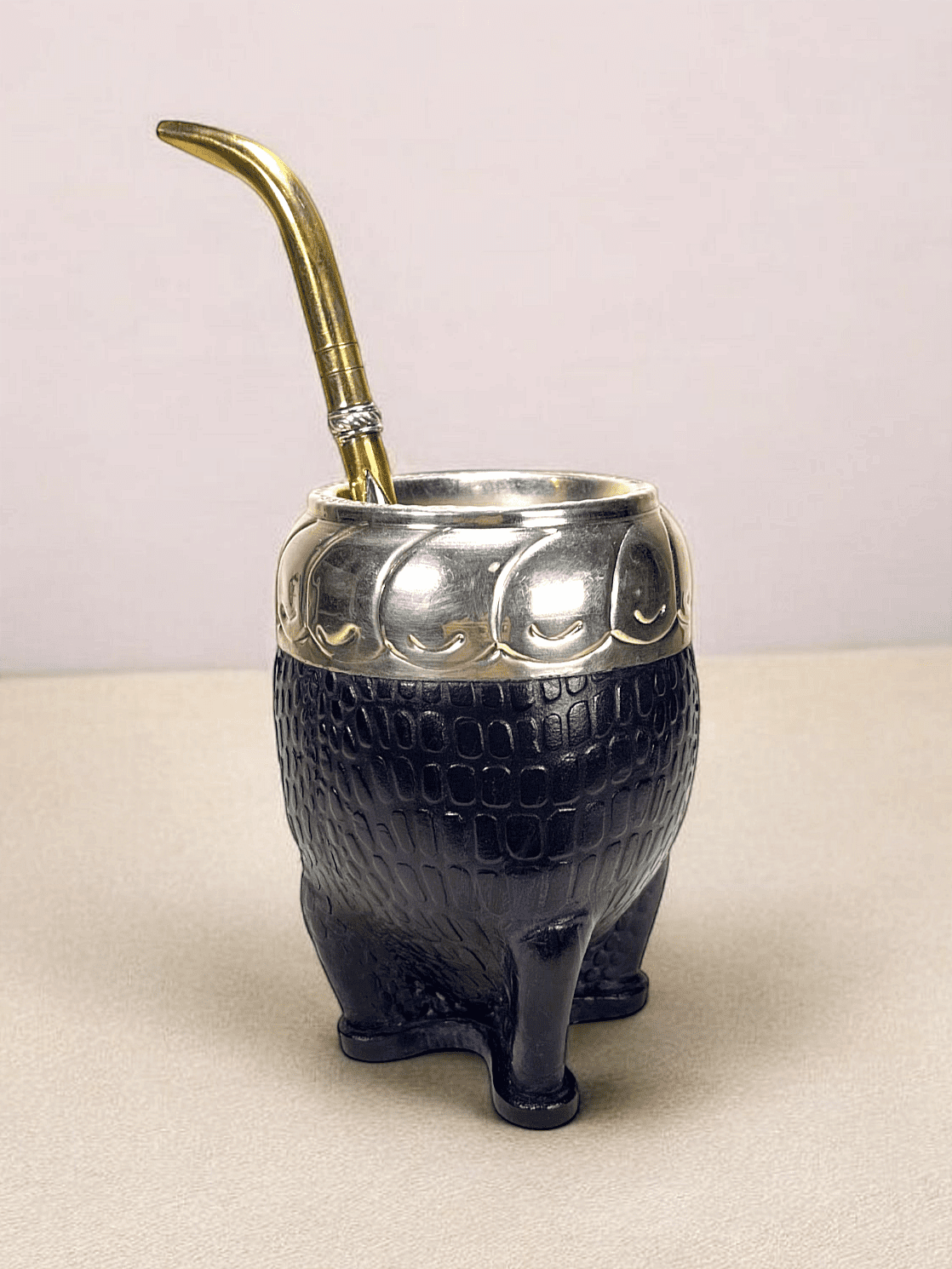 Fabriqué à partir d’une calebasse premium d’origine brésilienne, il est enveloppé dans un cuir texturé qui offre une esthétique sophistiquée et unique. La virola en Alpaca gravée à la main renforce son caractère haut de gamme, tout en respectant les traditions de l’artisanat gaucho.