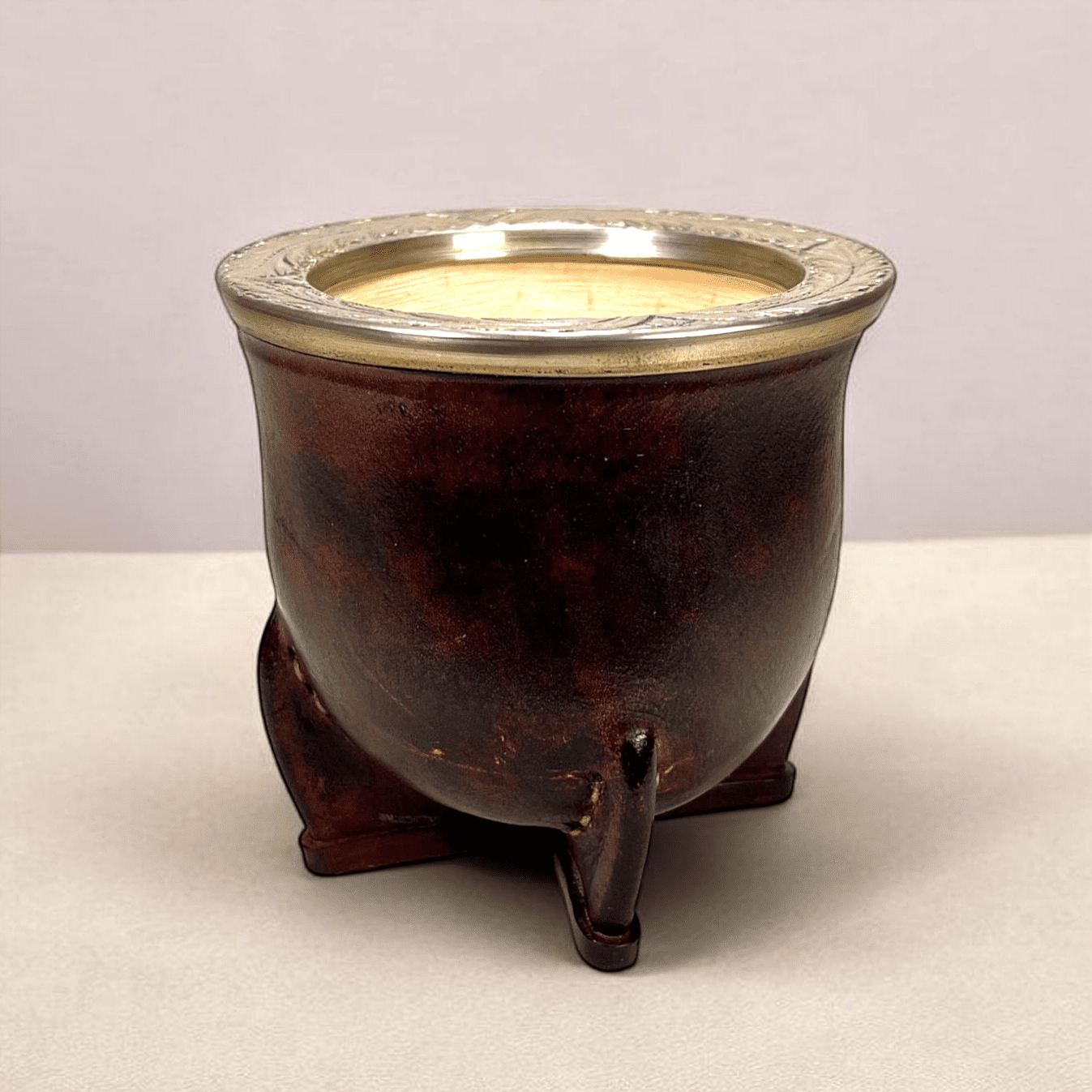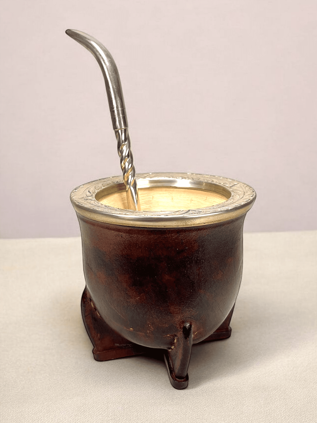 Fabriqué à base d’une calebasse extra épaisse d’origine Brésilienne il est ensuite recouvert d’un cuir de première qualité marron. Vous apprécierez sa virola en alpaca finement gravée à la main de motifs Gaucho.