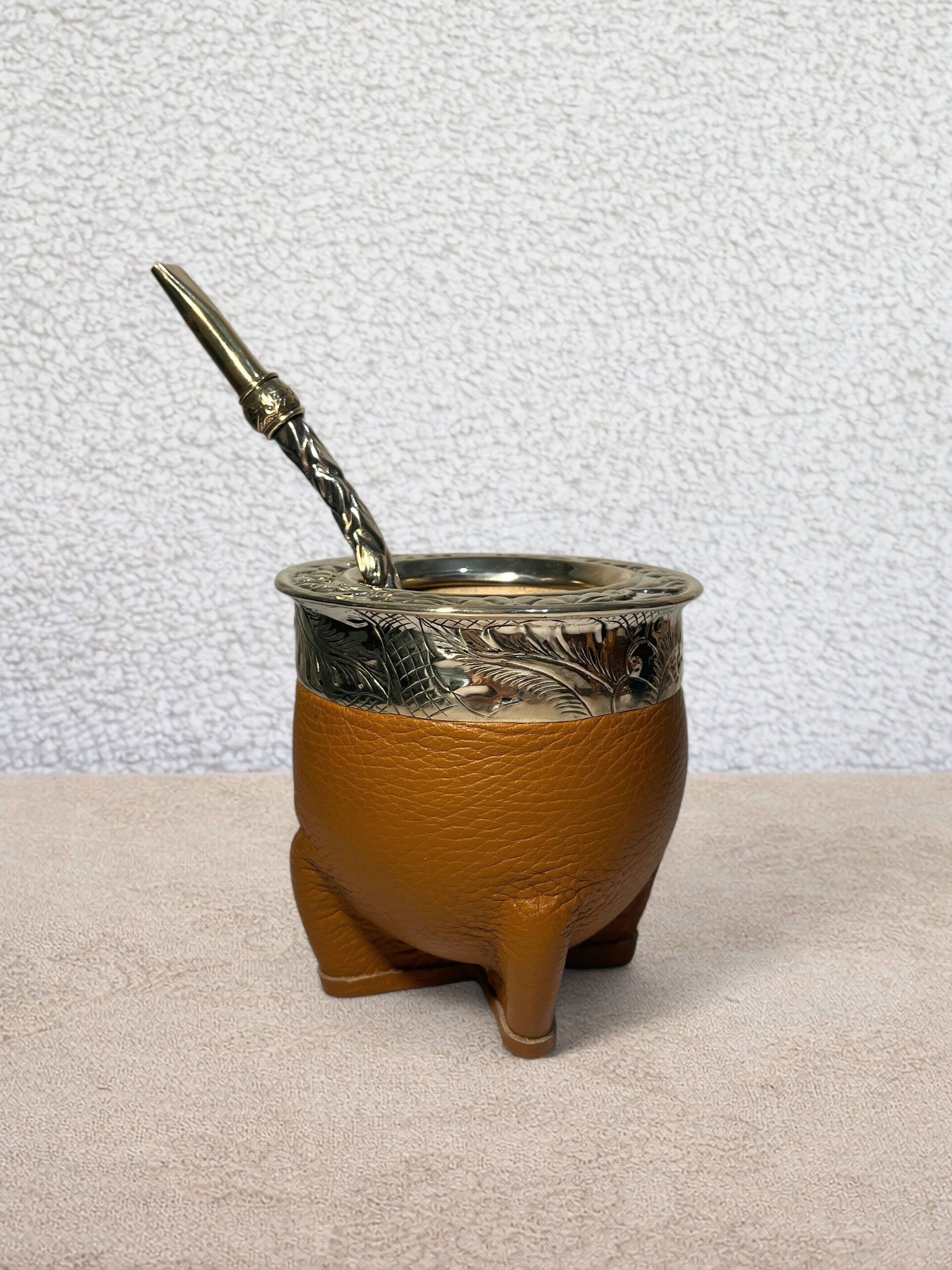 Ce modèle se distingue par son double revêtement en cuir beige, composé de deux couches superposées qui lui confèrent une finition soignée et moderne. Ce travail du cuir apporte du relief et une esthétique raffinée, tout en mettant en valeur la silhouette de la calebasse. La virola en alpaca vient compléter l’ensemble avec une touche traditionnelle, créant un équilibre harmonieux entre modernité et héritage.